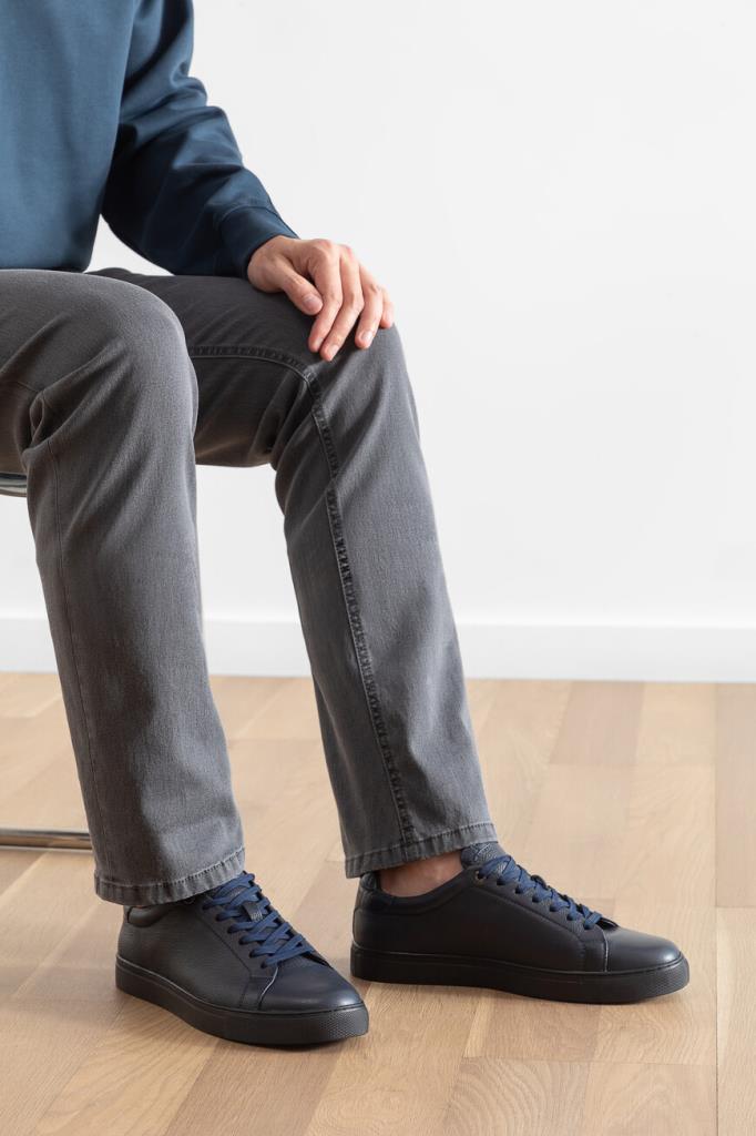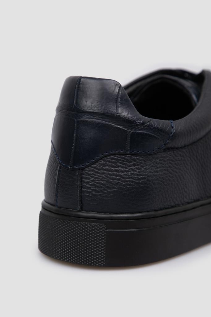 Тёмно-синие кеды из мягкой зернистой кожи телёнка от FARGONI. Мягкий фактурный материал устойчив к появлению потёртостей и царапин, поэтому изделие прослужит долго. Декором выступают вставки из экзотической кожи крокодила на язычке и заднике в тон.