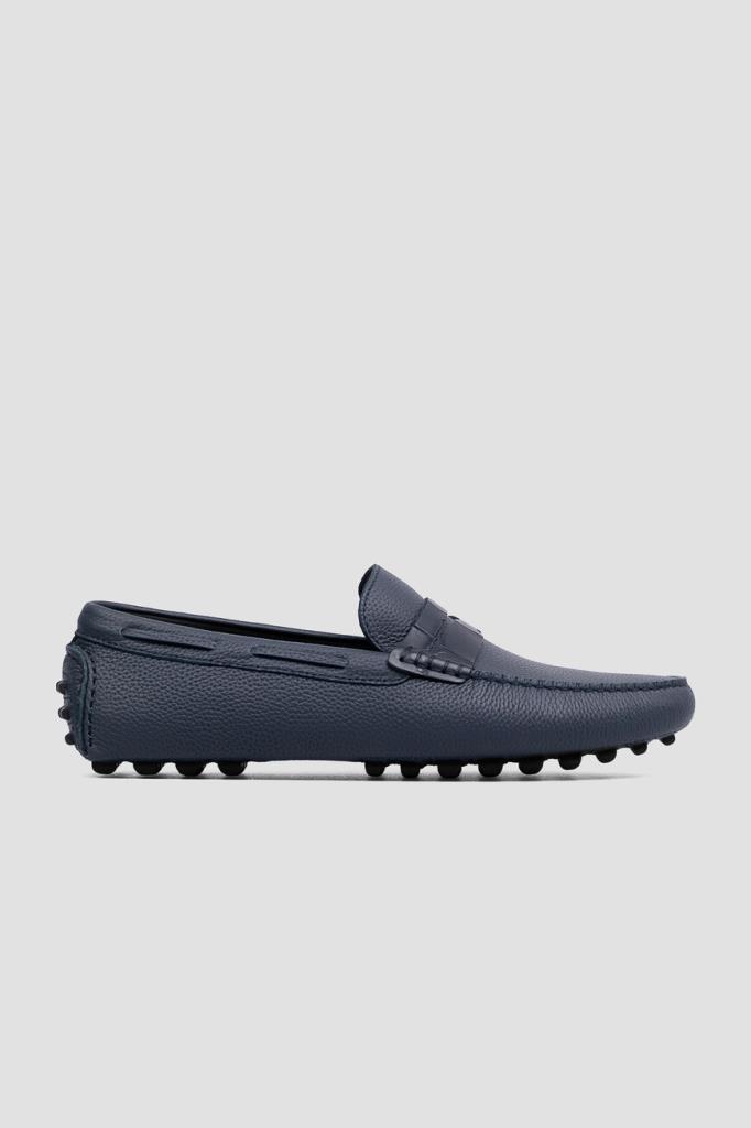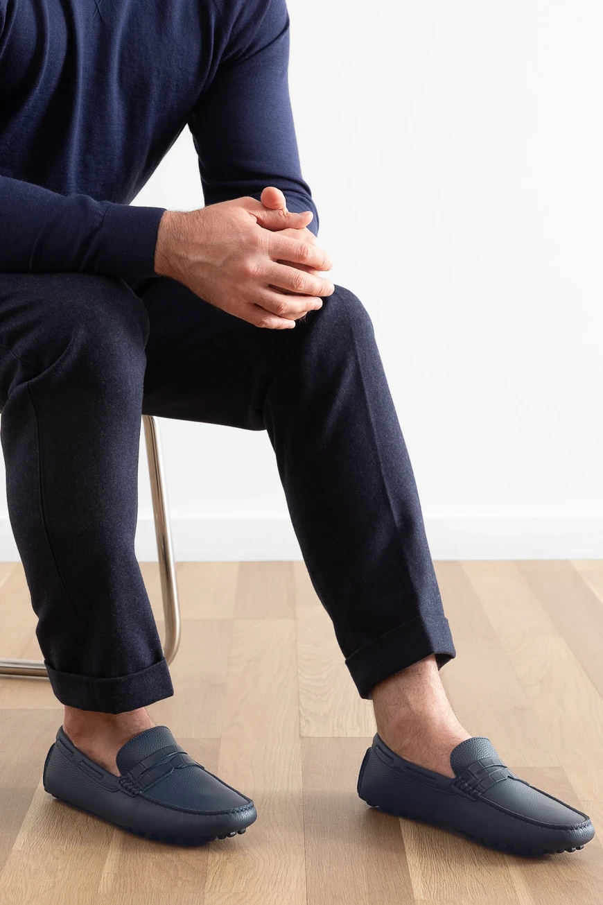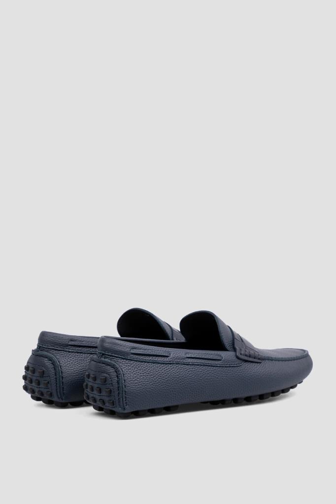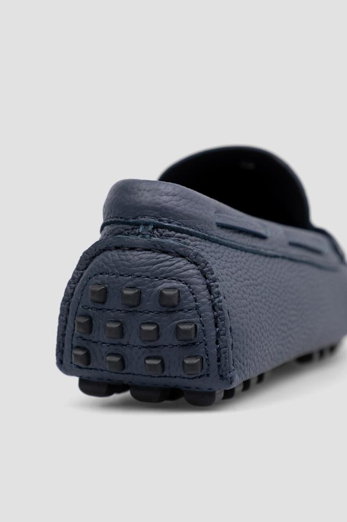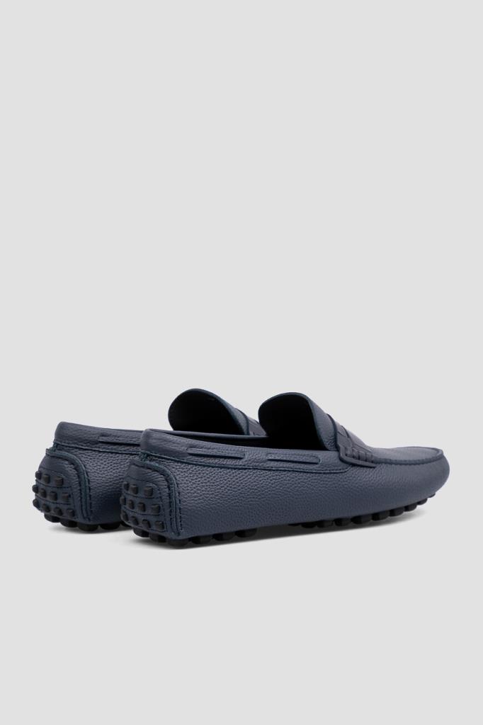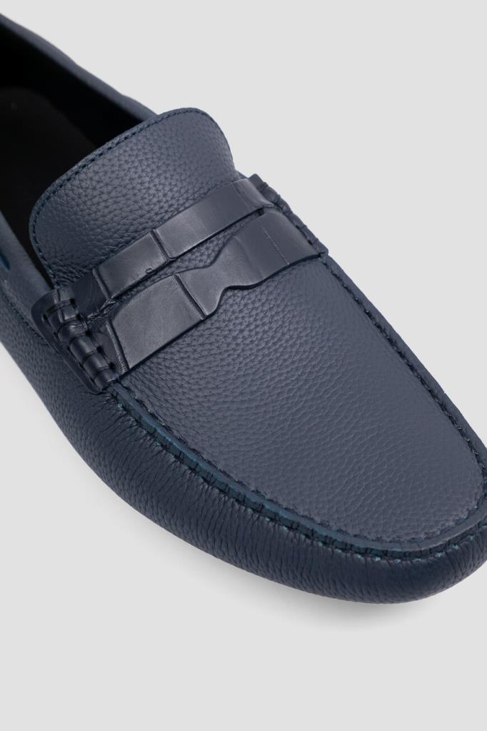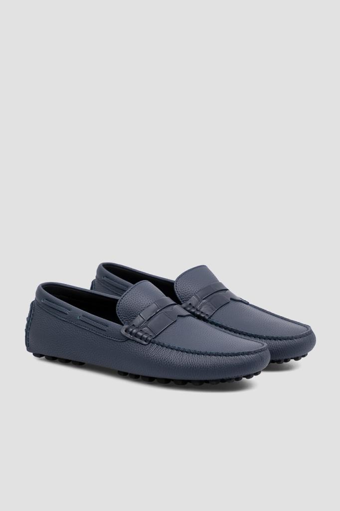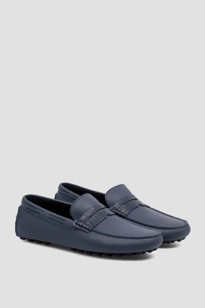 Тёмно-синие мокасины FARGONI с укреплённым задником. Для создания модели с округлым миндалевидным носком используется зернистая телячья кожа, устойчивая к появлению потёртостей и царапин. Декором выступают классический поперечный ремешок с прорезью, выполненный из мягкой фактурной кожи крокодила в тон, и полоса с продетым сквозь неё декоративным кожаным шнуром в верхней части пары (кант).