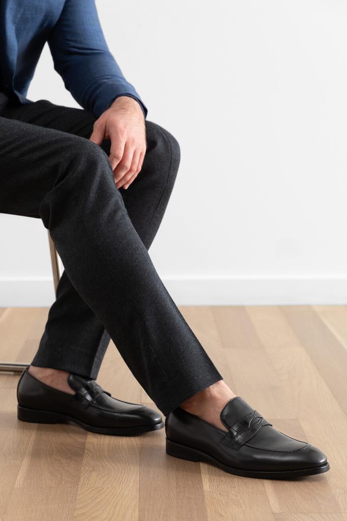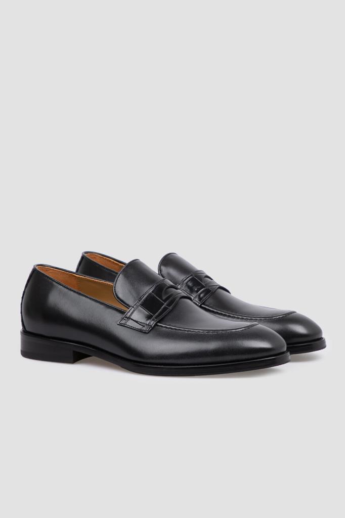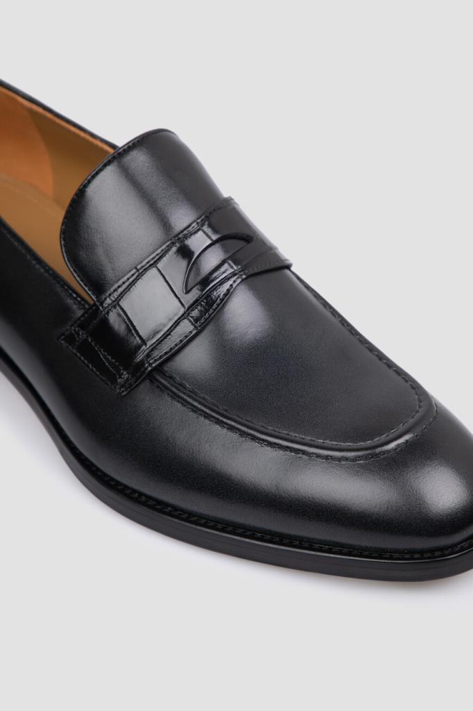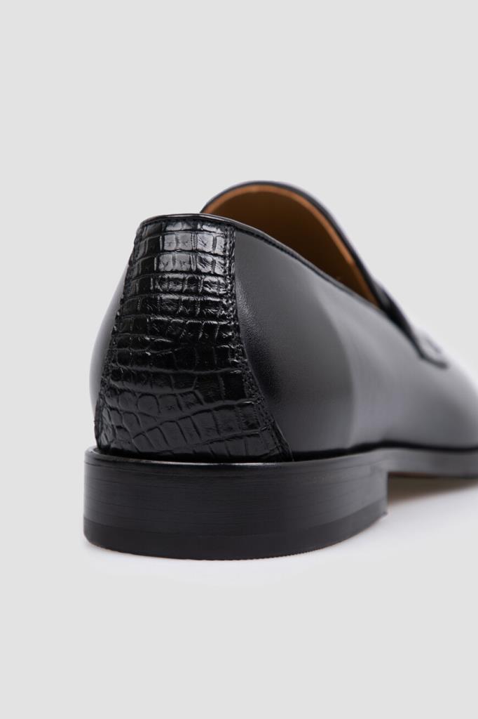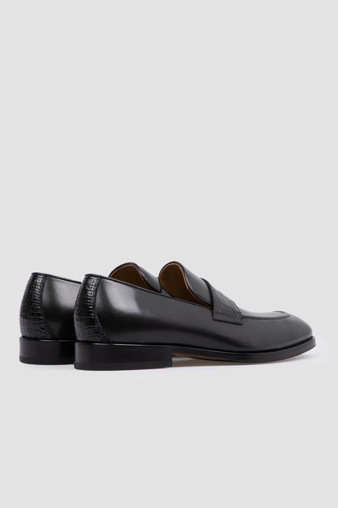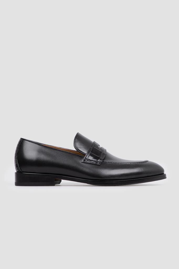 Лоферы из гладкой телячьей кожи чёрного цвета от FARGONI. Мягкий материал отполировали вручную до полуглянцевого блеска. Передняя и задняя стороны изделия декорированы вставками из фактурной кожи крокодила с уникальным природным узором. На мыске присутствует классический поперечный ремешок с прорезью в тон.