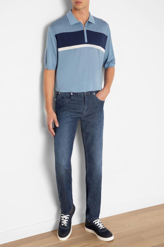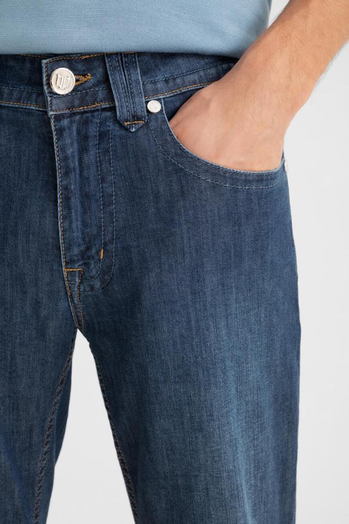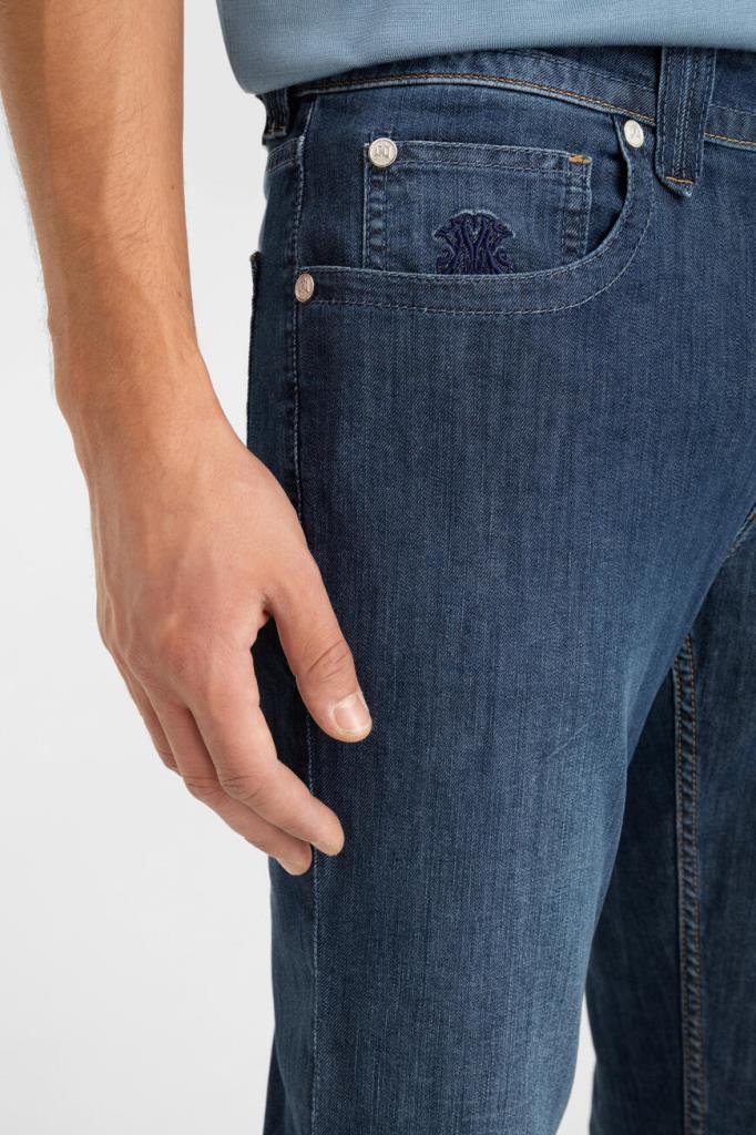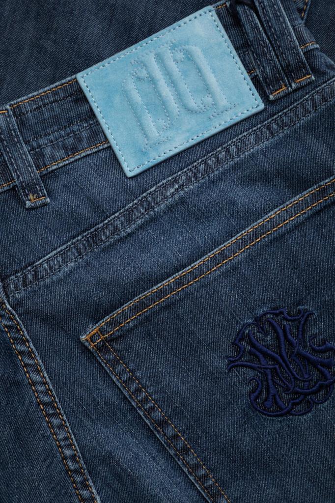 Джинсы прямого кроя от JOHNY MANGLANI. Изделие сшито из эластичного хлопкового денима синего цвета с дизайнерскими потёртостями. Декор: светло-голубая нашивка с рельефным логотипом на поясе сзади и вышитая тёмно-синяя символика бренда на маленьком кармане спереди и заднем кармане.