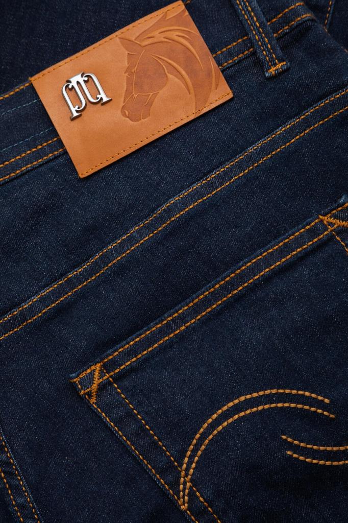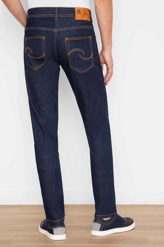 Тёмно-синие джинсы JOHNY MANGLANI с оранжевой прострочкой. Модель изготовлена из эластичного денима на основе хлопка и полиэфира. Декор: оранжевая нашивка с изображением головы лошади и серебристым металлическим логотипом на поясе сзади, вышитая оранжевая символика бренда на маленьком кармане спереди и вышитый узор оранжевого оттенка на задних карманах.