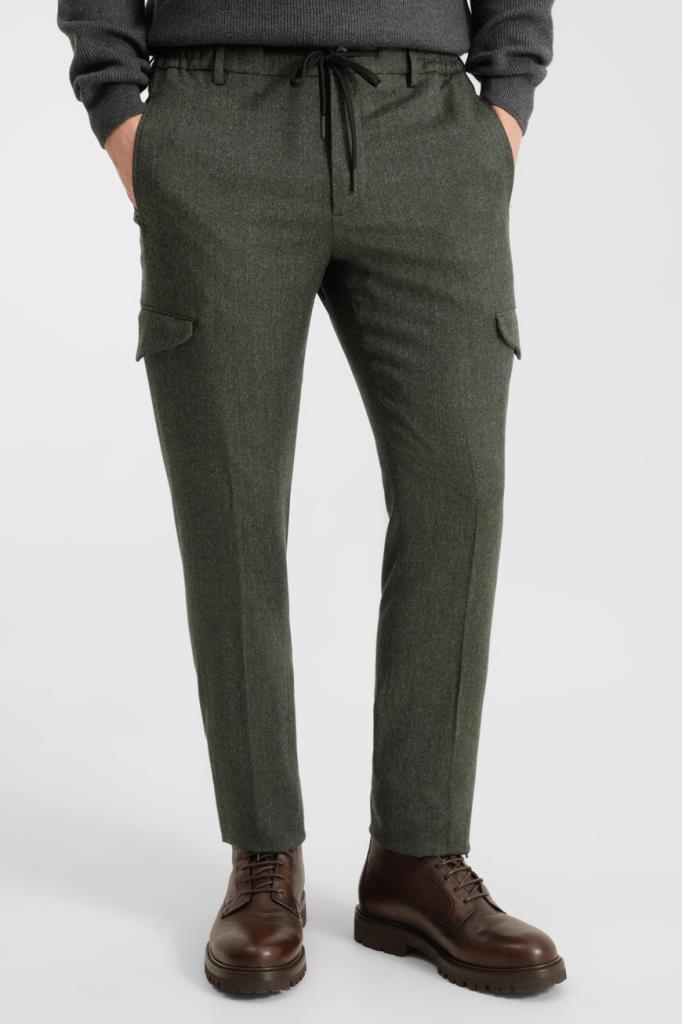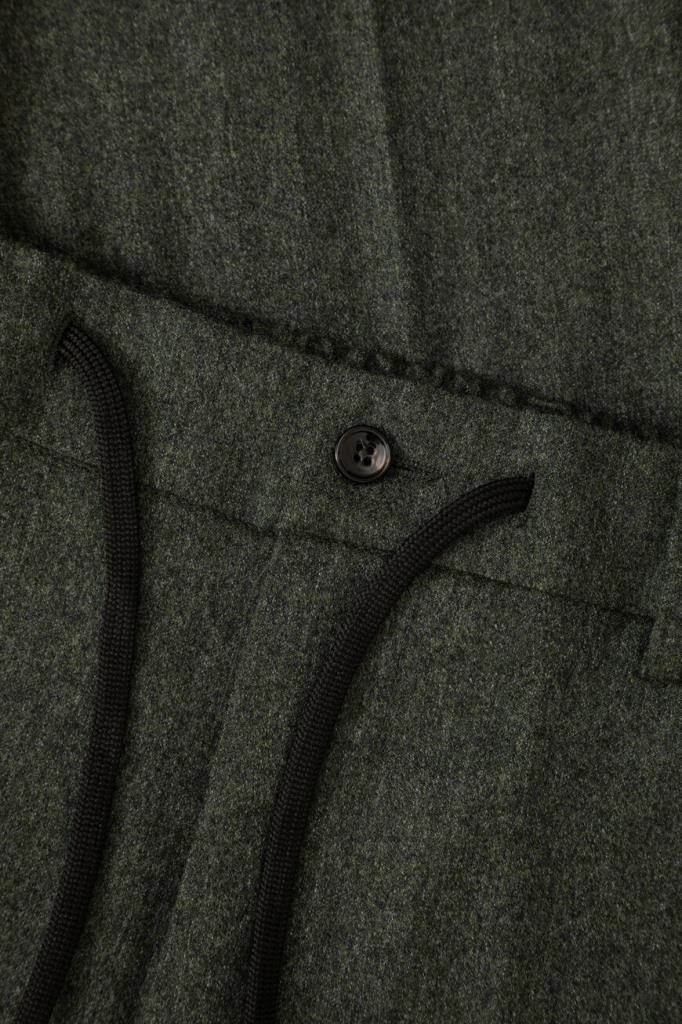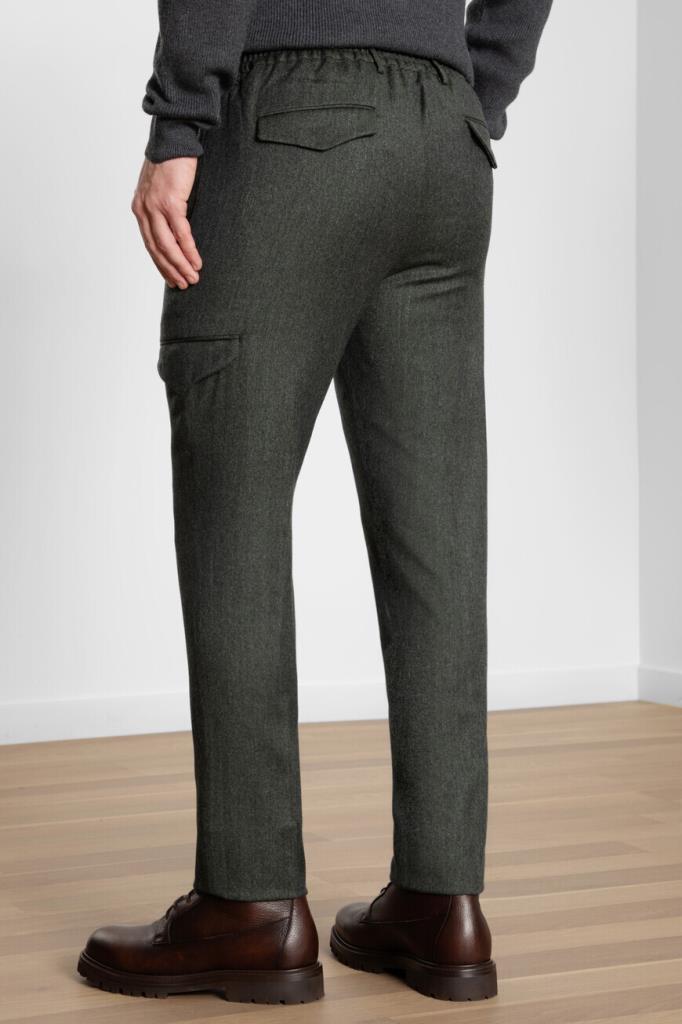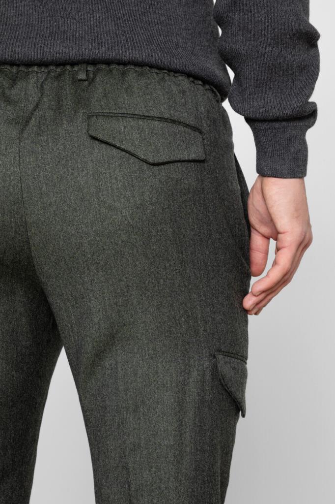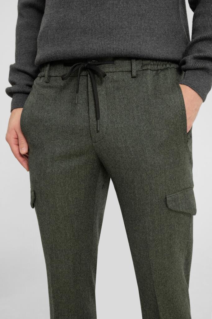 Шерстяные брюки в спортивном стиле от JOHNNY MANGLANI. Модель окрашена в тёмно-зелёный оттенок и оснащена шестью карманами. Образ можно дополнить вязаным свитером Corneliani и курткой приталенного кроя того же бренда.
