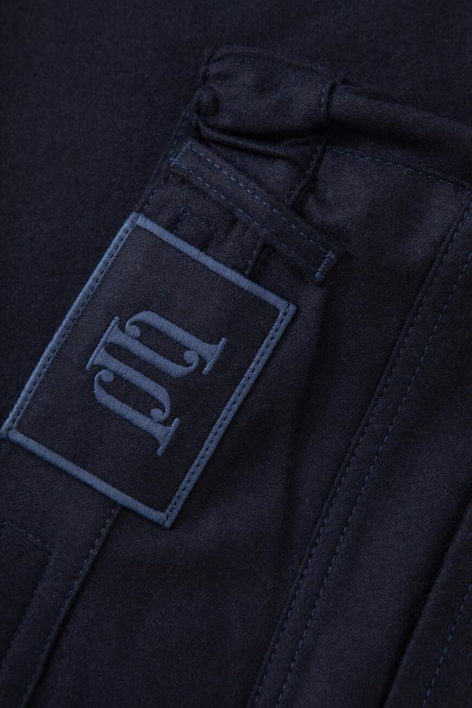 Джинсы из натуральной шерсти и кашемира от JOHNY MANGLANI. Изделие выполнено в тёмно-синем цвете и оснащено застёжкой на молнию и брендированную металлическую пуговицу. О принадлежности бренду напоминает прошитая накладка с вышитым синим логотипом на заднем кармане и вышитая символика Дома на кармане спереди.