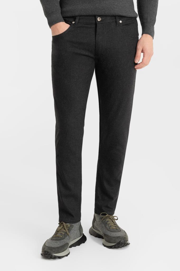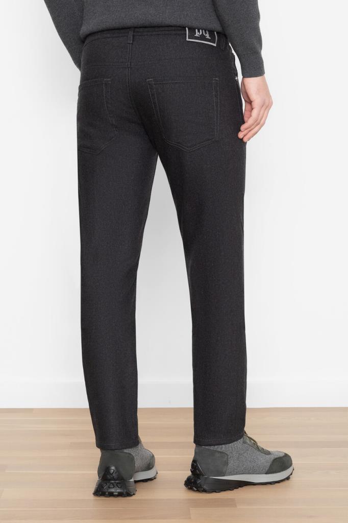 Джинсы JOHNY MANGLANI из эластичного трикотажа на основе шерсти и кашемира. Модель окрашена в тёмно-серый оттенок и украшена прошитой накладкой с крупным вышитым логотипом на заднем кармане. На принадлежность Дому также указывает вышитая культовая символика на кармане спереди.