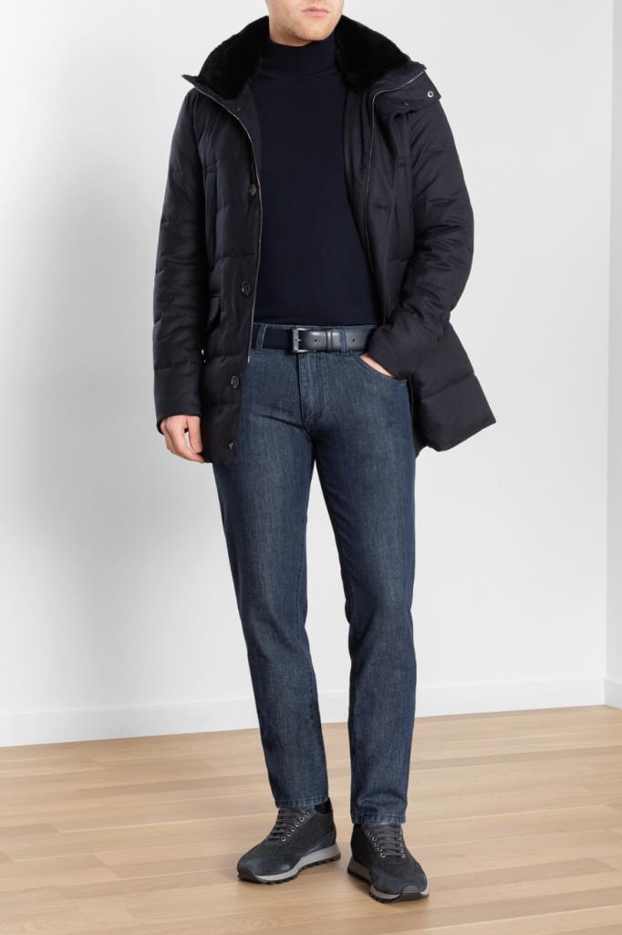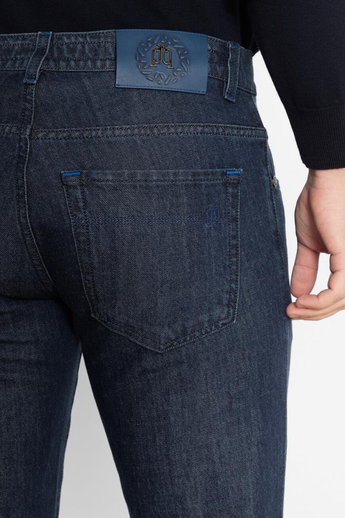 Тёмно-синие джинсы прямого кроя от JOHNY MANGLANI. Для изготовления модели используется эластичный деним на основе хлопка и лиоцелла. Декором выступают синяя кожаная нашивка с рельефным узором и металлическим логотипом на поясе сзади и вышитая культовая символика бренда на задних карманах и кармане спереди. Носите изделие со стёганой курткой из натуральной шерсти virgin и замшевыми ботинками JOHNY MANGLANI.
