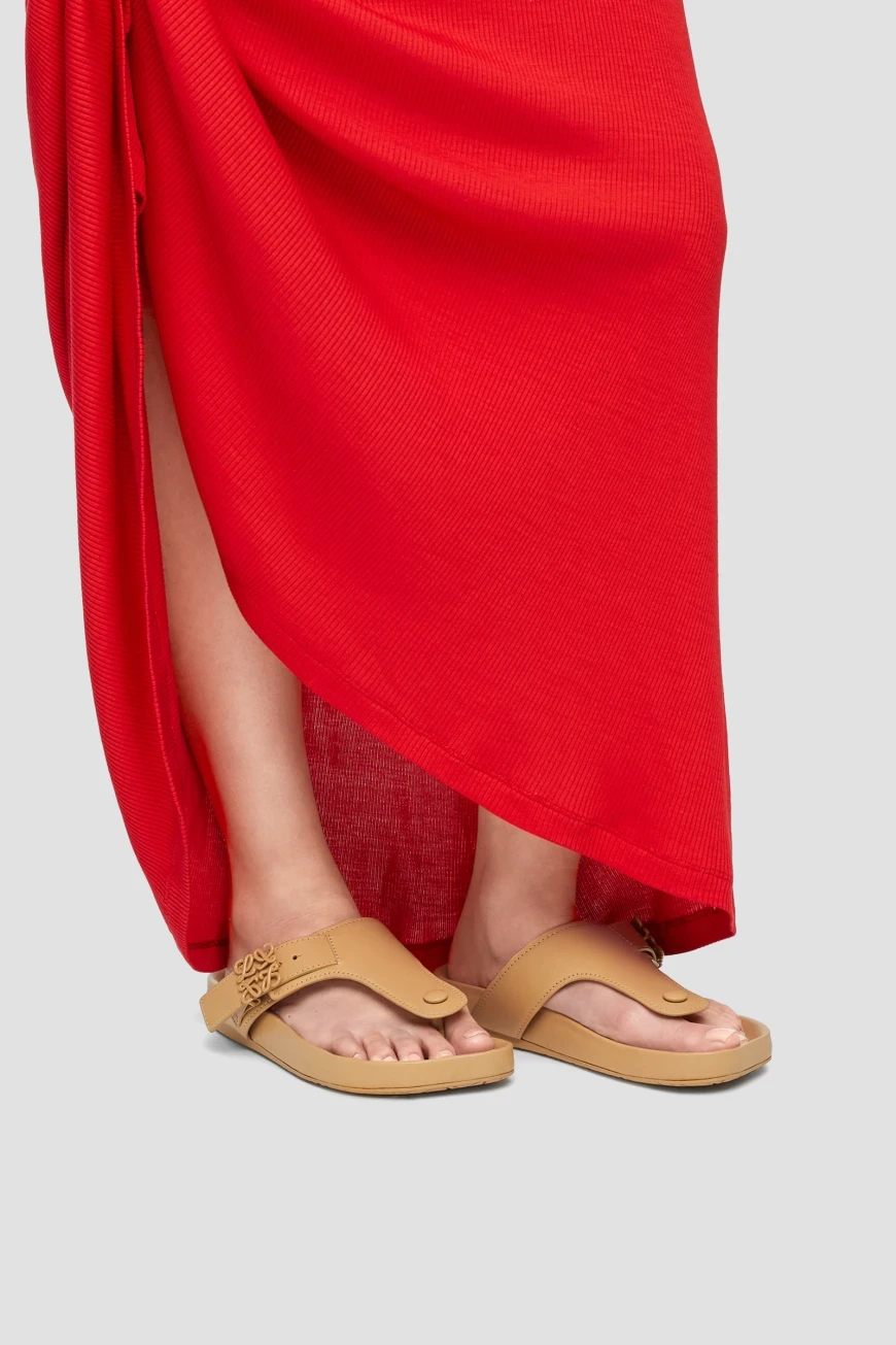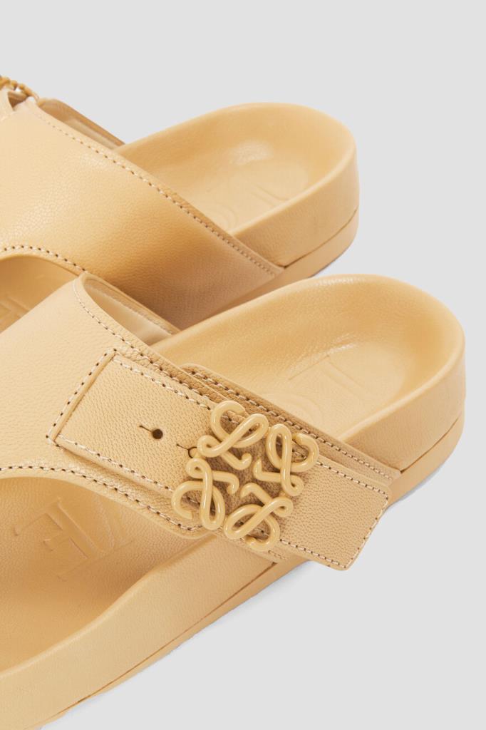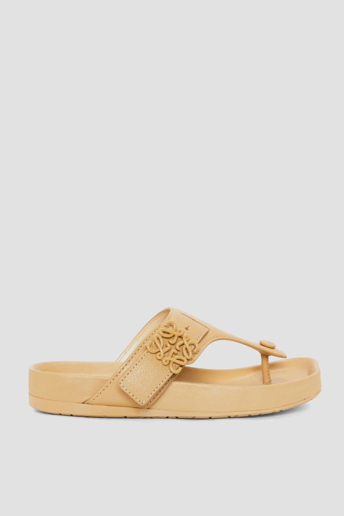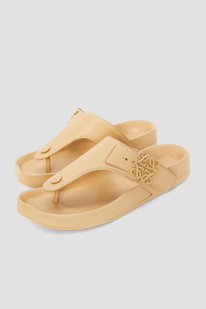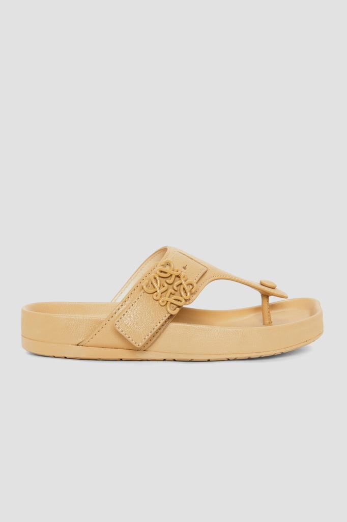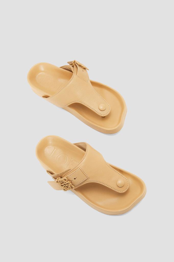 Сандалии из натуральной кожи козлёнка от бренда LOEWE. Пара с Т-образным ремешком выполнена в светло-бежевом оттенке и оснащена анатомической платформой, которая снизит нагрузку на стопу во время длительных прогулок. Ремешок для фиксации сбоку дополнен культовой формованной пряжкой LOEWE Anagram в виде четырёх изящных букв L.