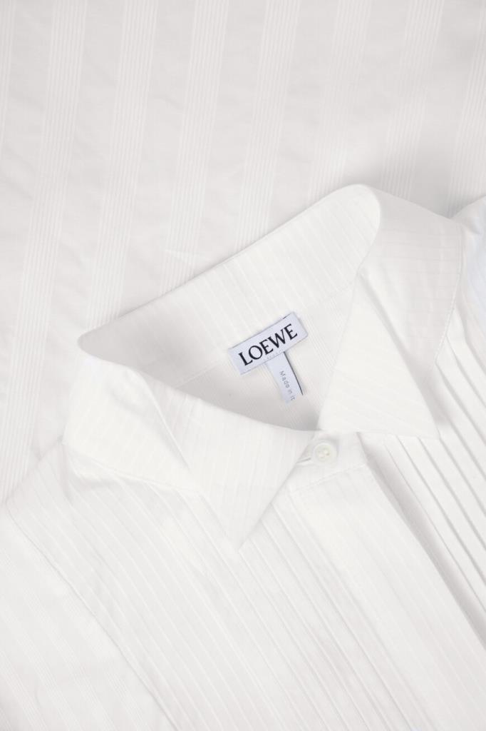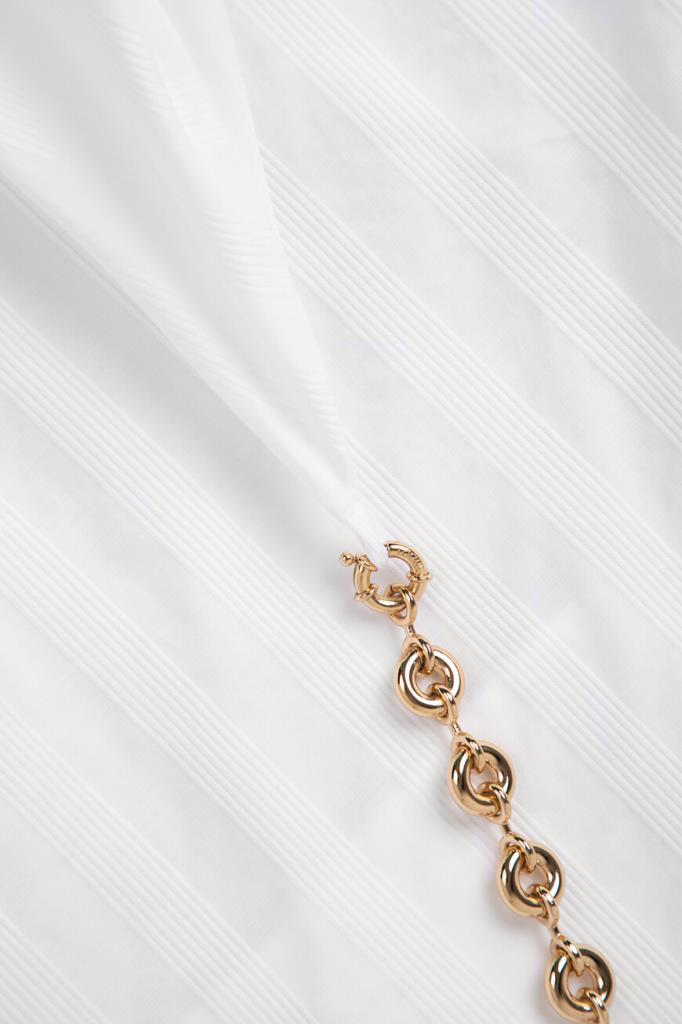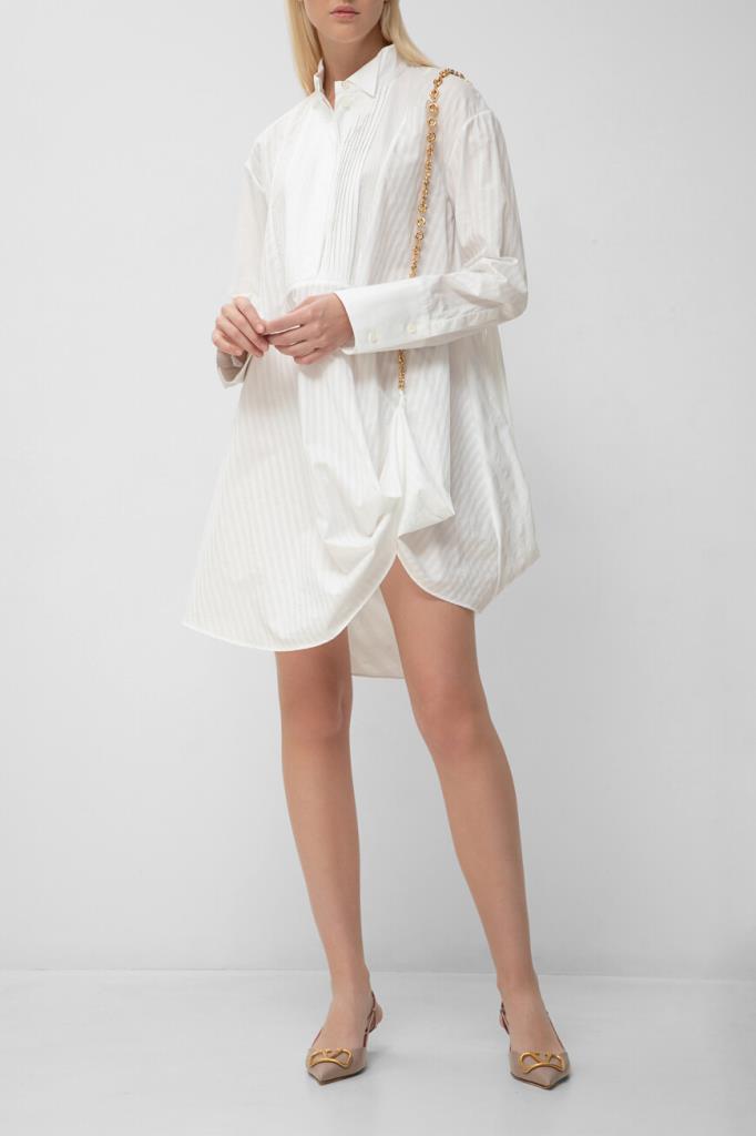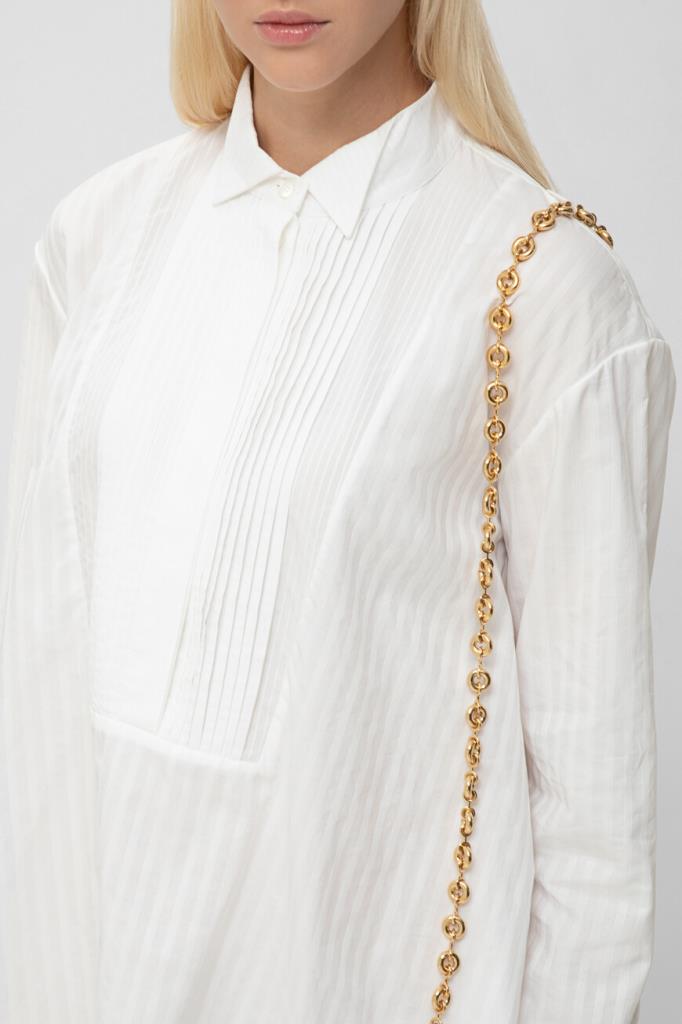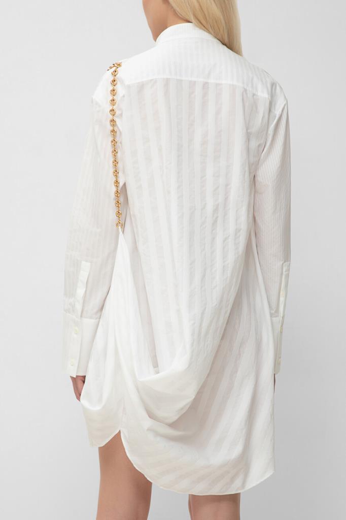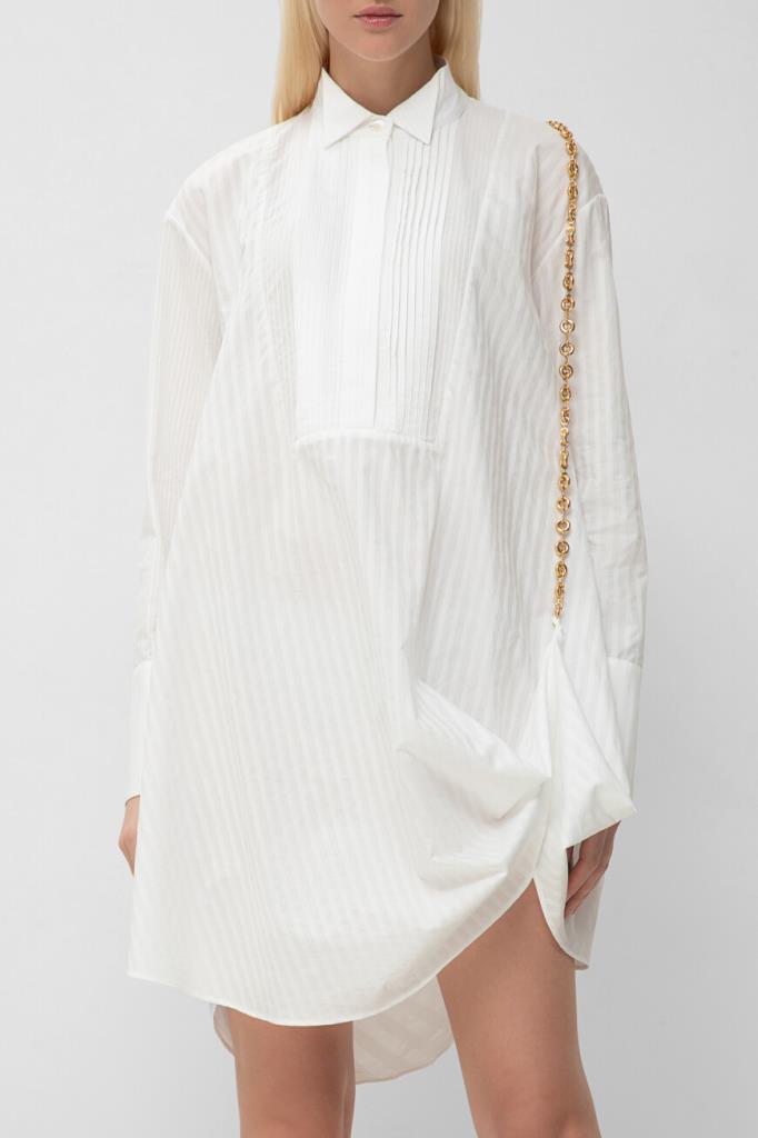 Белое платье-рубашка Loewe выполнено из хлопка. Тонкая и легкая модель с асимметричным подолом дополнена крупной золотистой цепью, приподнимающей край платья. Оригинальное дизайнерское решение позволило усложнить силуэт изделия, добавить объем и драпировки. Цепочка легко отстегивается, позволяя носить модель как универсальное белое платье.