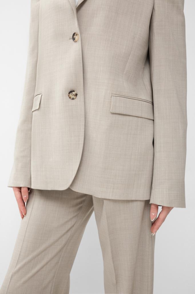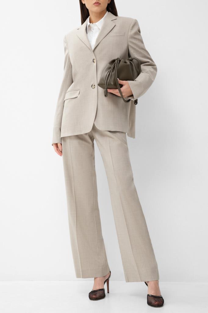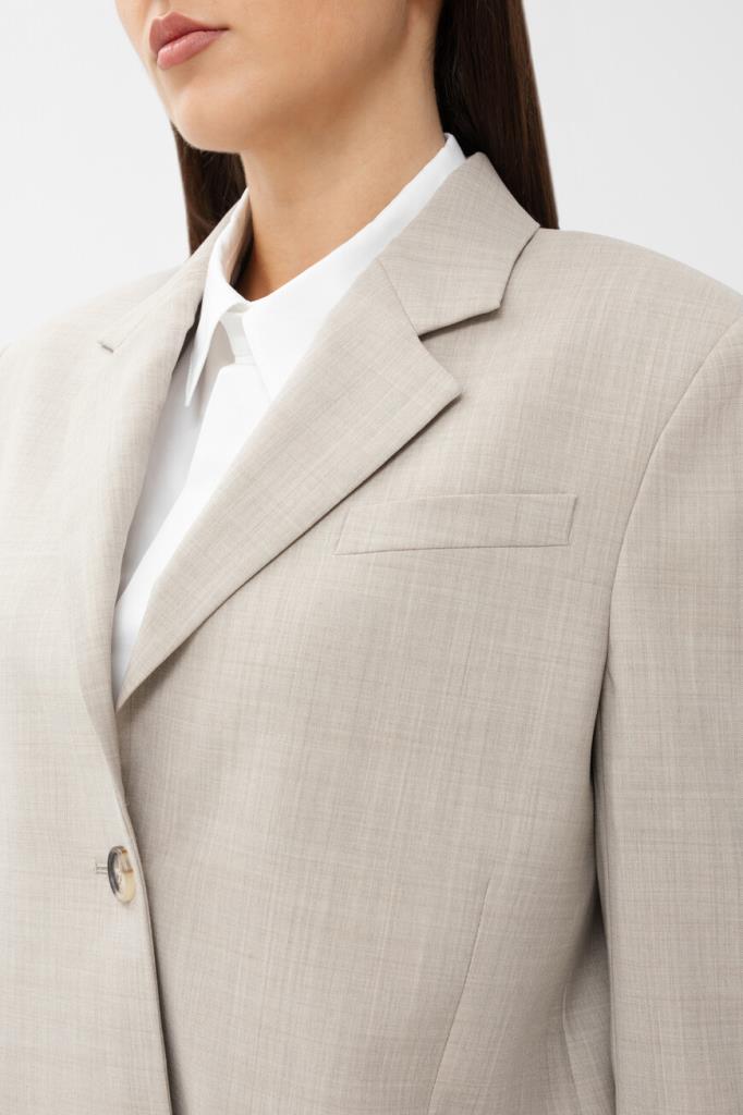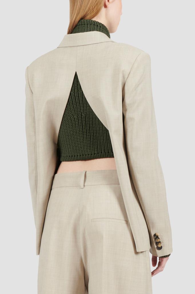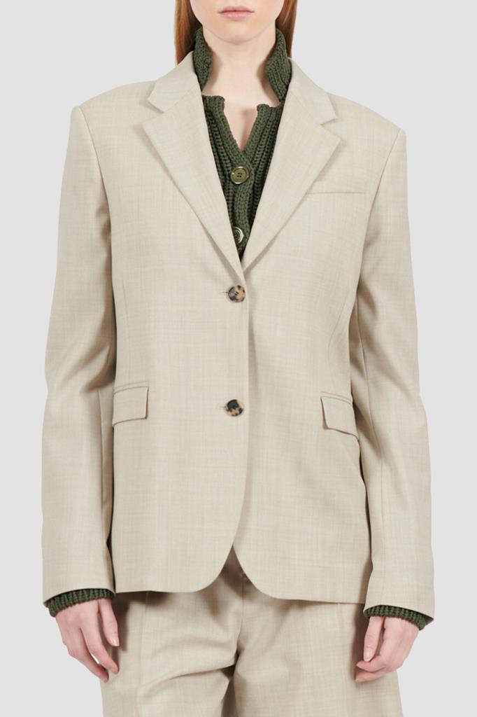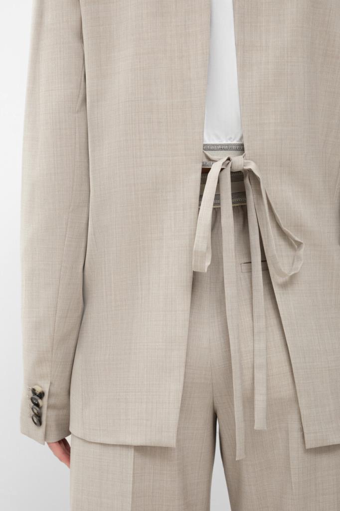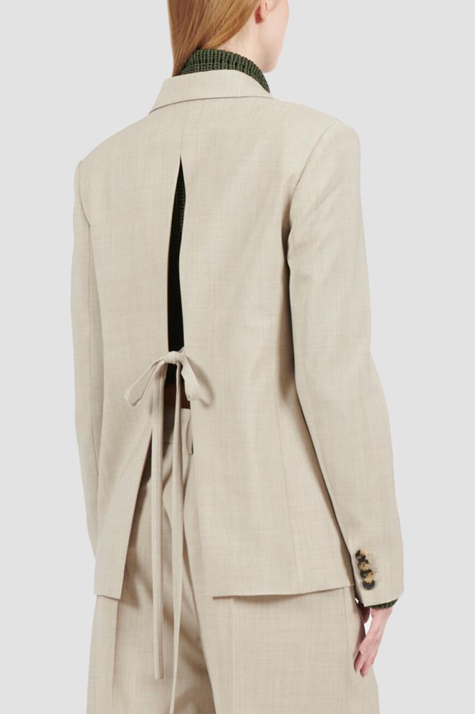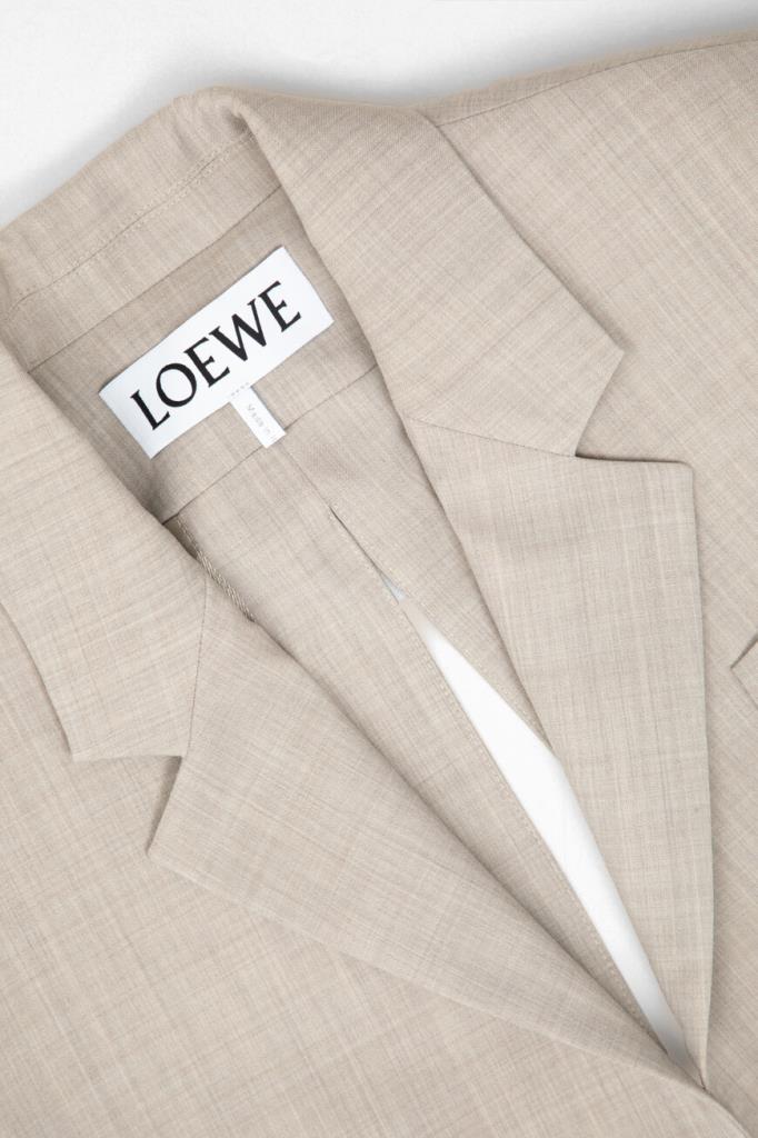 Лёгкий однобортный пиджак LOEWE с глубоким вырезом сзади на завязках. Для изготовления модели дизайнерской конструкции выбрана мягкая плотная шерсть светло-бежевого оттенка. Материал практически не мнётся, поэтому изделие из него долго выглядит безупречно. Создайте повседневный комплект с брендированными шортами прямого силуэта из той же коллекции.