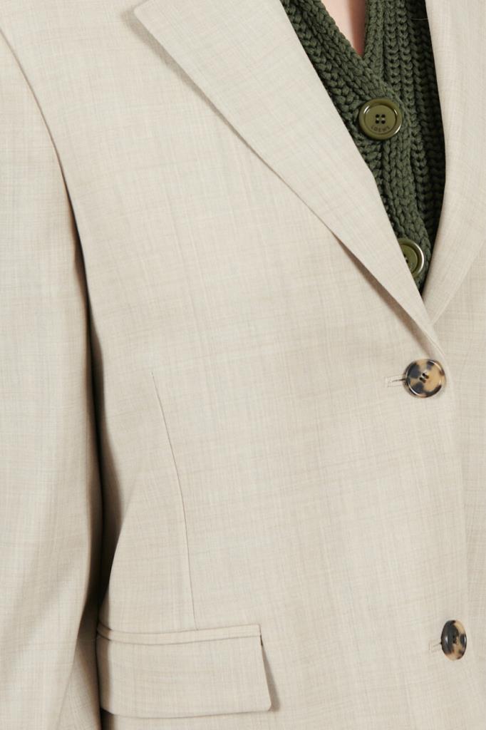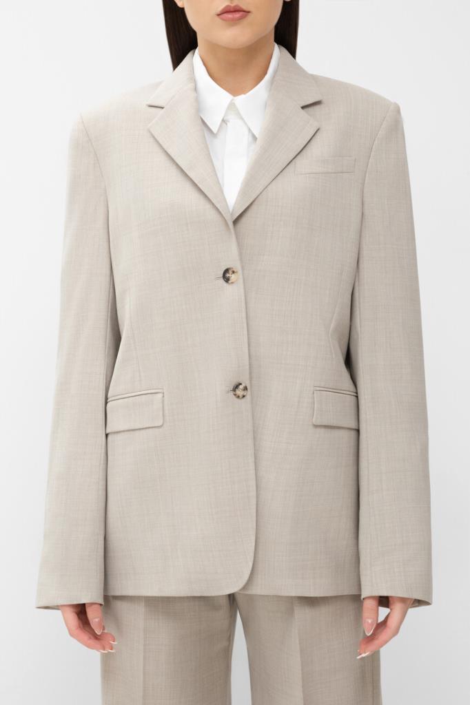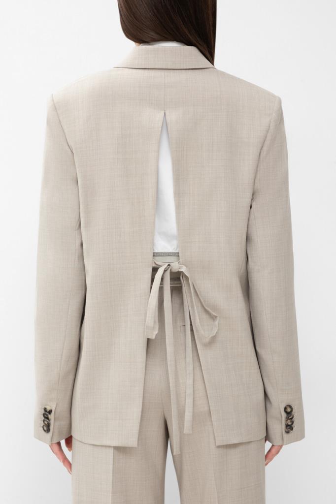 Лёгкий однобортный пиджак LOEWE с глубоким вырезом сзади на завязках. Для изготовления модели дизайнерской конструкции выбрана мягкая плотная шерсть светло-бежевого оттенка. Материал практически не мнётся, поэтому изделие из него долго выглядит безупречно. Создайте повседневный комплект с брендированными шортами прямого силуэта из той же коллекции.