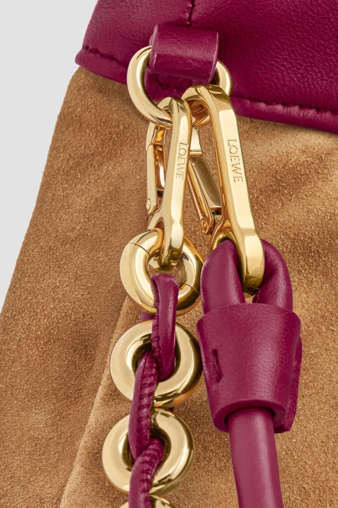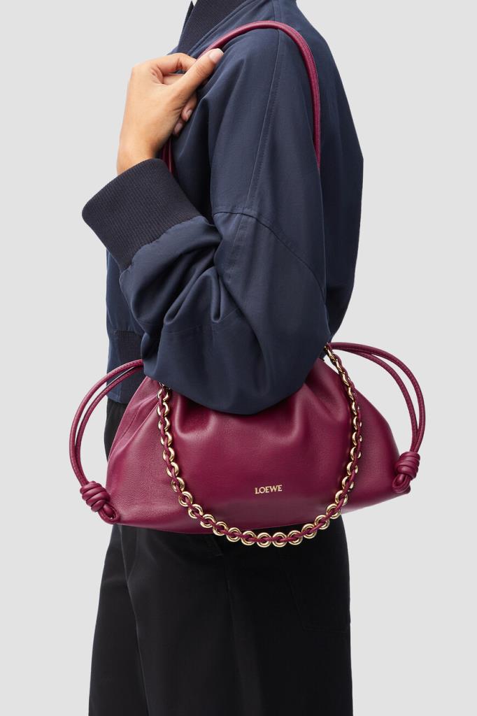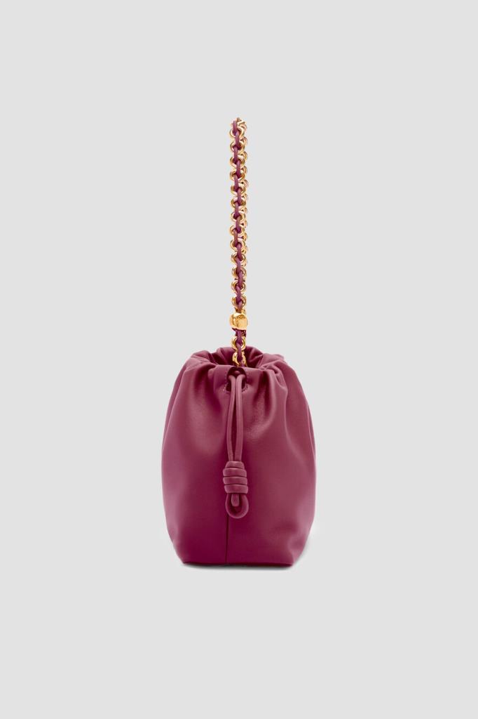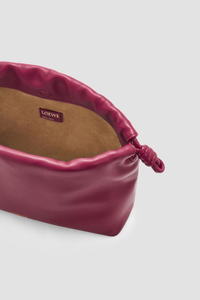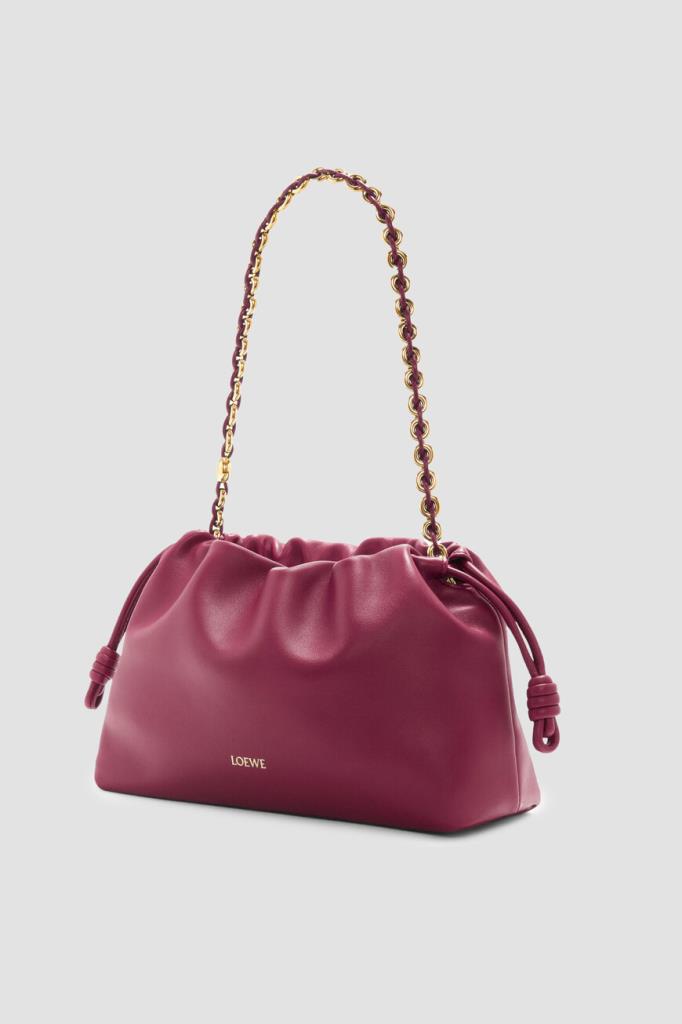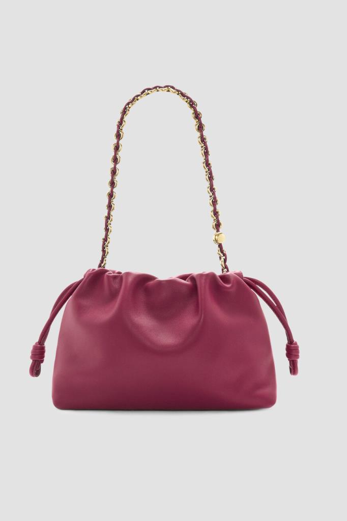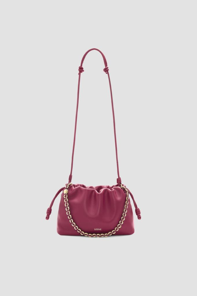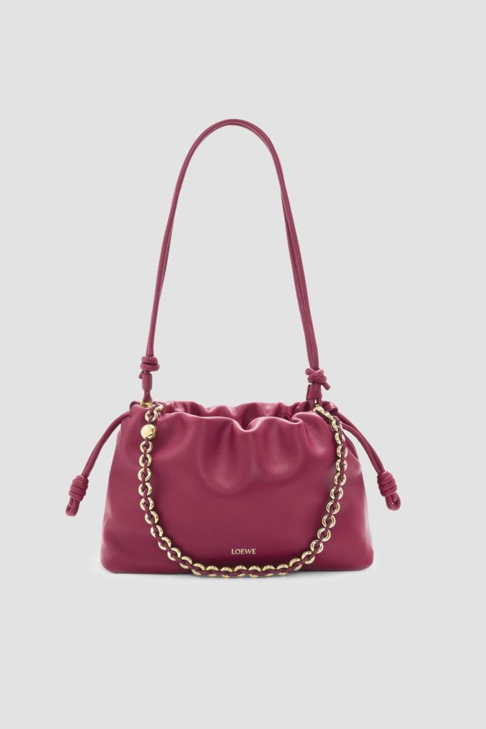 Кожаная сумка Flamenco Purse от LOEWE. Изделие из мягкой гладкой кожи наппа выполнено в малиновом оттенке и оснащено магнитной застёжкой-клёпкой. Верхняя часть аксессуара подобрана на кулиски по бокам, а внутри расположено одно большое отделение. Принадлежность модели среднего формата Дому обозначена золотистым логотипом на лицевой стенке.