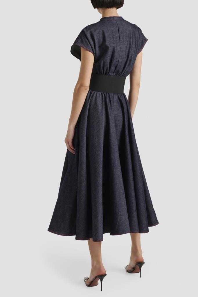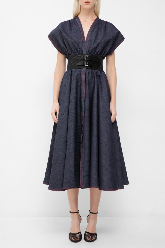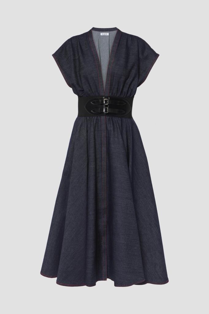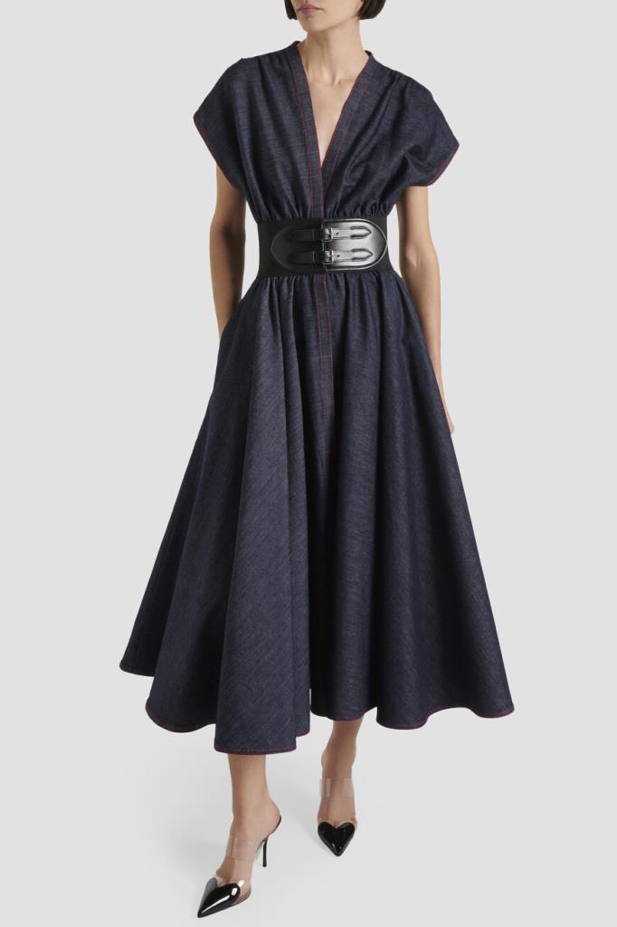 Платье с глубоким V-образным вырезом горловины от бренда ALAIA. Для пошива длинной модели прилегающего кроя выбран эластичный тёмно-синий деним на основе хлопка и полиэстера. Линию талии подчёркивает широкий кожаный ремень, оснащённый двумя ремешками с регулирующими металлическими пряжками. Пояс чёрного цвета добавляет интересный акцент, формирует женственный силуэт и образует мягкие складки на подоле.