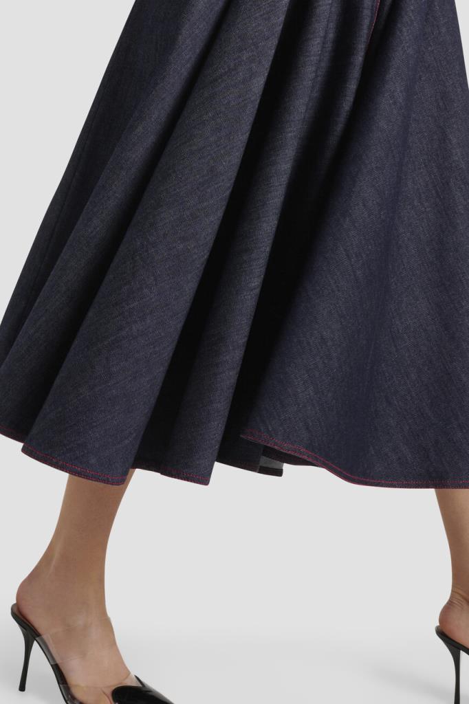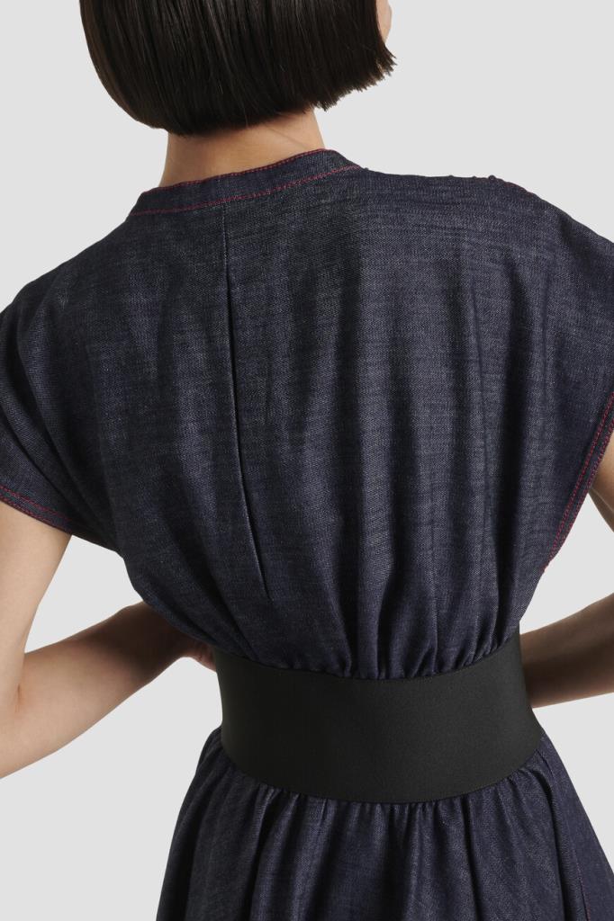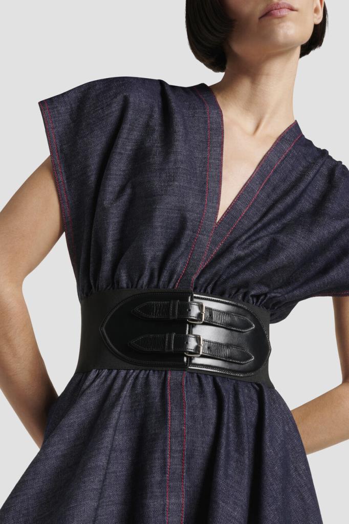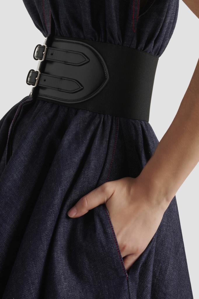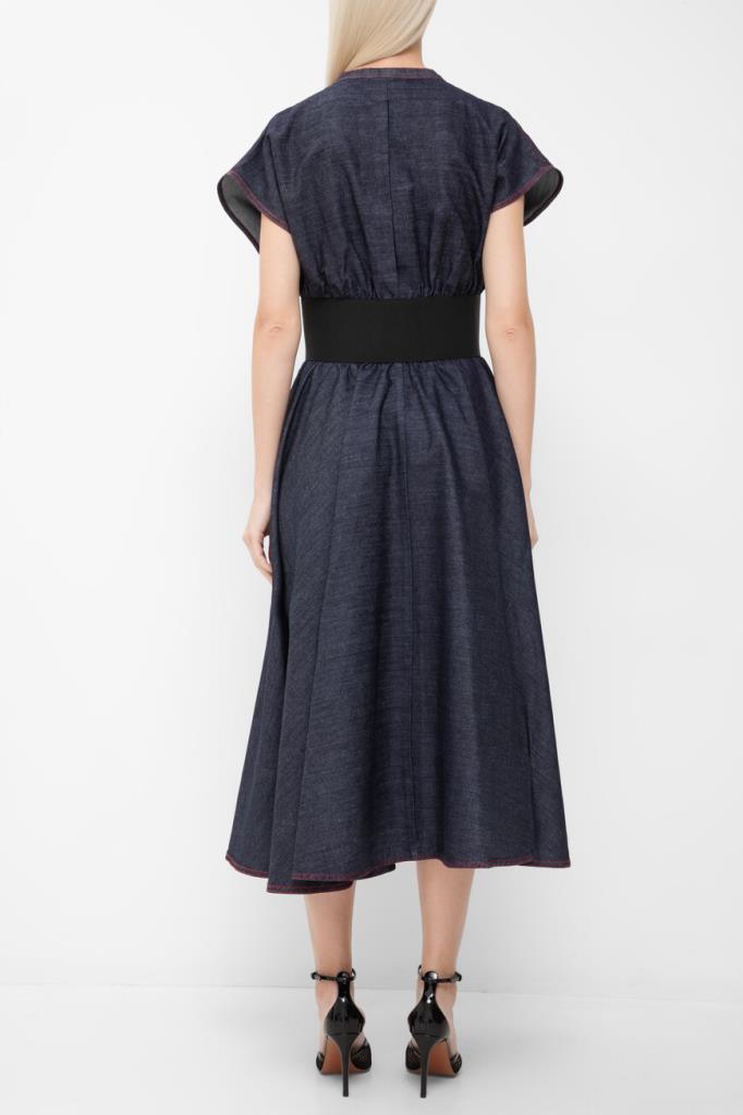 Платье с глубоким V-образным вырезом горловины от бренда ALAIA. Для пошива длинной модели прилегающего кроя выбран эластичный тёмно-синий деним на основе хлопка и полиэстера. Линию талии подчёркивает широкий кожаный ремень, оснащённый двумя ремешками с регулирующими металлическими пряжками. Пояс чёрного цвета добавляет интересный акцент, формирует женственный силуэт и образует мягкие складки на подоле.