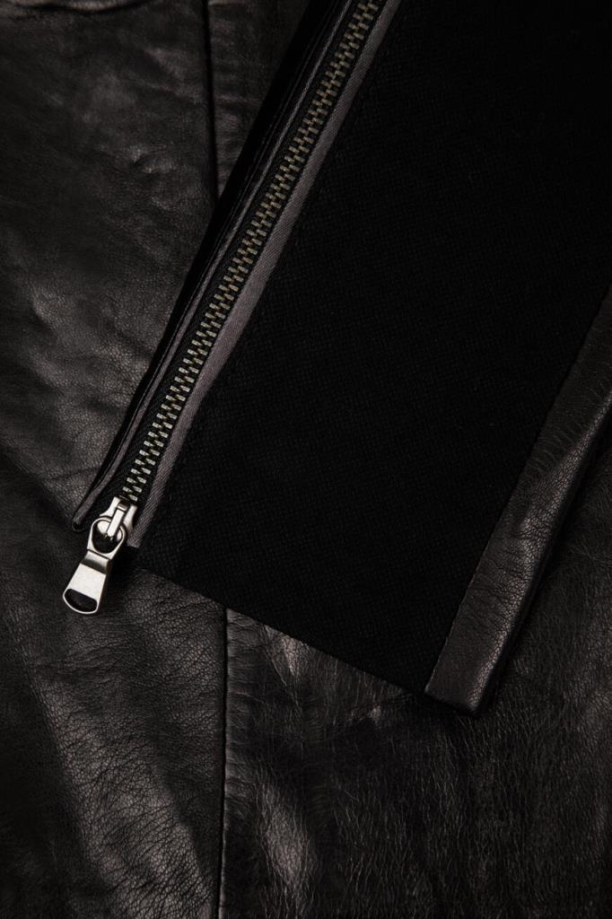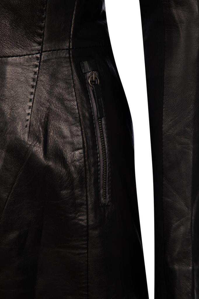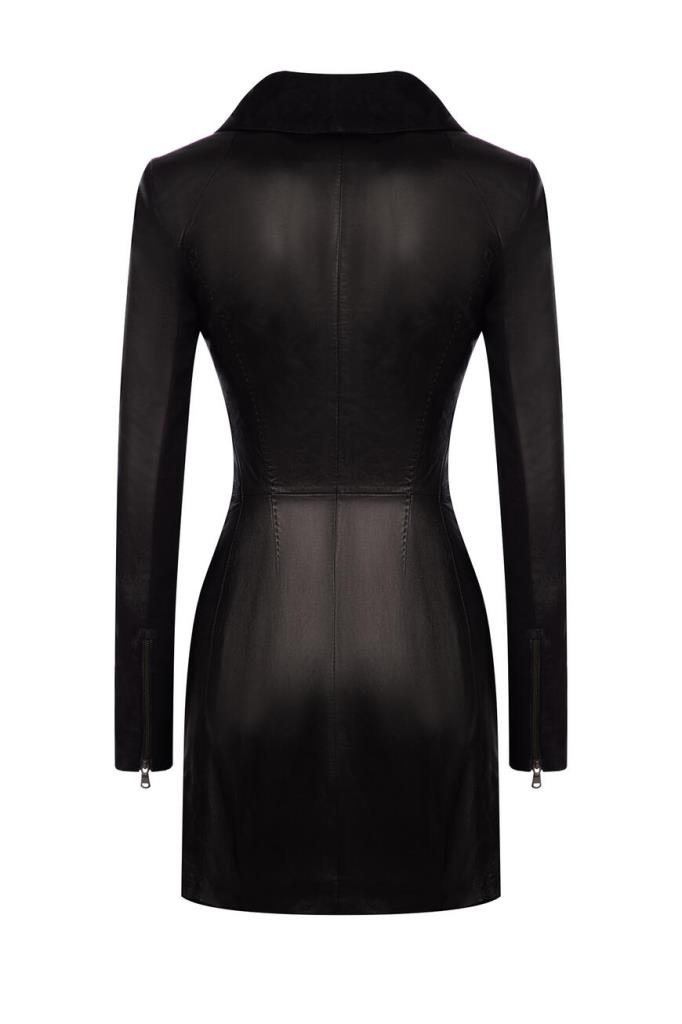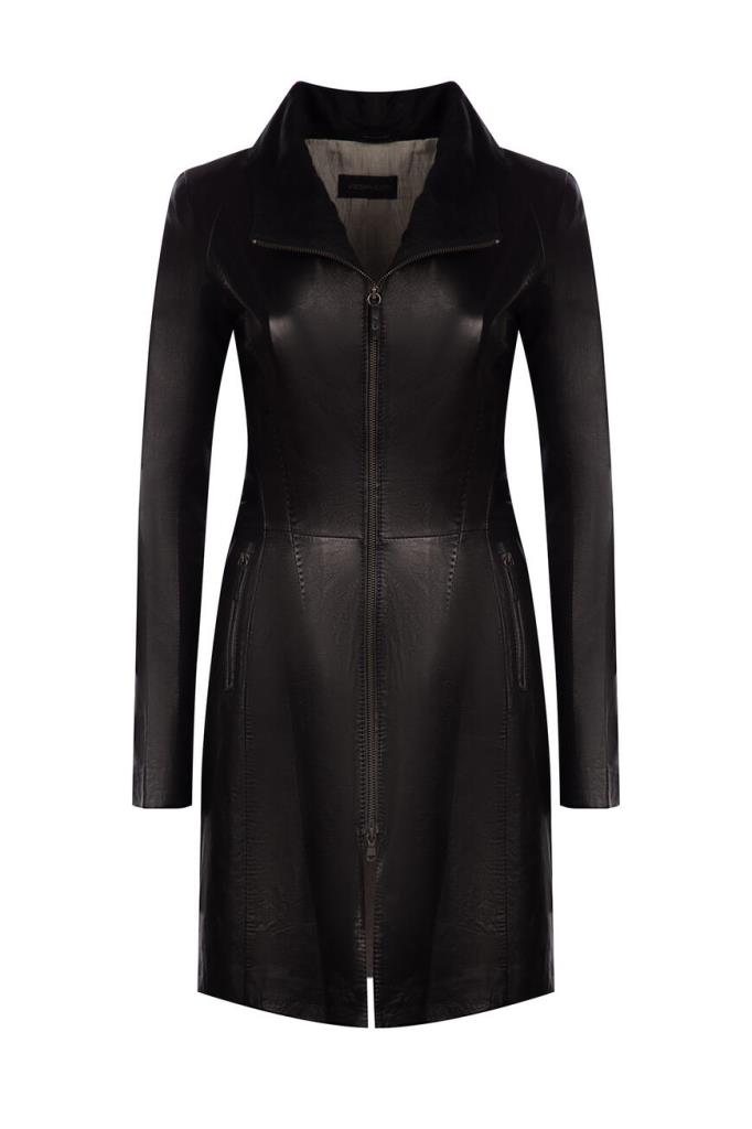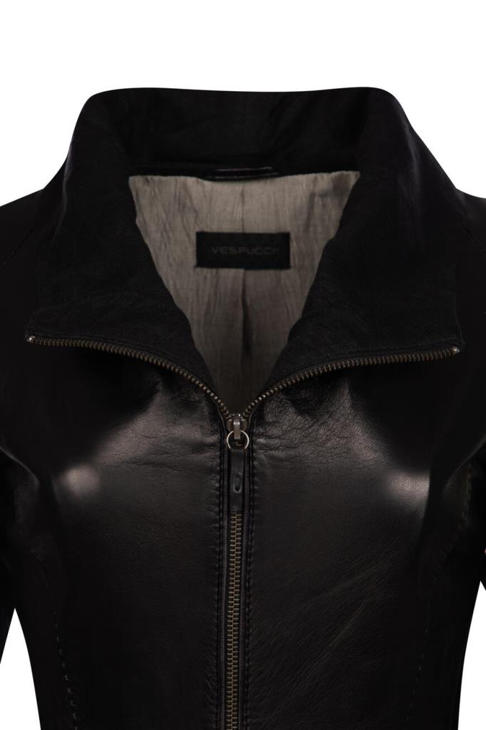 Роскошный женский плащ Vespucci из мягкой натуральной телячьей кожи чёрного цвета с лёгким матовым глянцевым отливом и эффектными текстильными вставками на изнаночной стороне воротника и внутренней стороне рукавов по бокам.