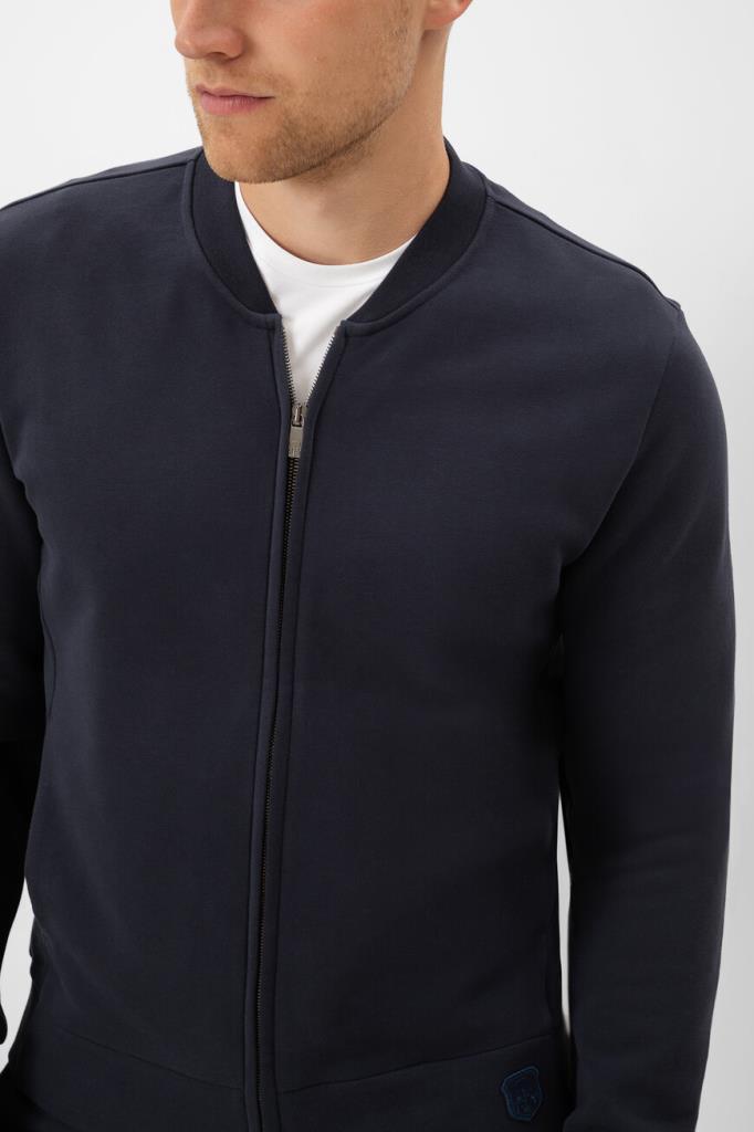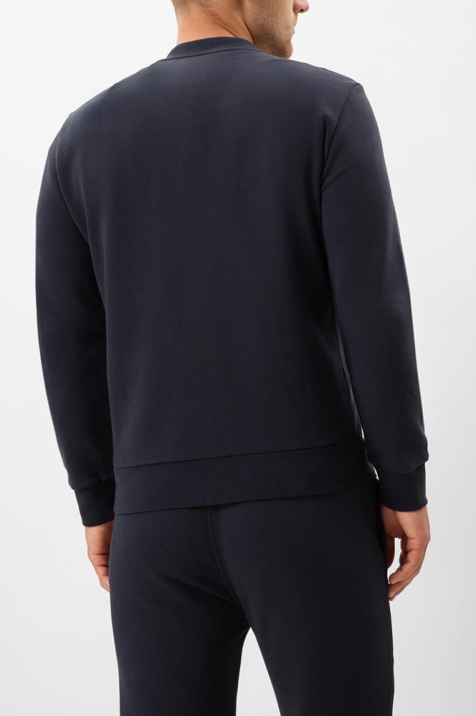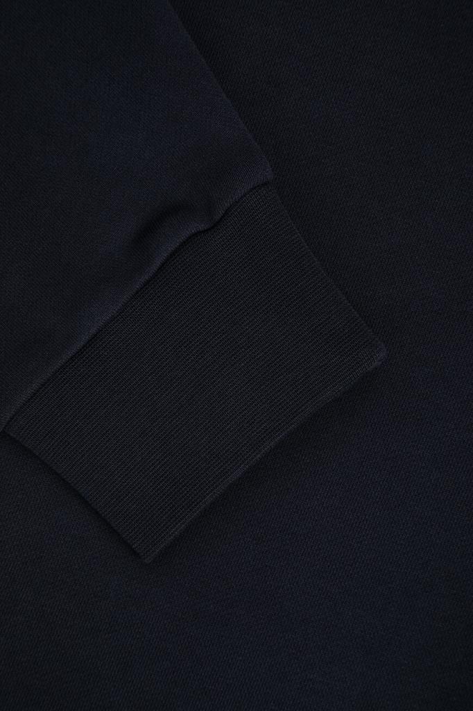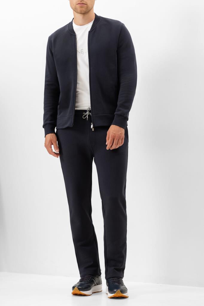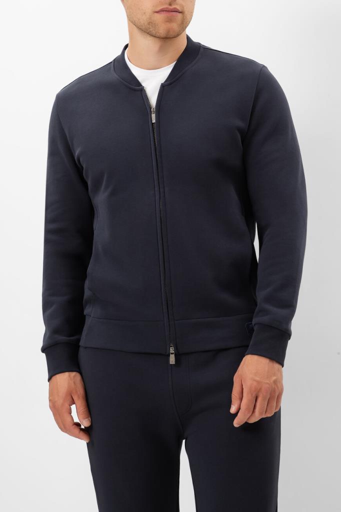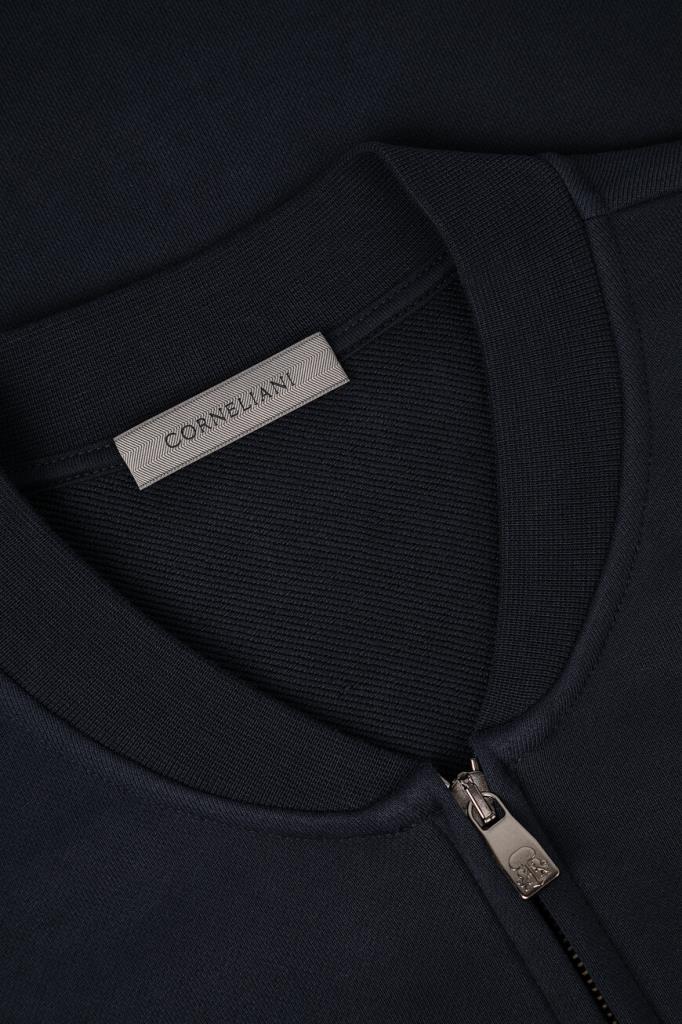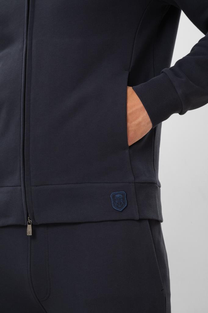 Лёгкая толстовка CORNELIANI на молнии с двумя брендированными бегунками. Для создания повседневной модели выбран тонкий хлопковый трикотаж тёмно-синего цвета. Атрибутом бренда стала крупная эмблема с вышитым гербом Дома спереди снизу. Изделие будет выглядеть гармонично в тандеме с белой футболкой, спортивными брюками на серой кулиске и кожаными кроссовками из той же коллекции.