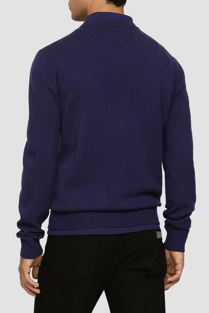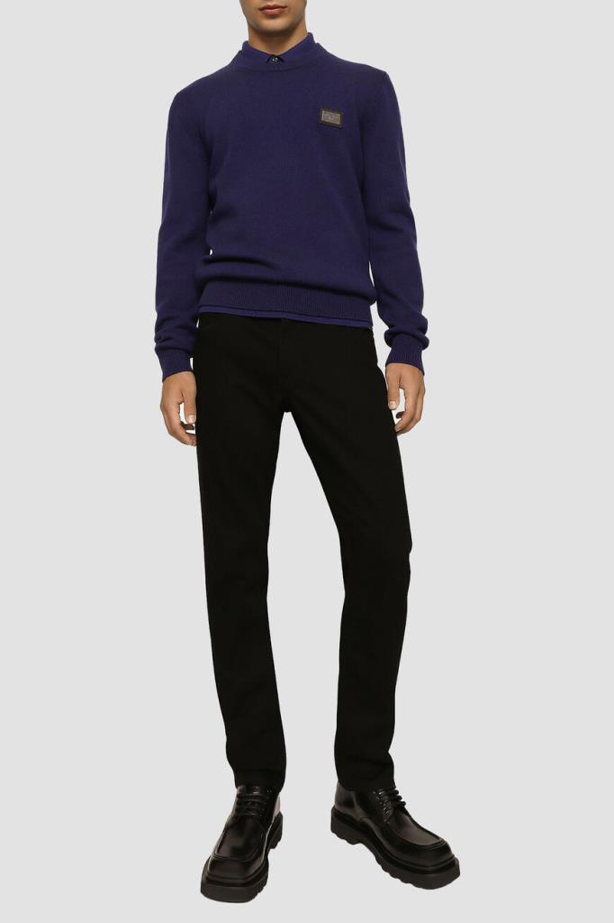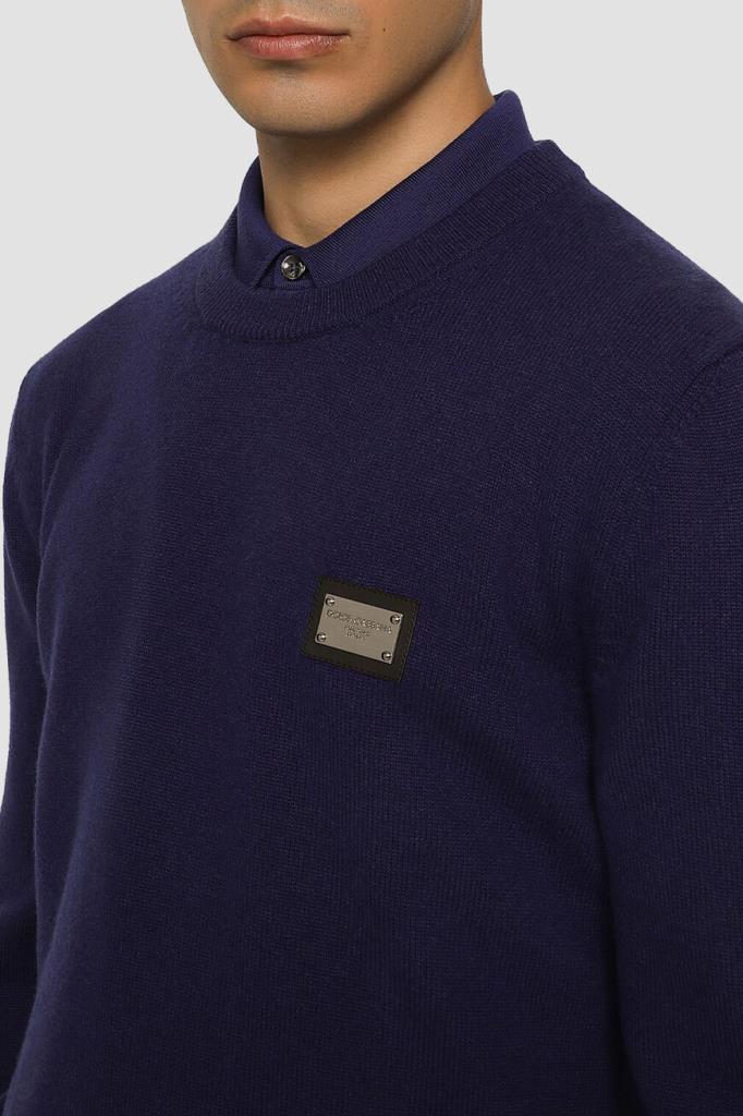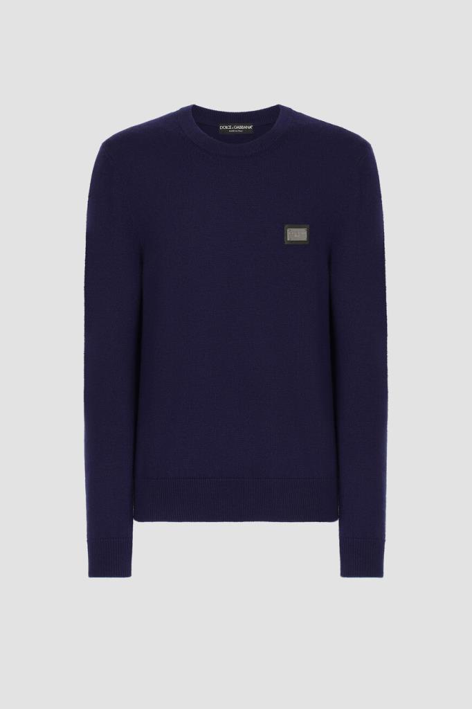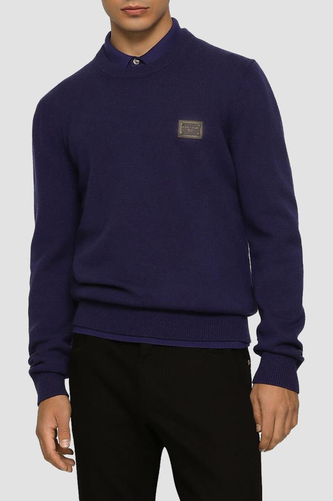 Вязаный пуловер Dolce & Gabbana с круглым вырезом горловины на резинке. Для создания тёмно-синей модели из коллекции Essential выбран мягкий трикотаж на основе натуральной шерсти и кашемира. Принадлежность изделия бренду обозначена чёрной кожаной нашивкой с выгравированным логотипом.
