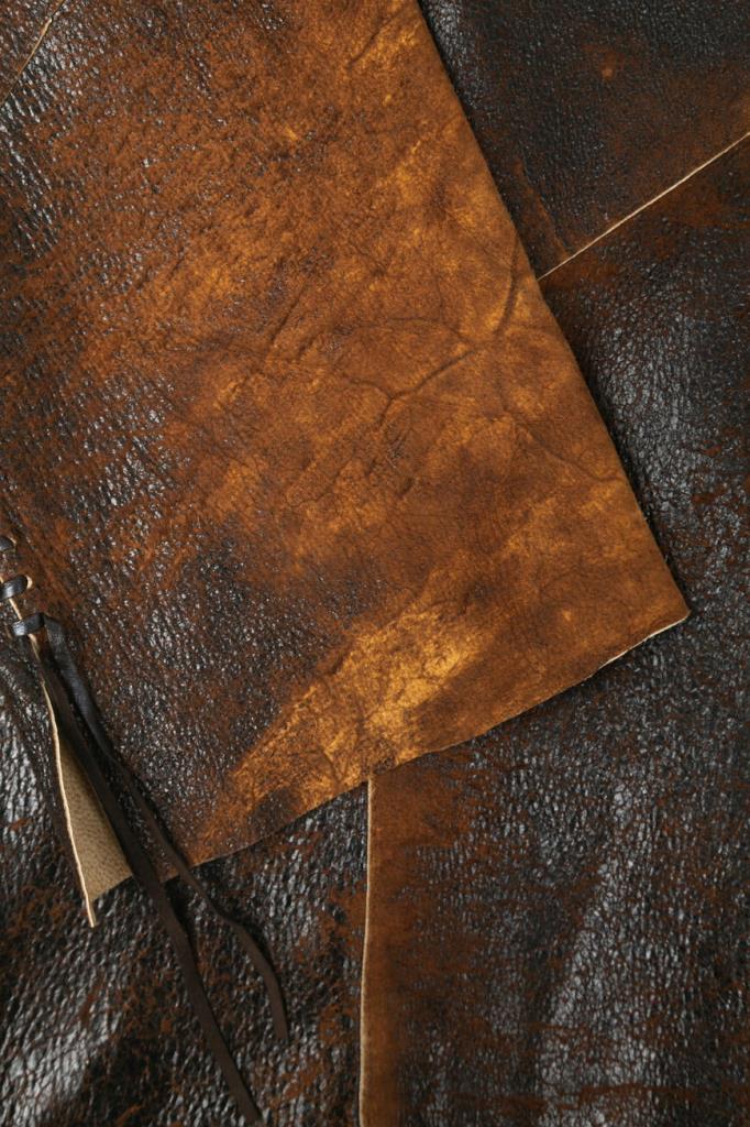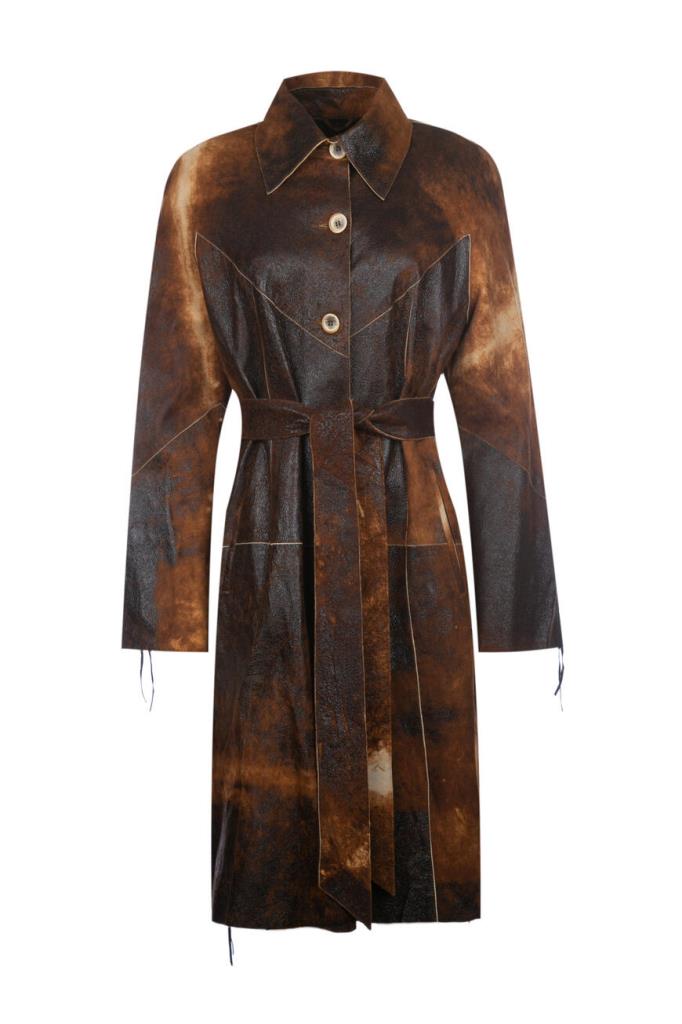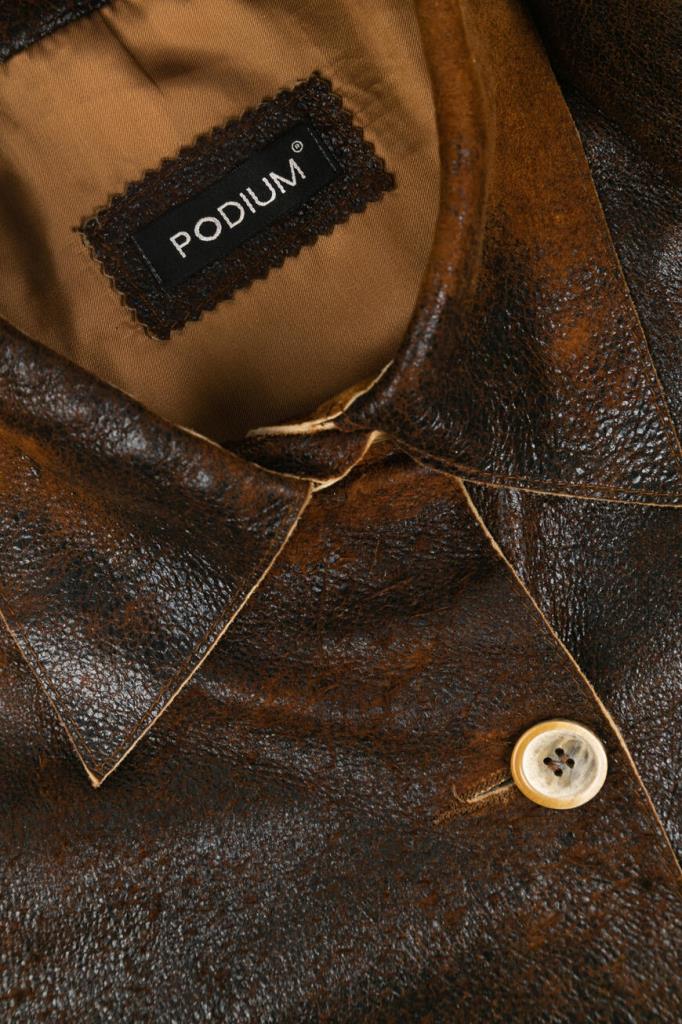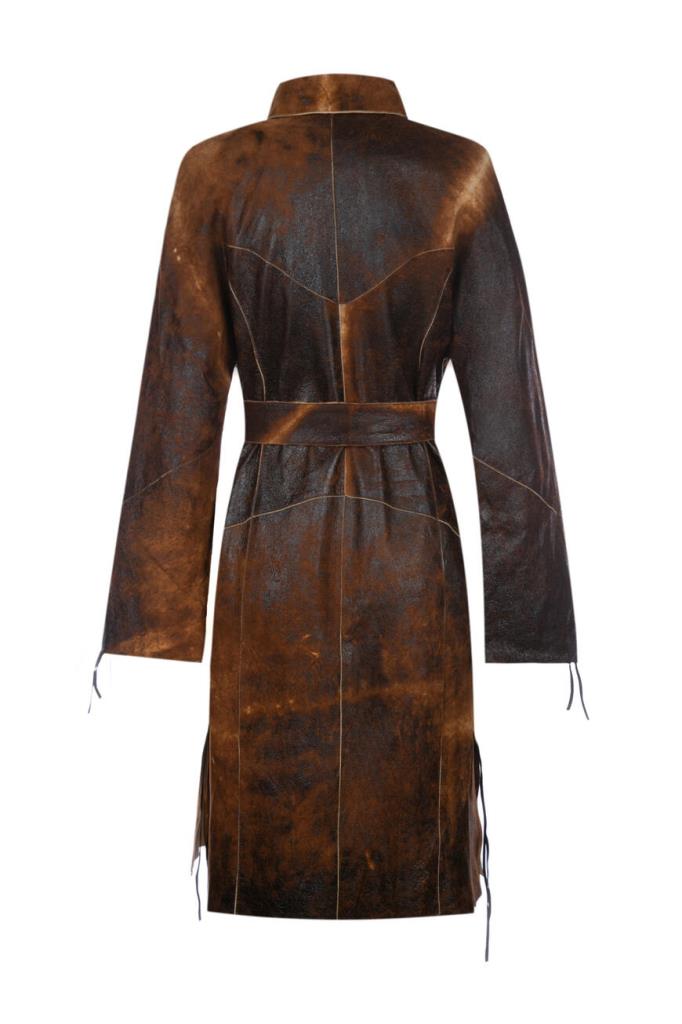 Роскошное женское пальто-френч от бренда Podium выполнено из мягкой натуральной телячьей кожи коричневого оттенка с эффектным неоднородным тёмно-коричневым узором по всей поверхности изделия и дополнено изысканными декоративными завязками по бокам на подоле и сбоку на рукавах.