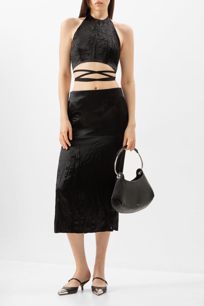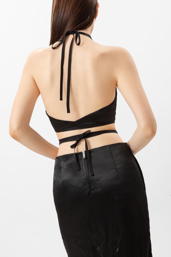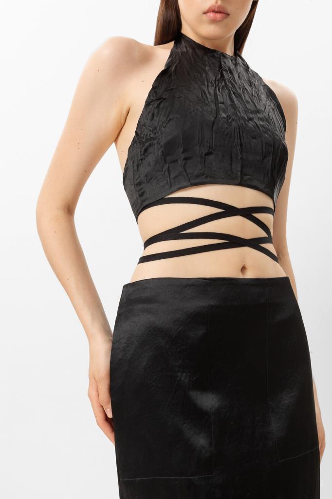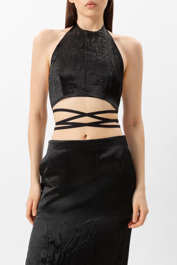 Топ Max Mara из мягкого блестящего атласа с жатым эффектом. Изделие из ацетата выполнено в чёрном цвете и оснащено завязками на шее и длинной лентой на завязках по линии талии. Облегающая модель с открытой спиной составит элегантный комплект с чёрной юбкой длиной до середины икры и блейзером оверсайз из той же линейки.