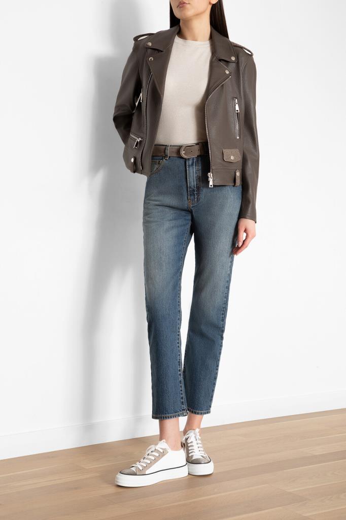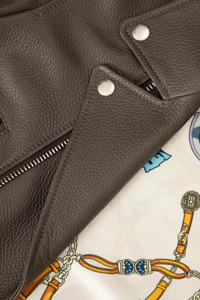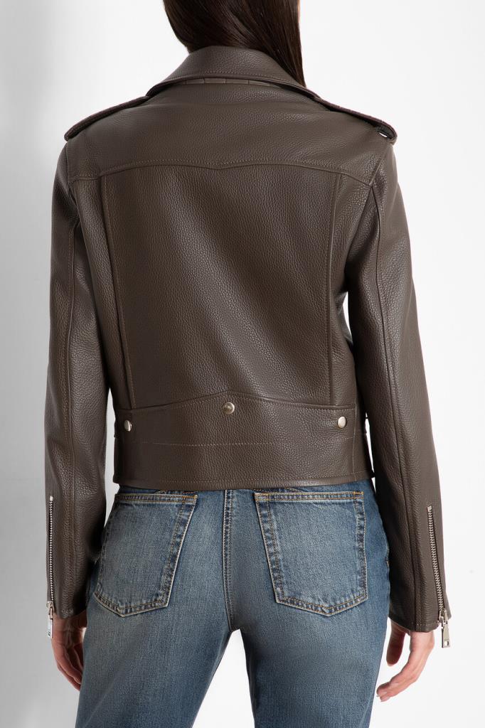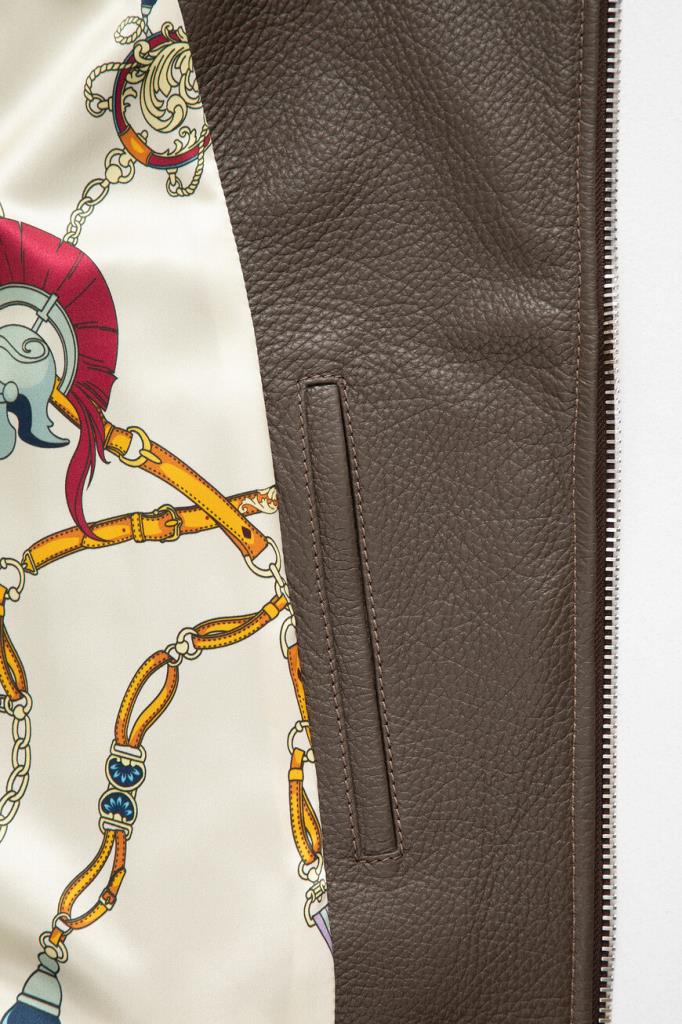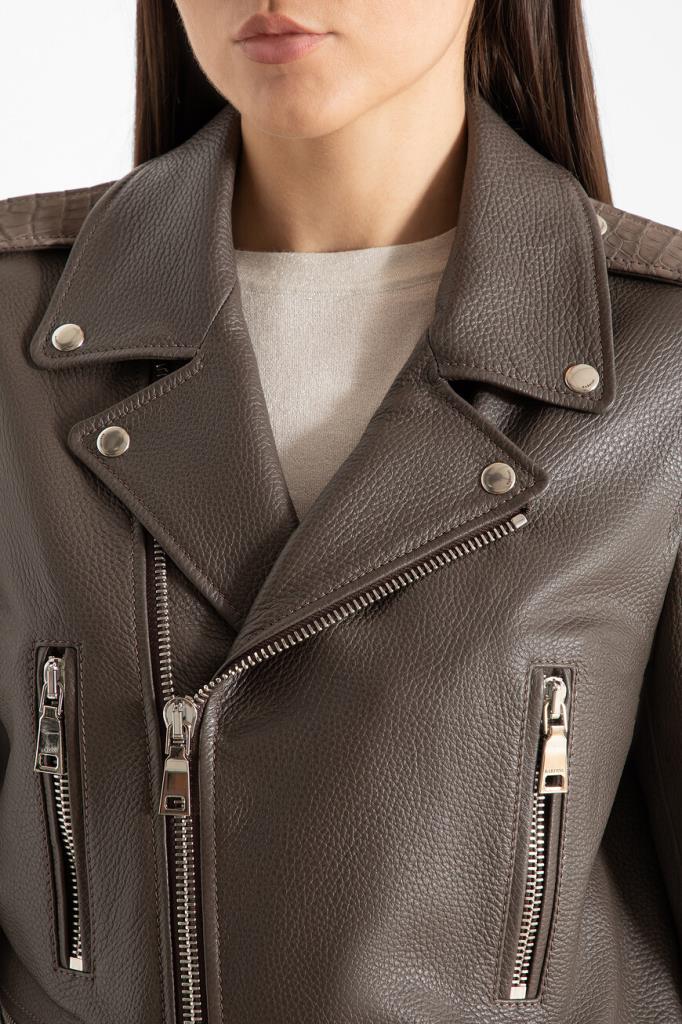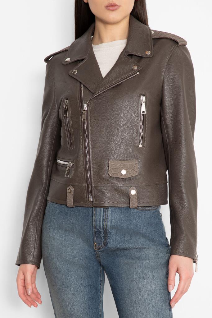 Куртка-косуха из мягкой зернистой кожи оленя от Bardini. Фасон повседневной модели тёмно-коричневого оттенка предполагает полуприталенный крой и четыре кармана. Отличительными деталями стали вставки из фактурной матовой кожи крокодила на уровне плеч (паты), сзади под воротником, клапане прорезного кармана слева и шлевках на манжете снизу.