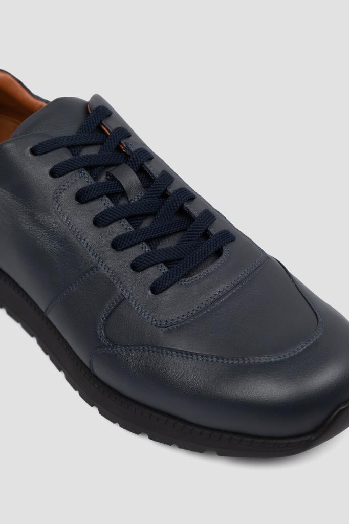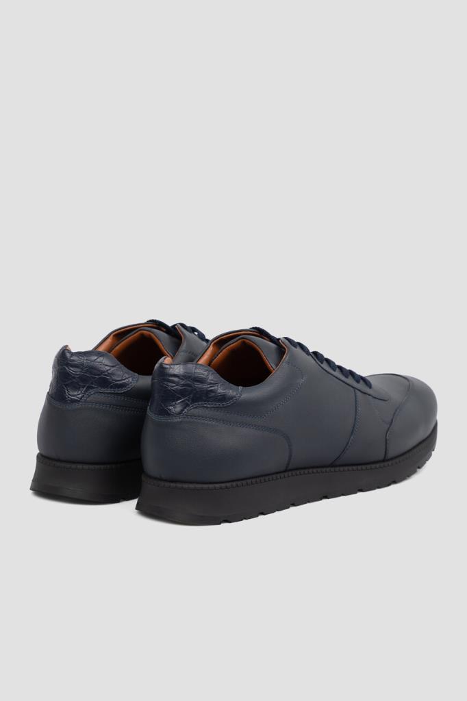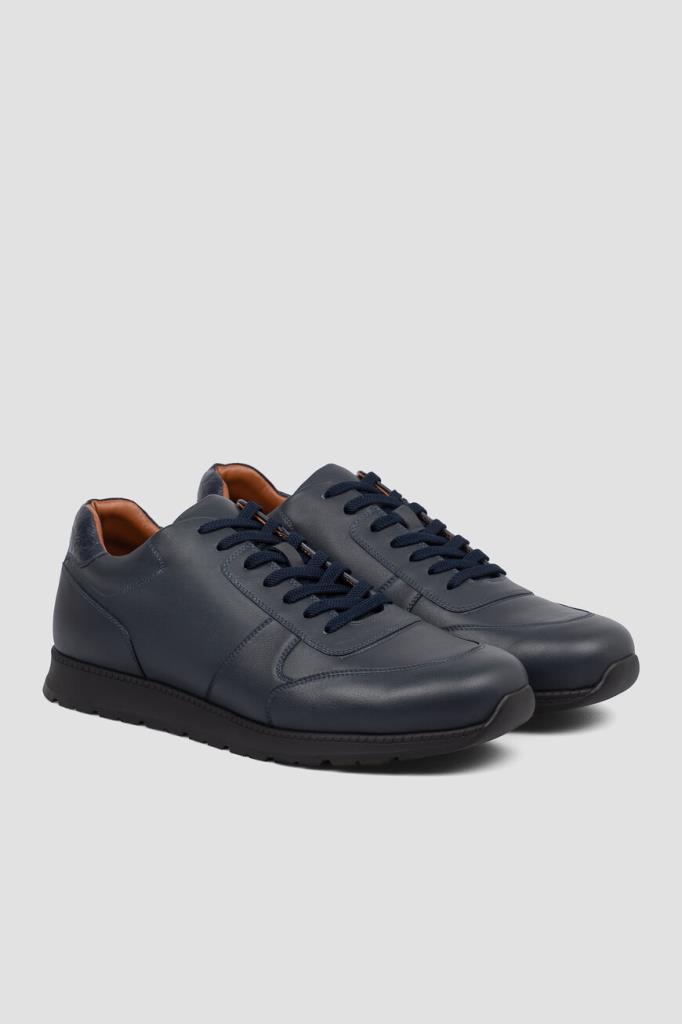 Тёмно-синие кроссовки с укреплённым округлым носком от Bardini. Модель изготовлена из мягкой телячьей кожи со вставкой из фактурной кожи крокодила на заднике в тон. Посадка обуви по ноге регулируется перекрёстной многорядной шнуровкой. Задник и язычок изделия наполнены вспененным полимерным материалом, который обеспечивает максимальный комфорт внутреннего пространства и мягкое прилегание обуви.