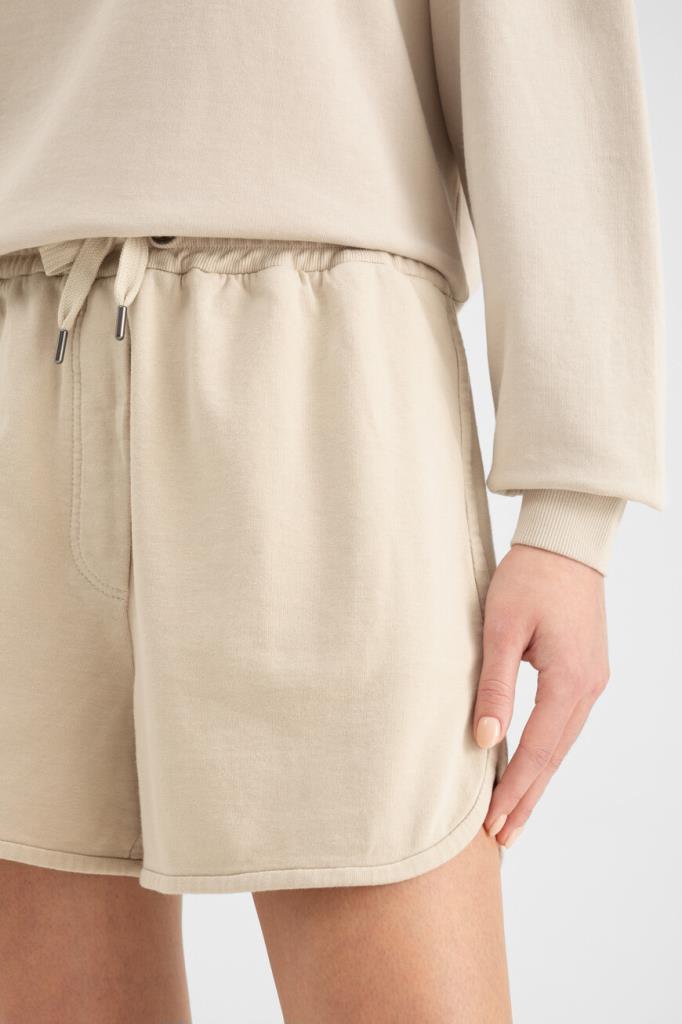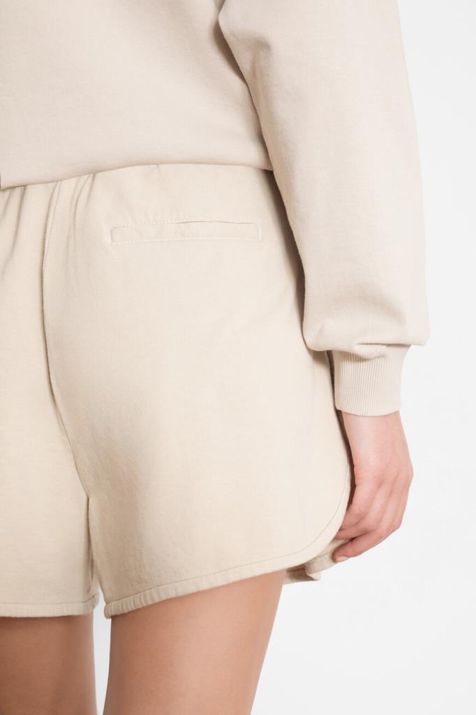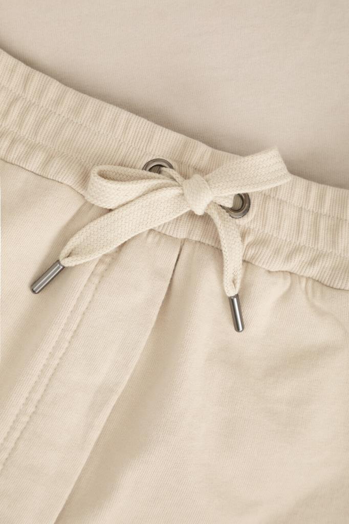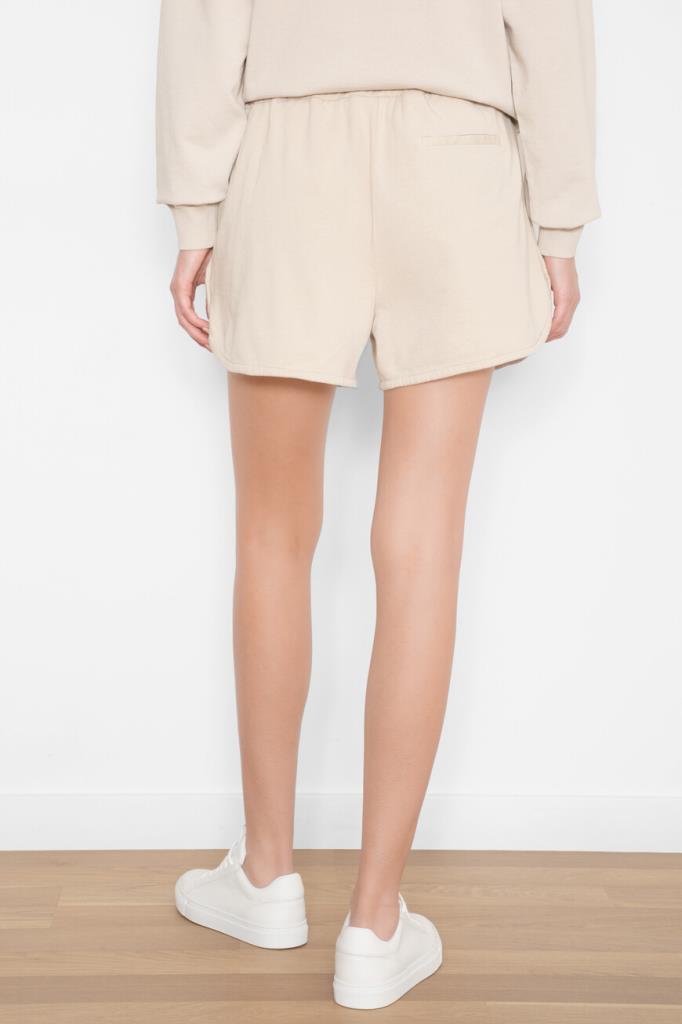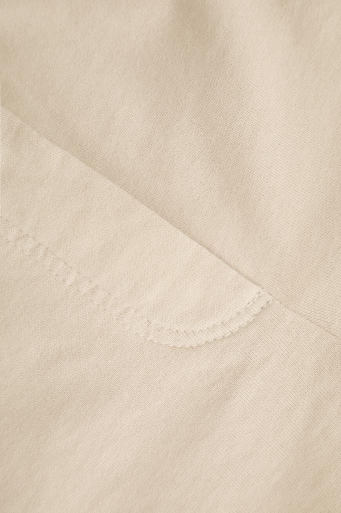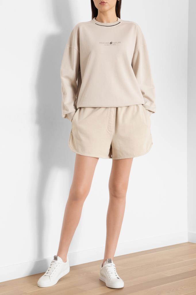 Бермуды из мягкого хлопкового флиса от BRUNELLO CUCINELLI. Изделие выполнено в песочном оттенке и дополнено широким эластичным поясом-кулиской для регулировки посадки. Отличительной особенностью короткой модели стали закруглённые разрезы снизу по бокам. Шорты смотрятся гармонично в сочетании со свитшотом свободного кроя и кожаными сникерами того же бренда.