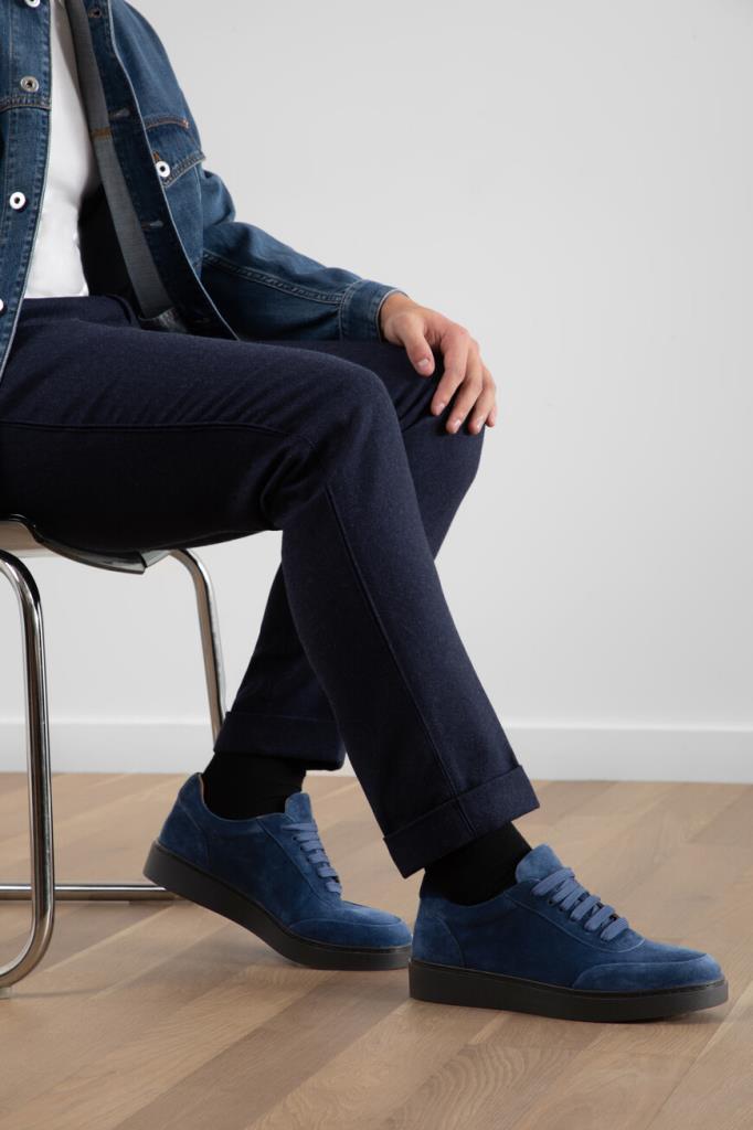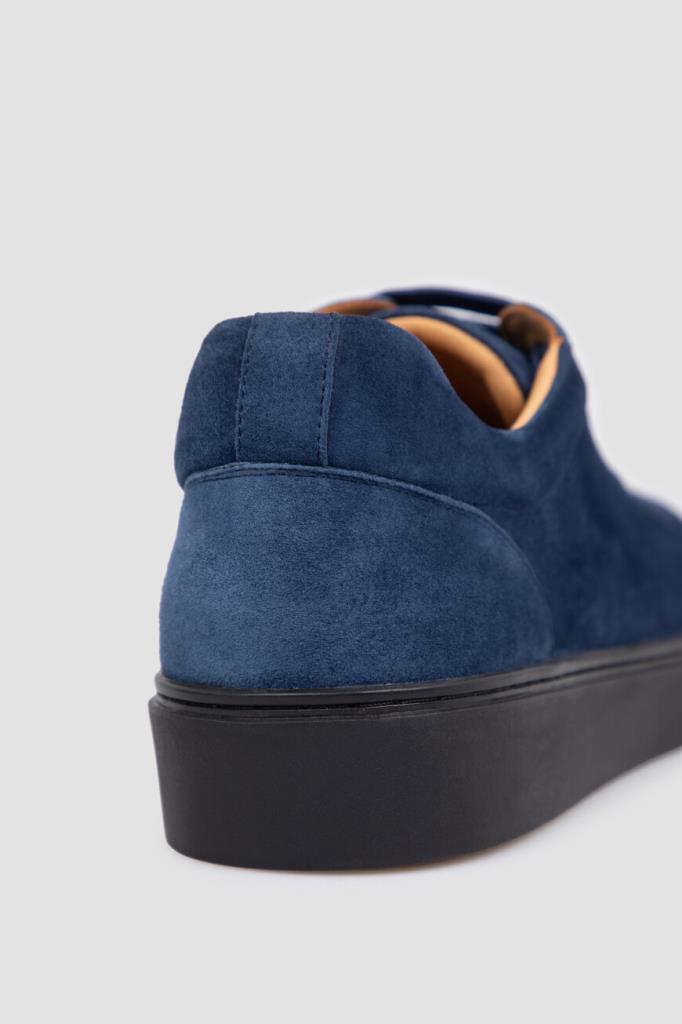 Кеды FARGONI на плоской чёрной подошве. Для создания модели выбрана бархатистая синяя замша. Кожу телёнка обработали особенно тщательно, чтобы она приобрела эластичность и при этом сохранила природную прочность, поэтому пара особенно комфортно облегает стопу. Изделие с закрытой шнуровкой отличается широкой колодкой и округлым миндалевидным носком.