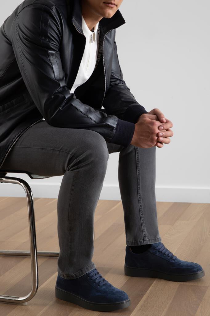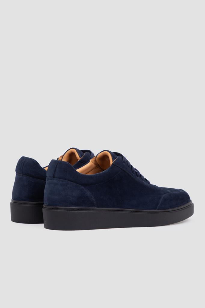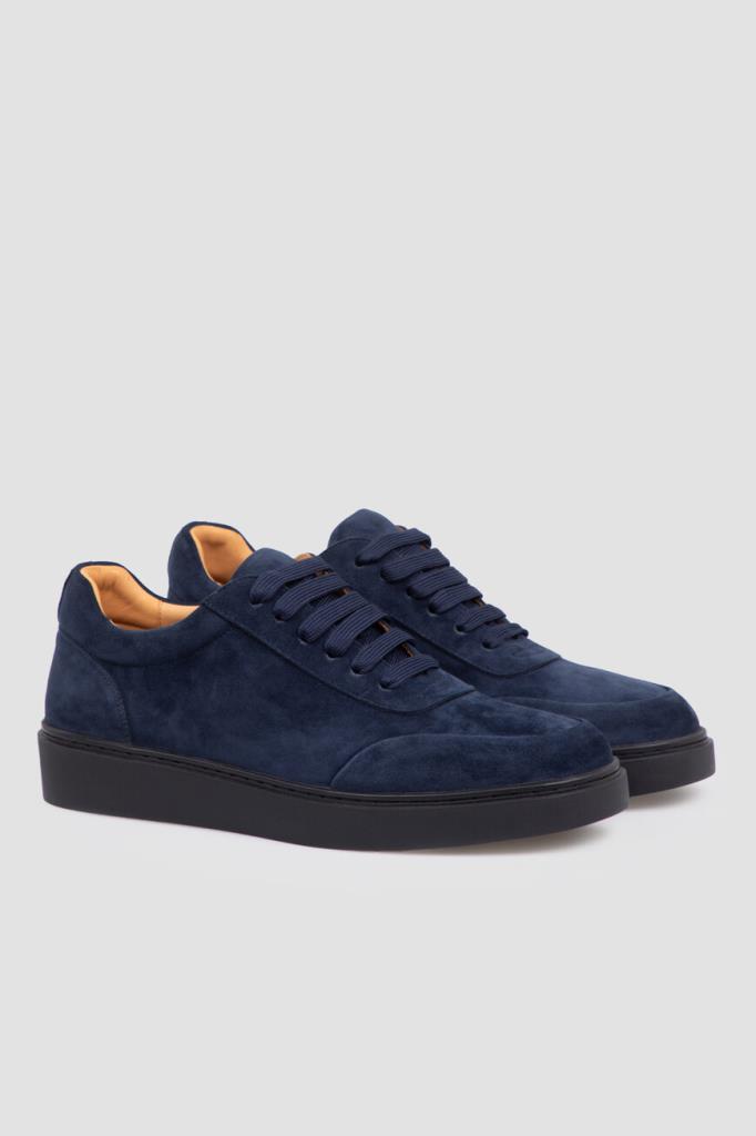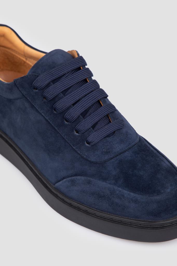 Замшевые кеды тёмно-синего цвета от FARGONI. Этот бархатистый материал слегка тянется, поэтому обувь комфортно облегает ногу. Конструкция изделия предполагает широкую колодку и плоскую закрытую шнуровку. Внутри - светло-коричневая отделка из кожи телёнка и мягкой замши. Удобная пара без декора станет неотъемлемой частью Ваших повседневных образов.
