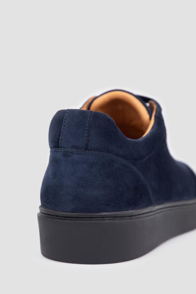 Замшевые кеды тёмно-синего цвета от FARGONI. Этот бархатистый материал слегка тянется, поэтому обувь комфортно облегает ногу. Конструкция изделия предполагает широкую колодку и плоскую закрытую шнуровку. Внутри - светло-коричневая отделка из кожи телёнка и мягкой замши. Удобная пара без декора станет неотъемлемой частью Ваших повседневных образов.