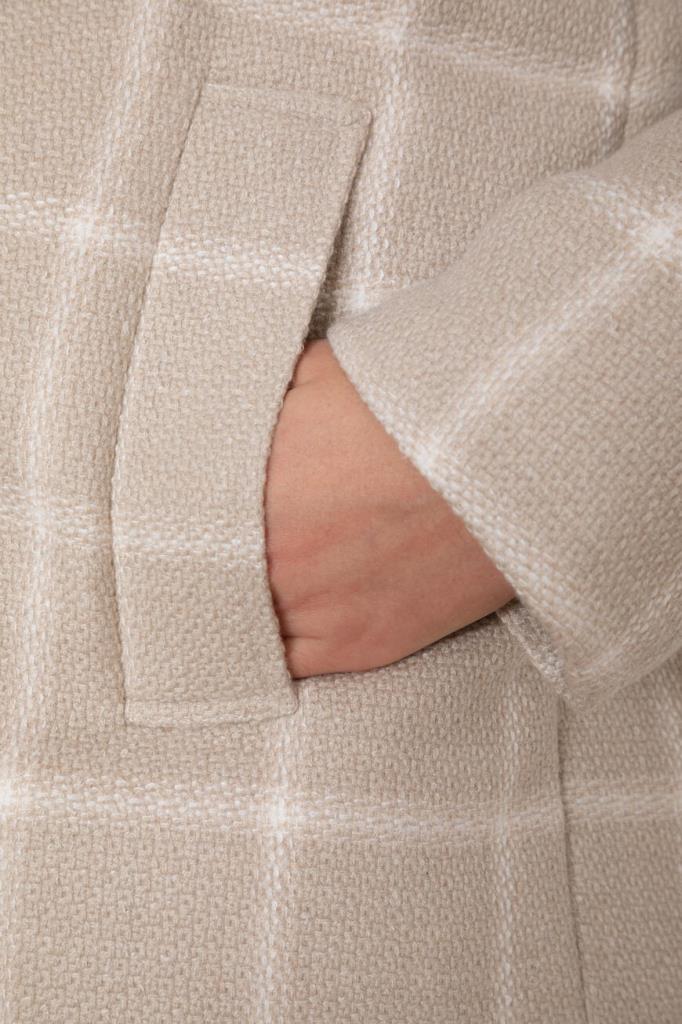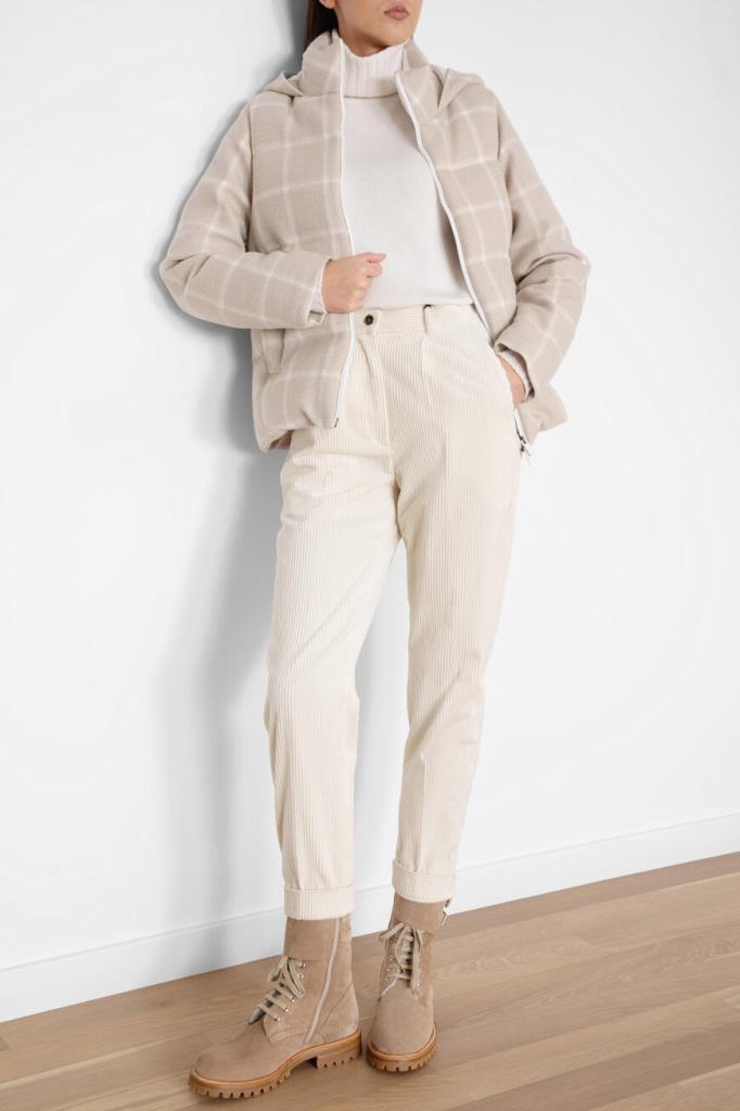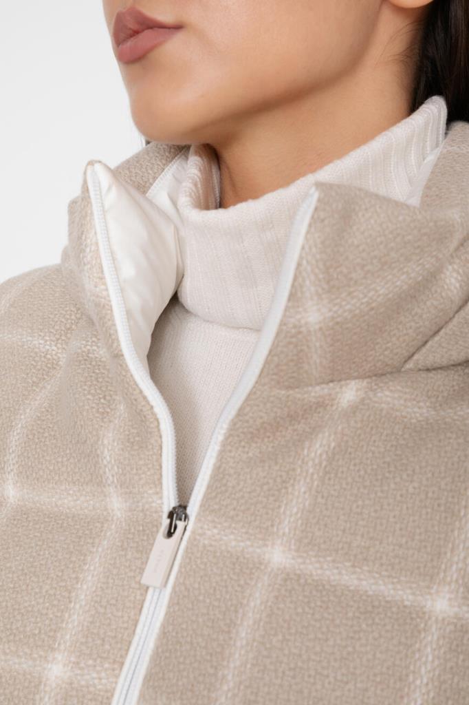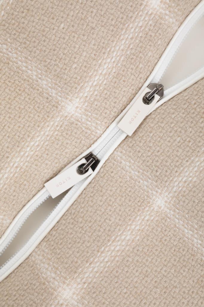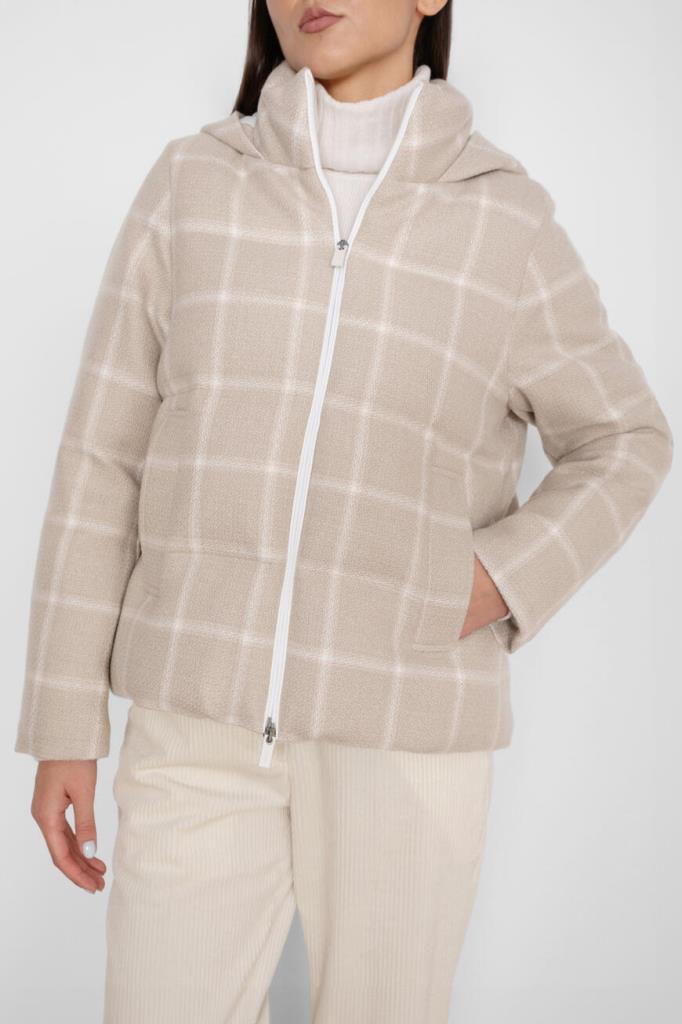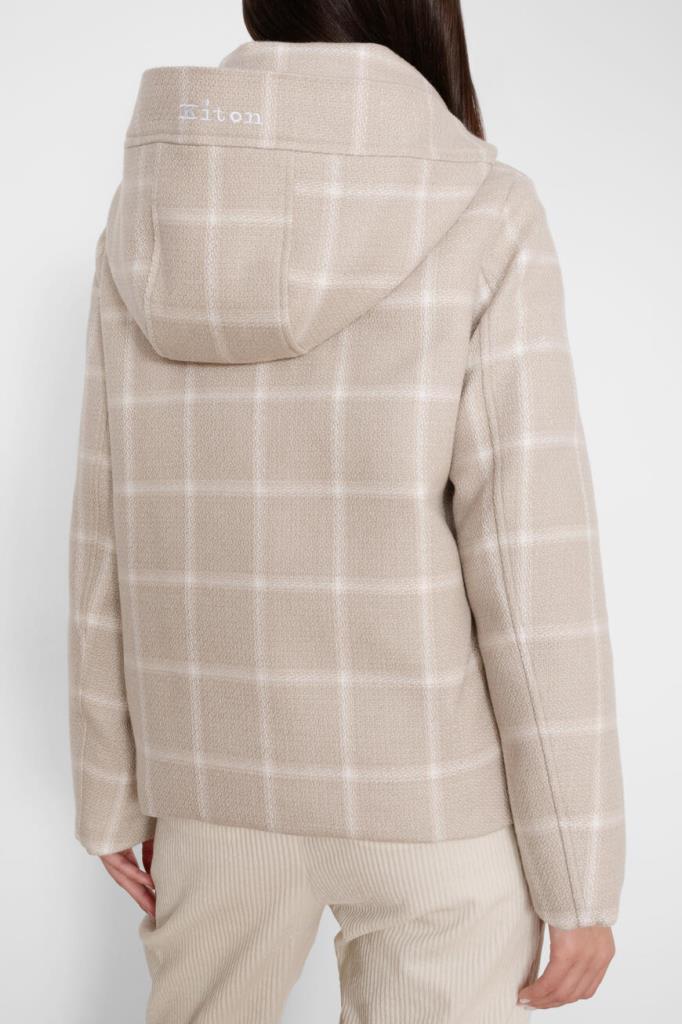 Клетчатая куртка Kiton с фактурным геометрическим узором. Для пошива модели используется мягкий трикотаж на основе натуральной шерсти virgin, кашемира, гладкого шёлка и льна светло-бежевого оттенка. Отличительная деталь - вышитый белый логотип на объёмном капюшоне.