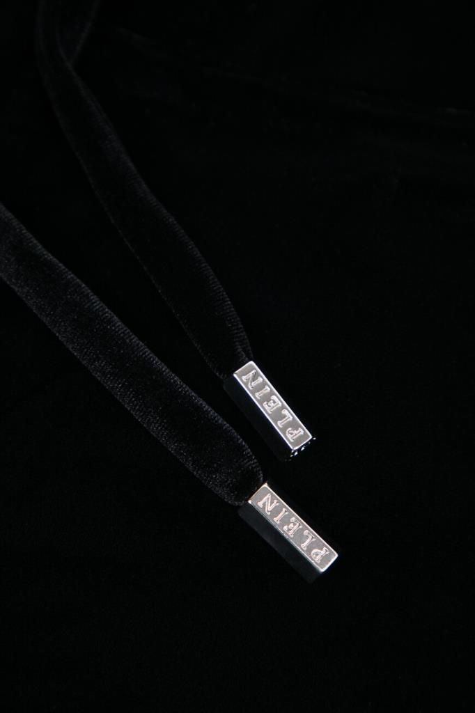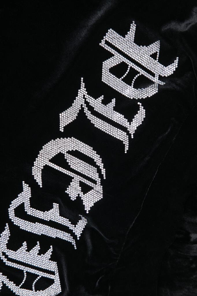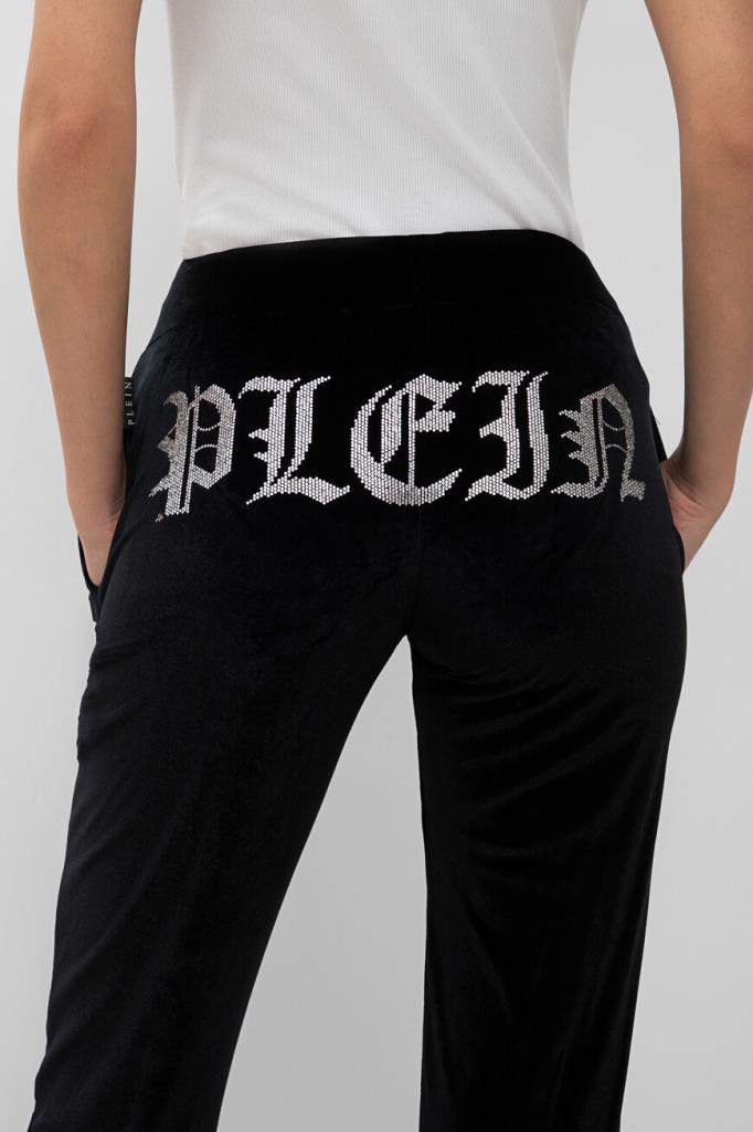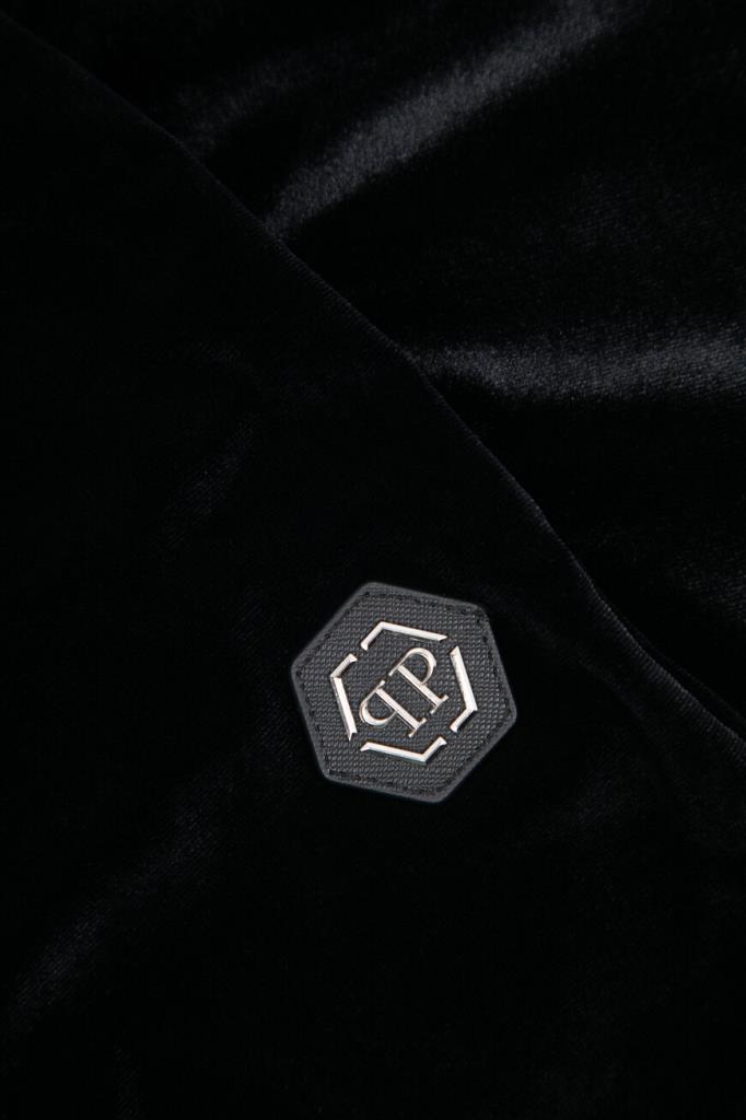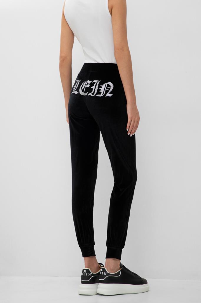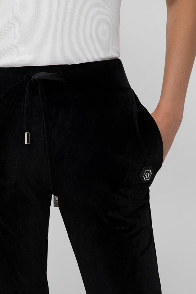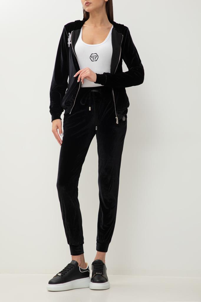 Чёрные джоггеры PHILIPP PLEIN с бархатистой поверхностью. Модель изготовлена из мягкой эластичной синели и оснащена широким поясом на завязках для регулировки посадки. На принадлежность изделия свободного силуэта бренду указывают крупная надпись «Plein», выполненная в готическом стиле из блестящих переливающихся страз и нашивка из сафьяновой кожи PP Hexagon с металлической монограммой в центре. Спортивные брюки составят идеальный комплект с толстовкой с глубоким капюшоном из той же коллекции.