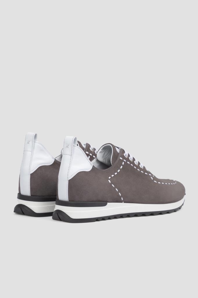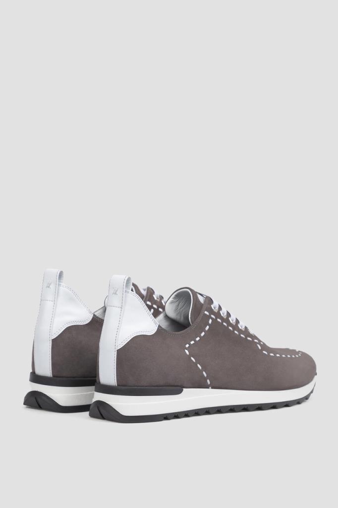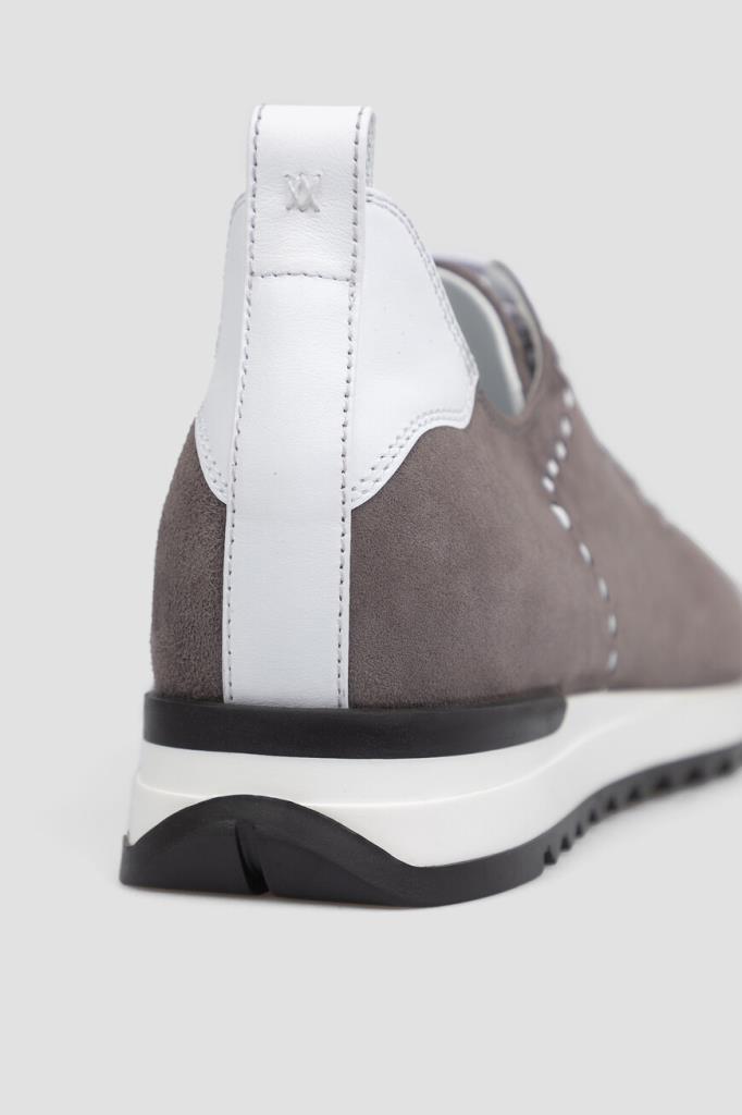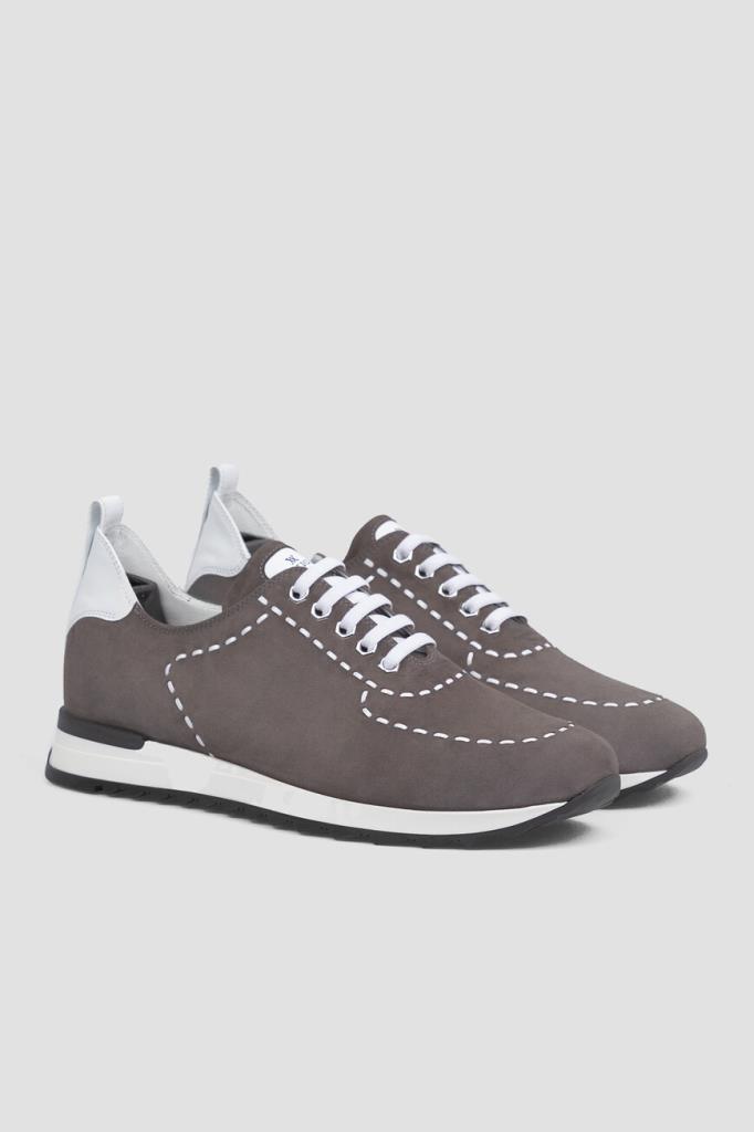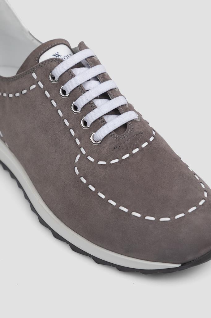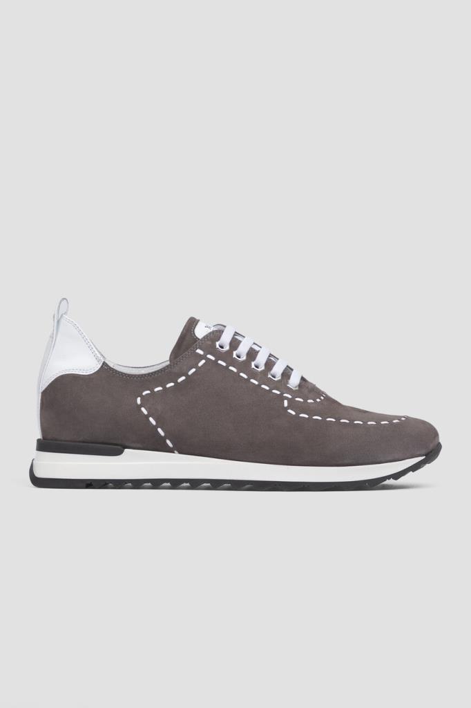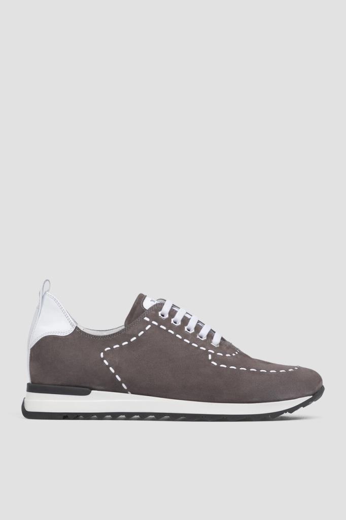 Сникеры с широкой колодкой от бренда Artioli. Пара изготовлена из мягкой бархатистой замши серого цвета. Декором выступают белые кожаные вставка на заднике и строчка-пунктир на носке, уровне планки шнуровки и боковинах. Посадка изделия по ноге регулируется закрытой белой шнуровкой. При создании модели традиционный ручной труд мастеров сочетался с инновационными технологиями.