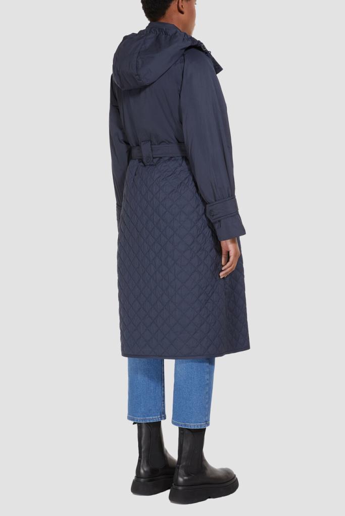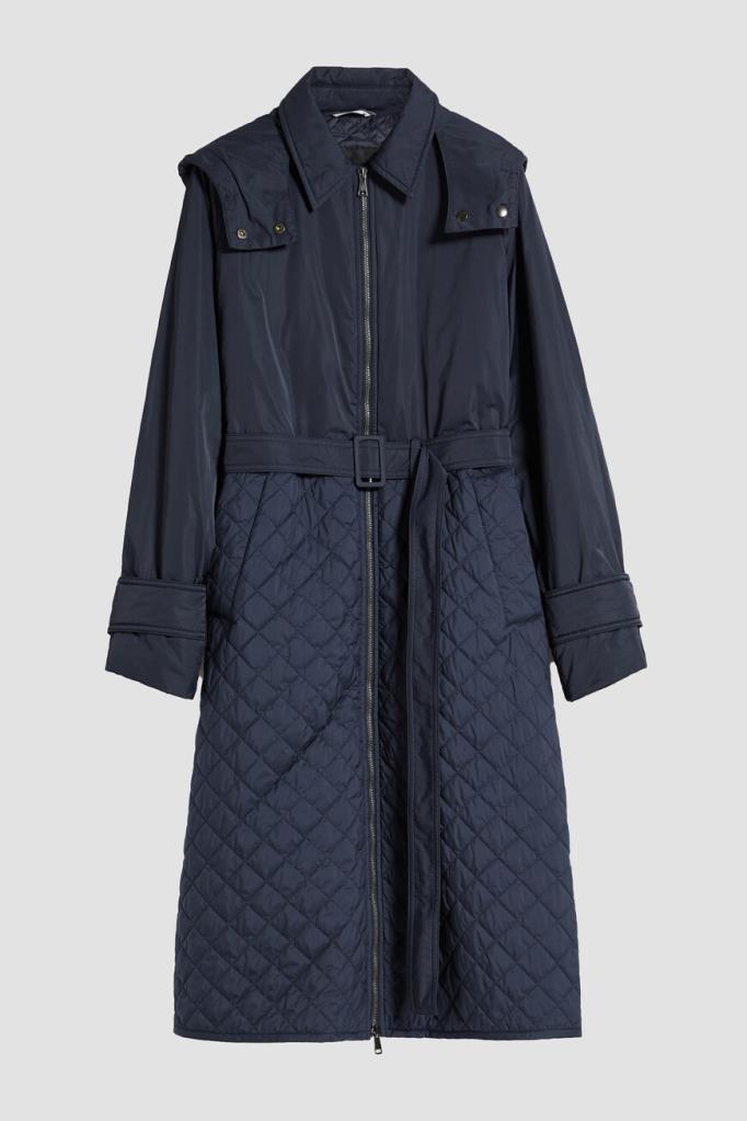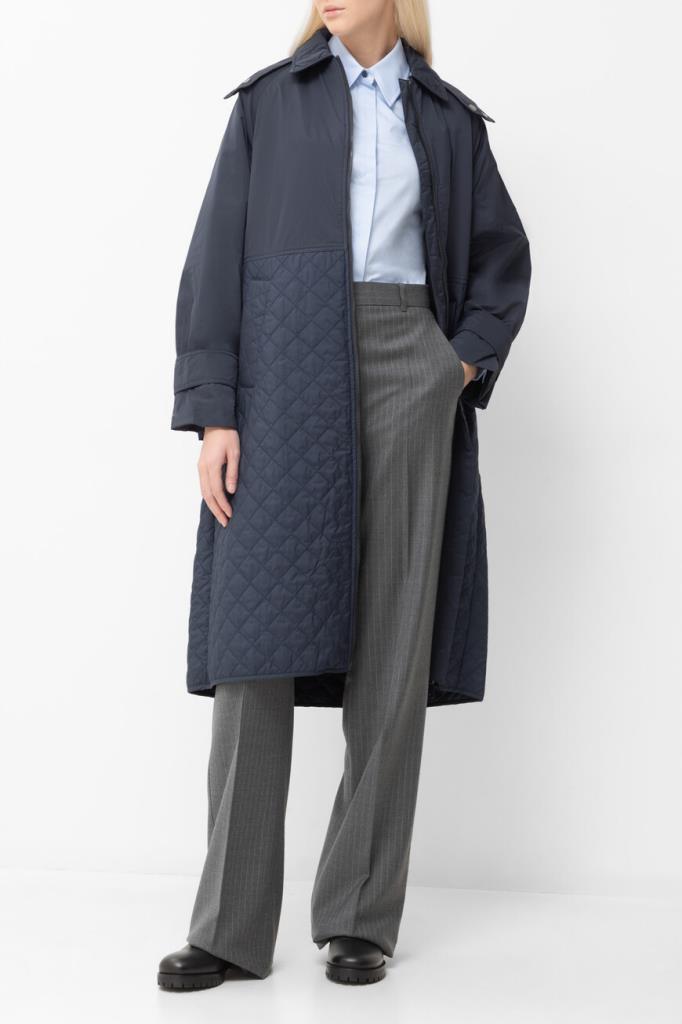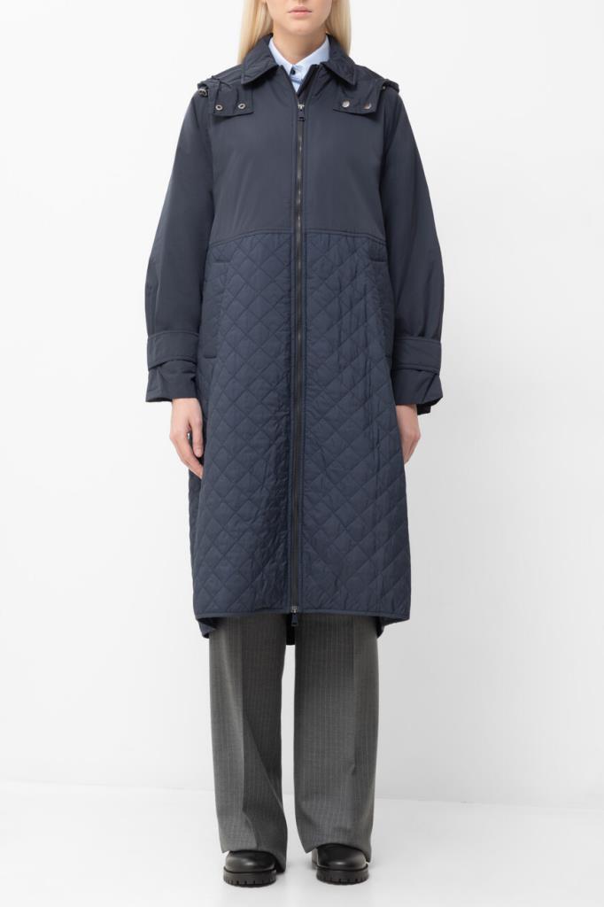 Утеплённое пальто из водонепроницаемой ткани от Max Mara. Нижняя часть изделия дополнена ромбовидной стёжкой, придающей объём. Посадку удобно регулировать при помощи широкого пояса с пряжкой в тон. Модель тёмно-синего цвета с рубашечным воротником станет подходящим вариантом для переменчивой погоды: прочный нейлон не продувается ветром и не промокает, а наполнитель LUXEPAD® на основе натуральной верблюжьей шерсти, гладкого шёлка и полиэфира хорошо сохраняет тепло.