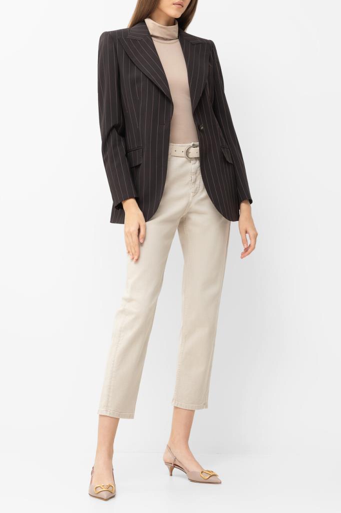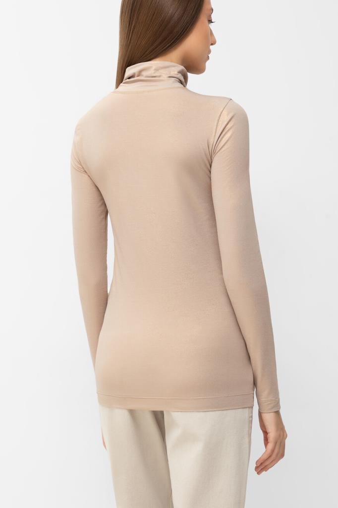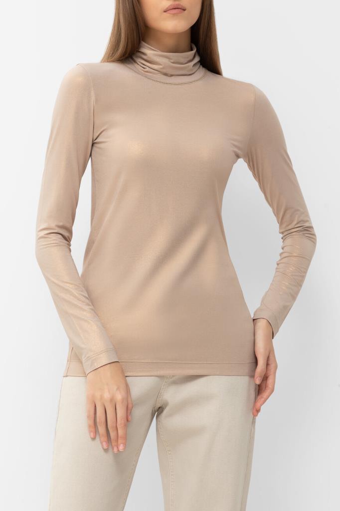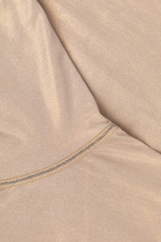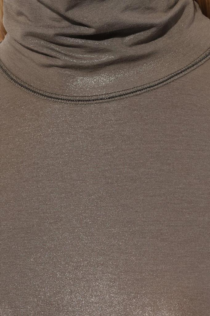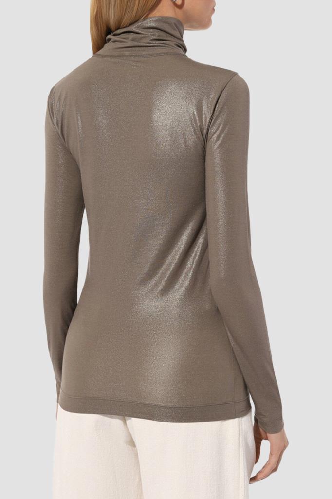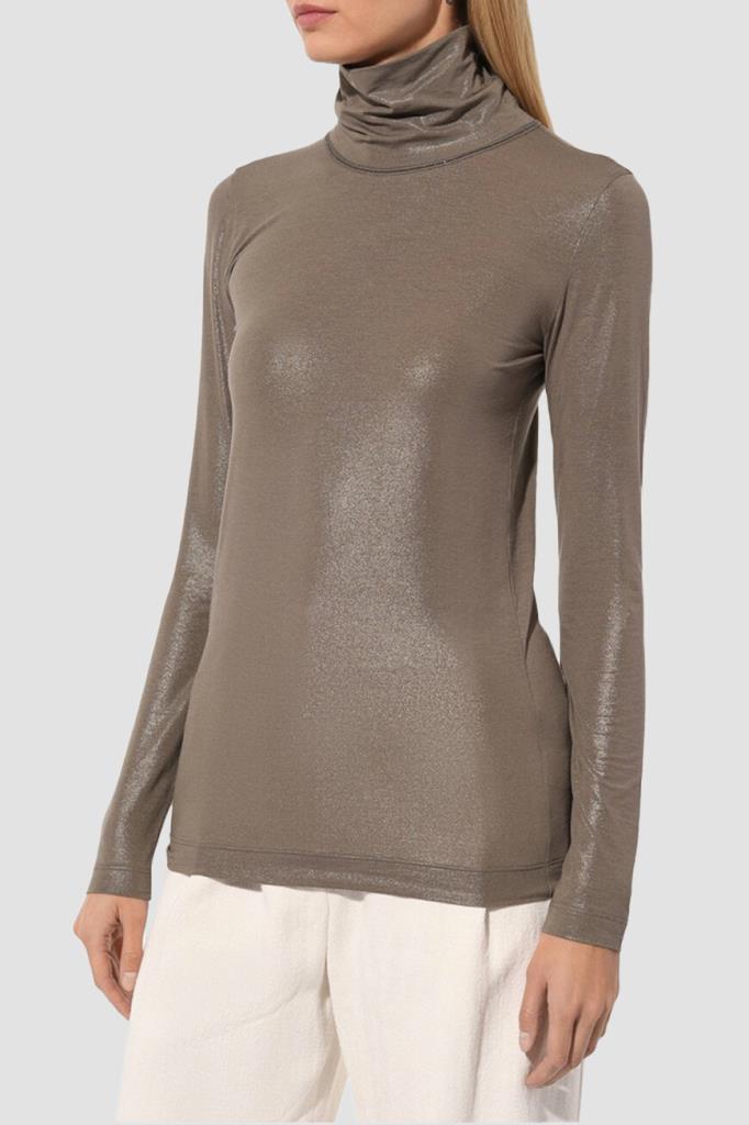 Облегающая водолазка из тонкого блестящего трикотажа от BRUNELLO CUCINELLI. Изделие выполнено из смеси хлопка и вискозного волокна, укреплённой эластановыми нитями. Особенностями модели прилегающего силуэта стали жидкая драпировка, эффект ламинирования и украшение-полоса из блестящей серебристой цепочки Мониль вдоль нижнего края высокого воротника.