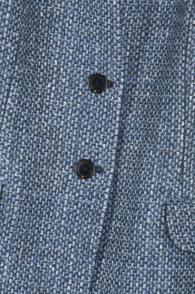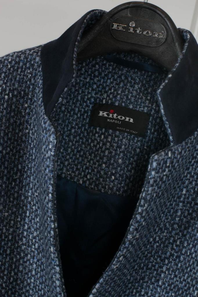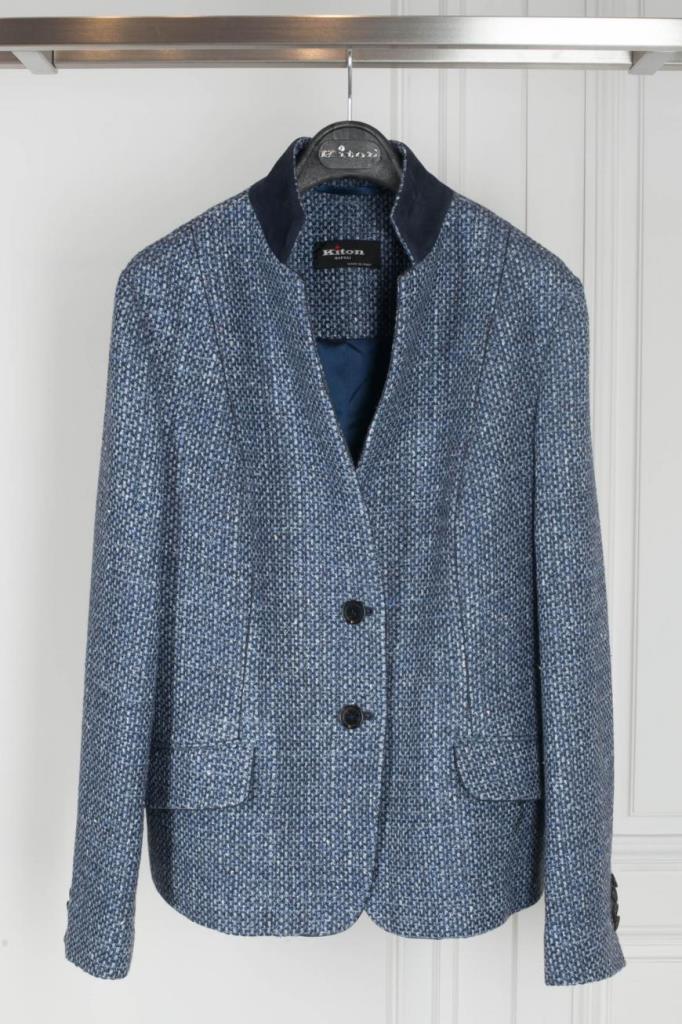 Женский однобортный жакет от Kiton. Изготовлен из смеси шелка, шерсти и кашемира. Ткань крупно-фактурного плетения с меланжевым узором в синих тонах. Модель приталенного кроя, с длинными рукавами и застёжкой на две брендированные пуговицы. Обратная сторона отложного воротника отделана натуральной замшей.