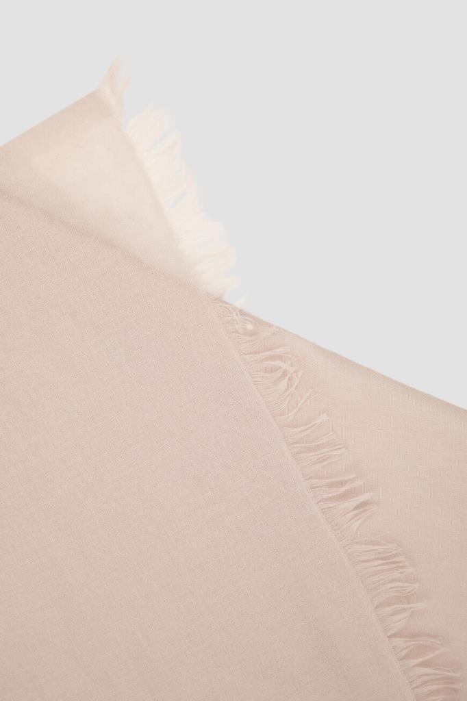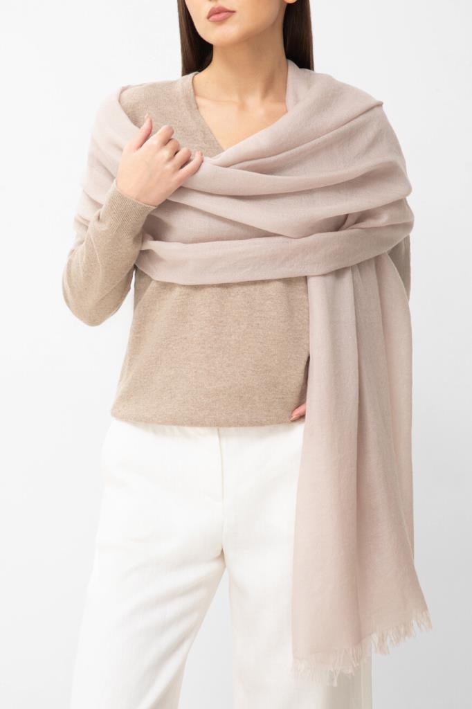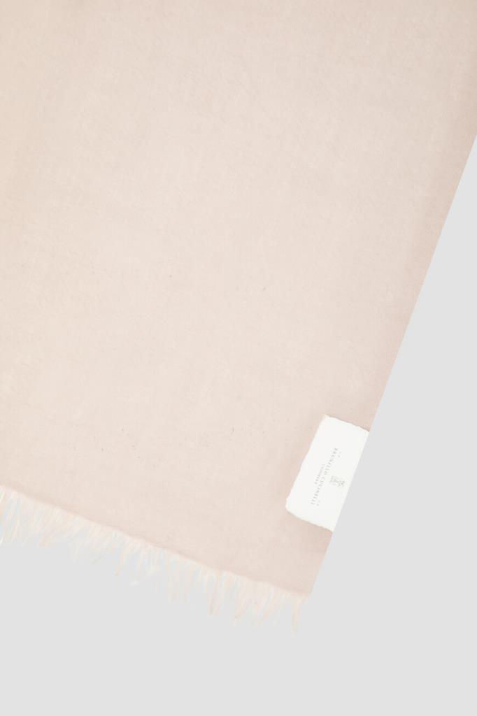 Однотонный шарф Brunello Cucinelli - универсальный аксессуар на каждый день. Бледно-розовая модель с короткой бахромой по узкому краю изготовлена из тонкого невесомого кашемира с добавлением гладкого шёлка. Прочный аксессуар, который можно накинуть на плечи, обернуть вокруг шеи или завязать объёмным сложным узлом, красиво драпируется и почти не ощущается на теле. Изделие станет завершающим штрихом в образе любой палитры.