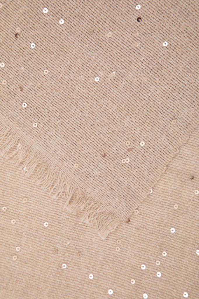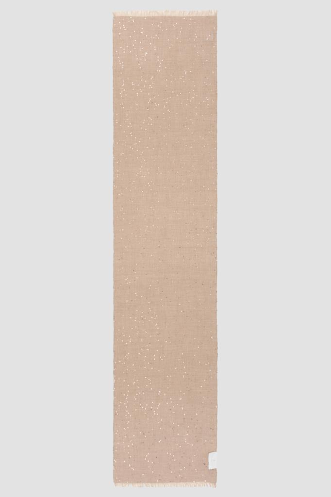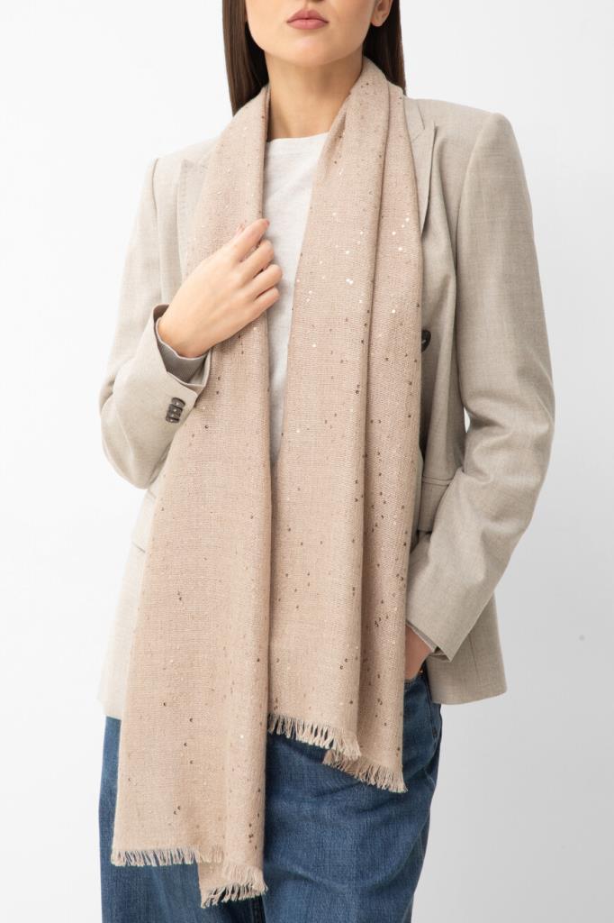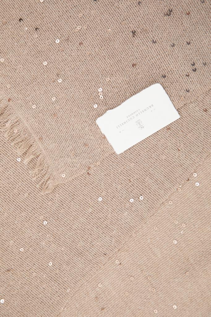Светло-коричневый шарф Brunello Cucinelli с сияющим декором. Аксессуар из мягкого тончайшего кашемира, укреплённого премиальным шёлком, сделает элегантнее Ваш повседневный образ. Тон задаст блеск миниатюрных пайеток, которыми инкрустировали длинную широкую модель с необработанными краями. Изделие не потеряет форму и долго будет выглядеть безупречно.