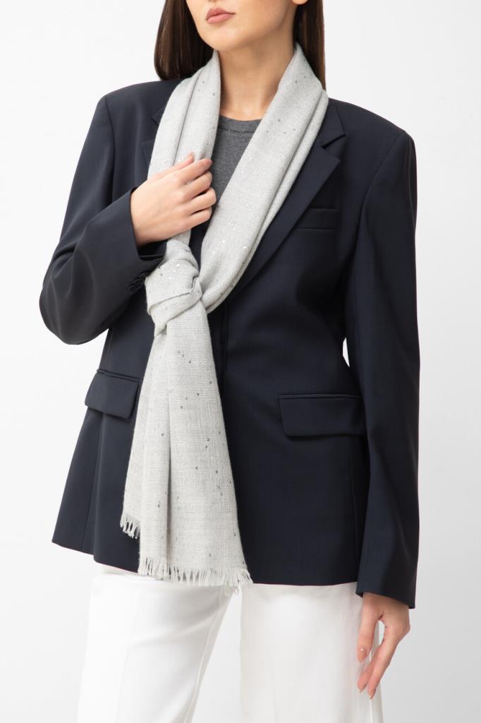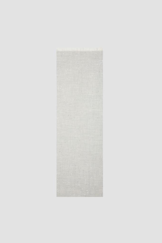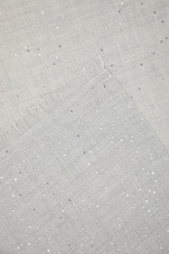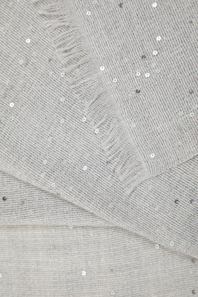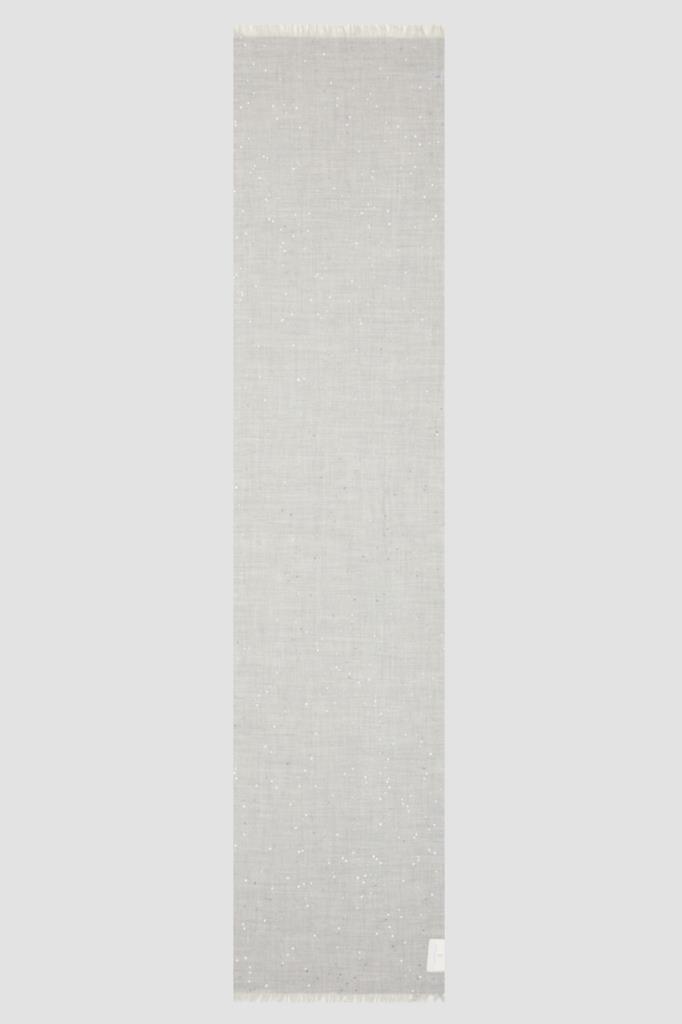 Полупрозрачный шарф серого цвета от Brunello Cucinelli. Длинная модель из почти невесомой ткани на основе кашемира и гладкого шёлка отличается сияющим декором: нанизанные на премиальную шелковую нить микропайетки придают аксессуару деликатное мерцание. Узкий край изделия дополнен короткой бахромой.