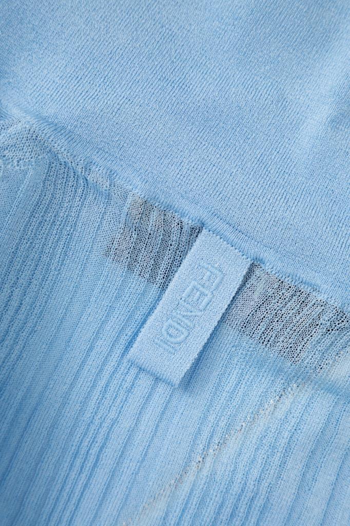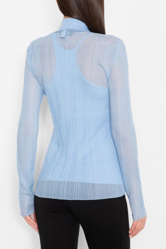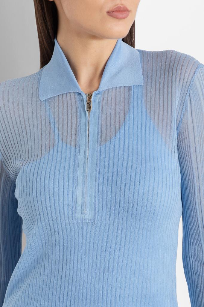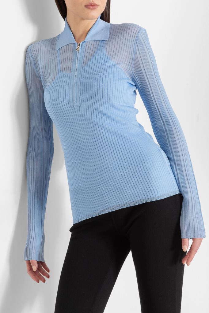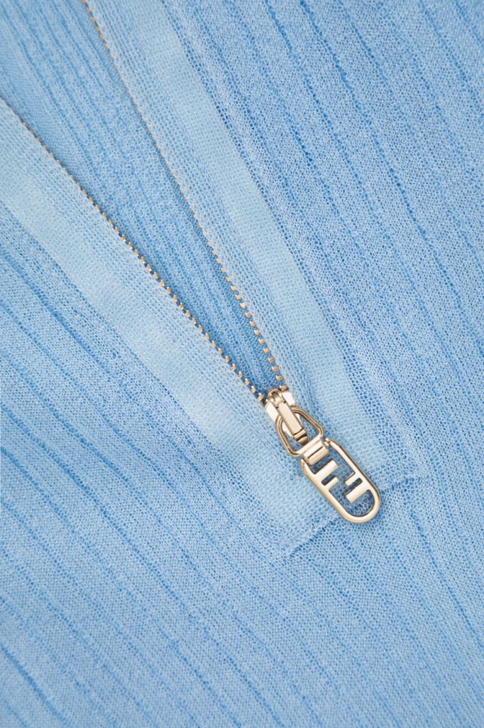 Голубое шелковое поло Fendi — находка для креативных образов. Модель выполнена из полупрозрачного трикотажа с фактурным узором в полоску. Поло с длинными рукавами и горловиной на молнии дополнено топом, который надевается первым слоем. Эластичный шелковый трикотаж мягко облегает фигуру и не ограничивает свободу движений.