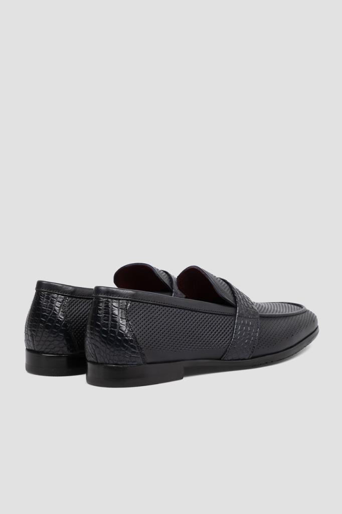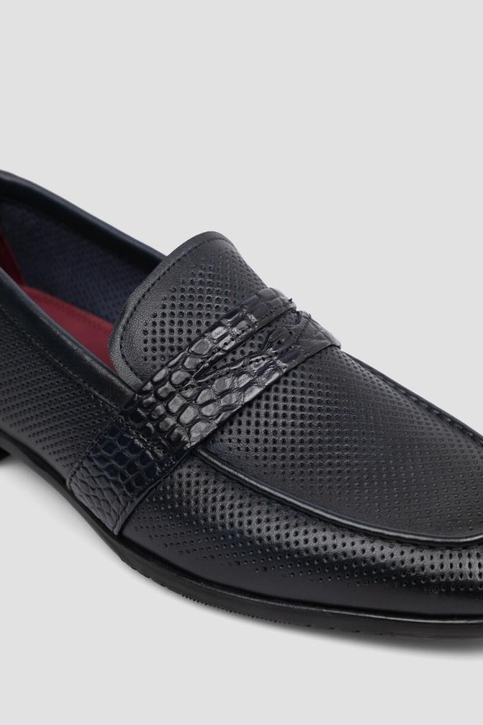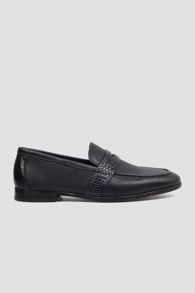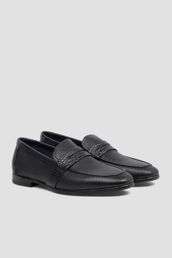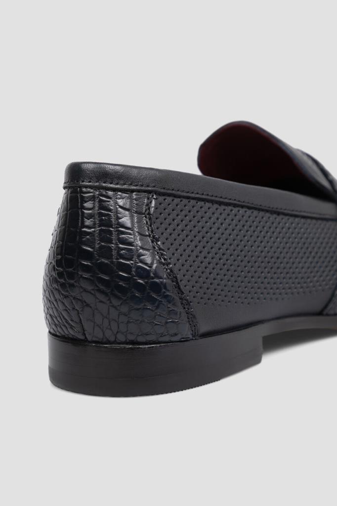 Перфорированные лоферы с широкой колодкой от FARGONI. Для изготовления удобной пары выбрана мягкая телячья кожа тёмно-синего цвета. Декором выступают вставки из фактурной кожи крокодила на мыске и заднике. Изделие с классическим поперечным ремешком с прорезью в тон дополнит Ваш образ интересной нотой.