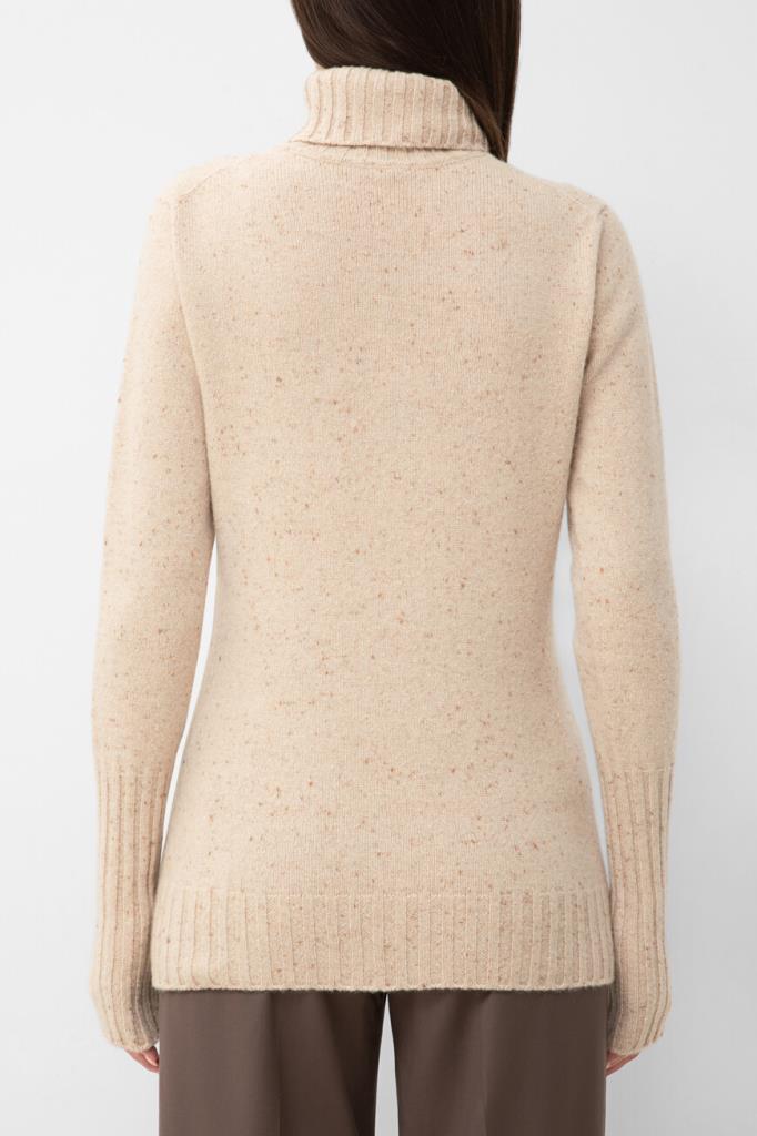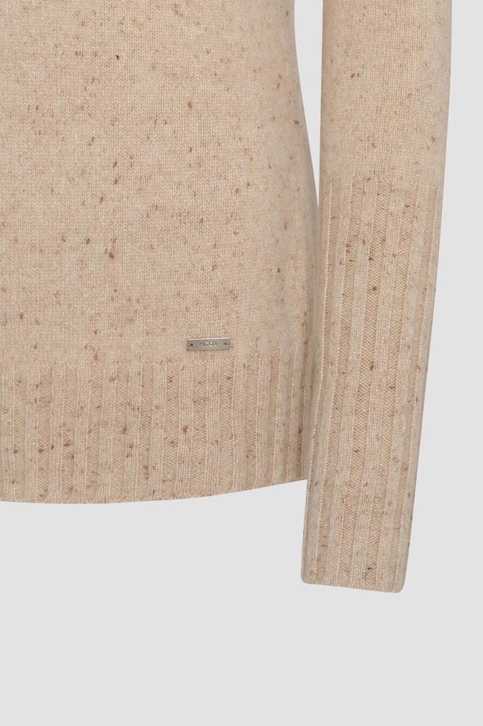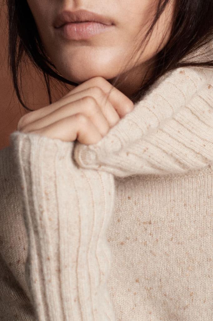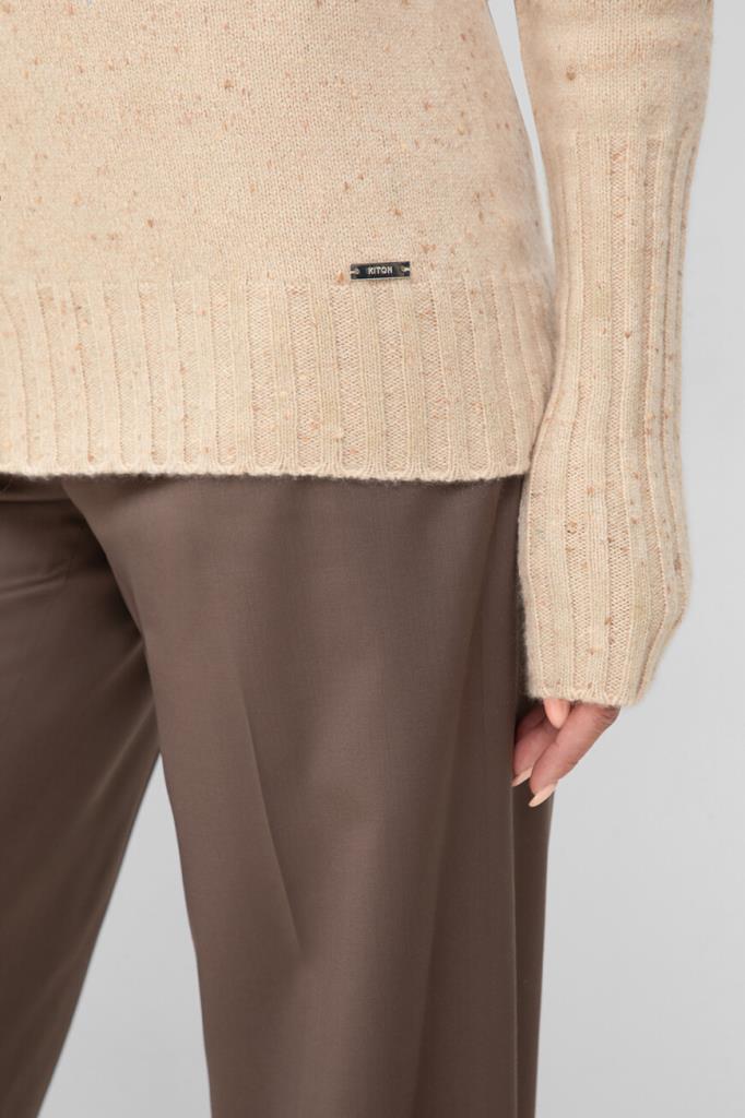 Вязаный свитер светло-бежевого оттенка от бренда Kiton. Изделие выполнено из тонкого кашемира, обработанного для исключительной нежности, поэтому модель получилась почти невесомой и комфортной. Пух для него вычесали у горных коз, обитающих в суровом климате с большими перепадами температур, поэтому в свитере будет комфортно и в помещении, и на улице. Чтобы создать такую лёгкую бесшовную модель с высоким воротом, как у водолазки, было произведено 22 операции, причём половина — исключительно вручную.