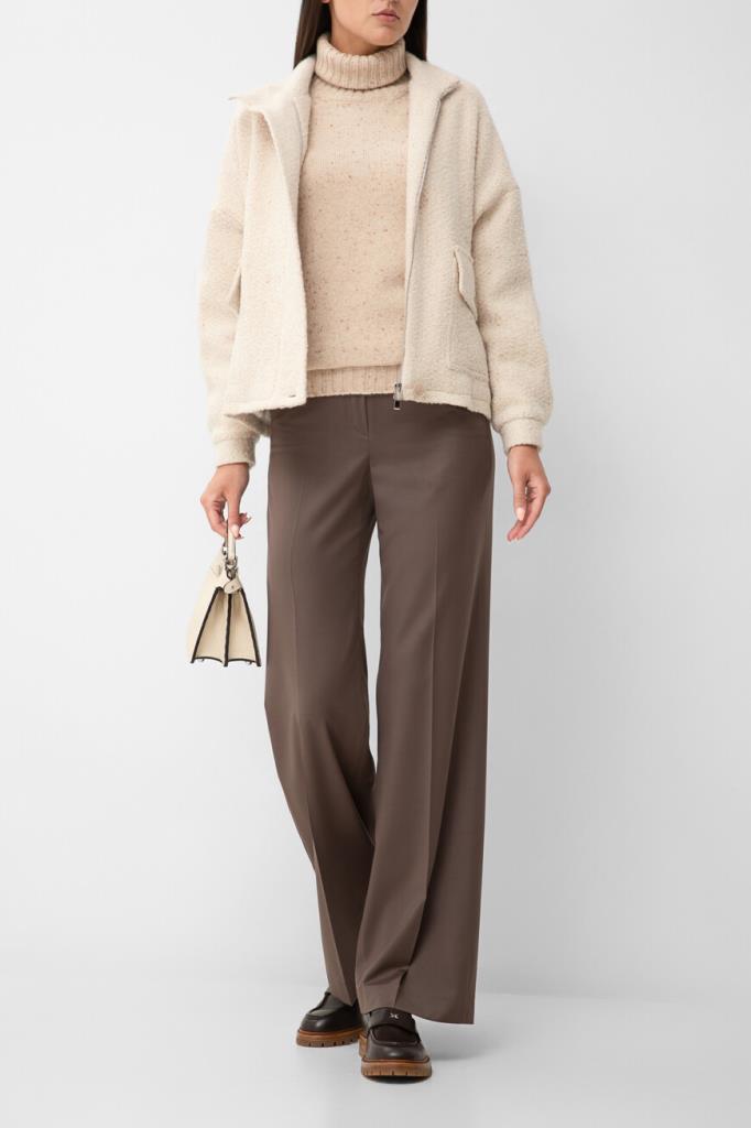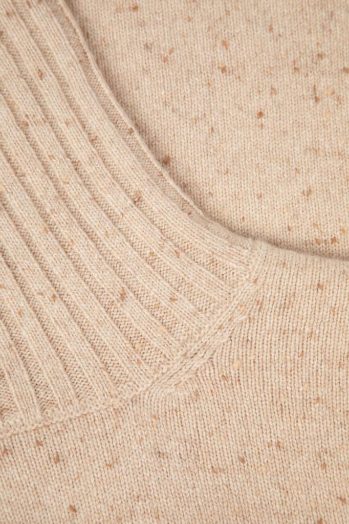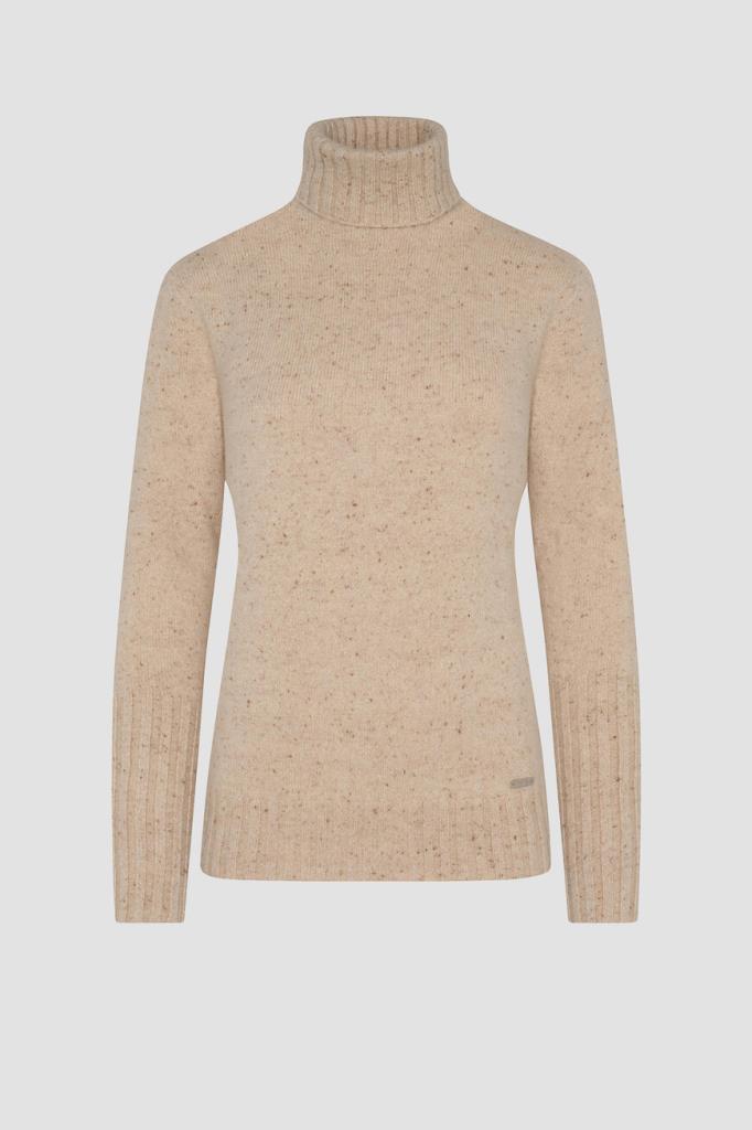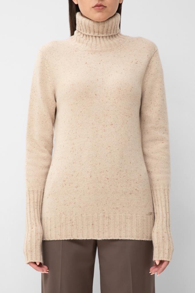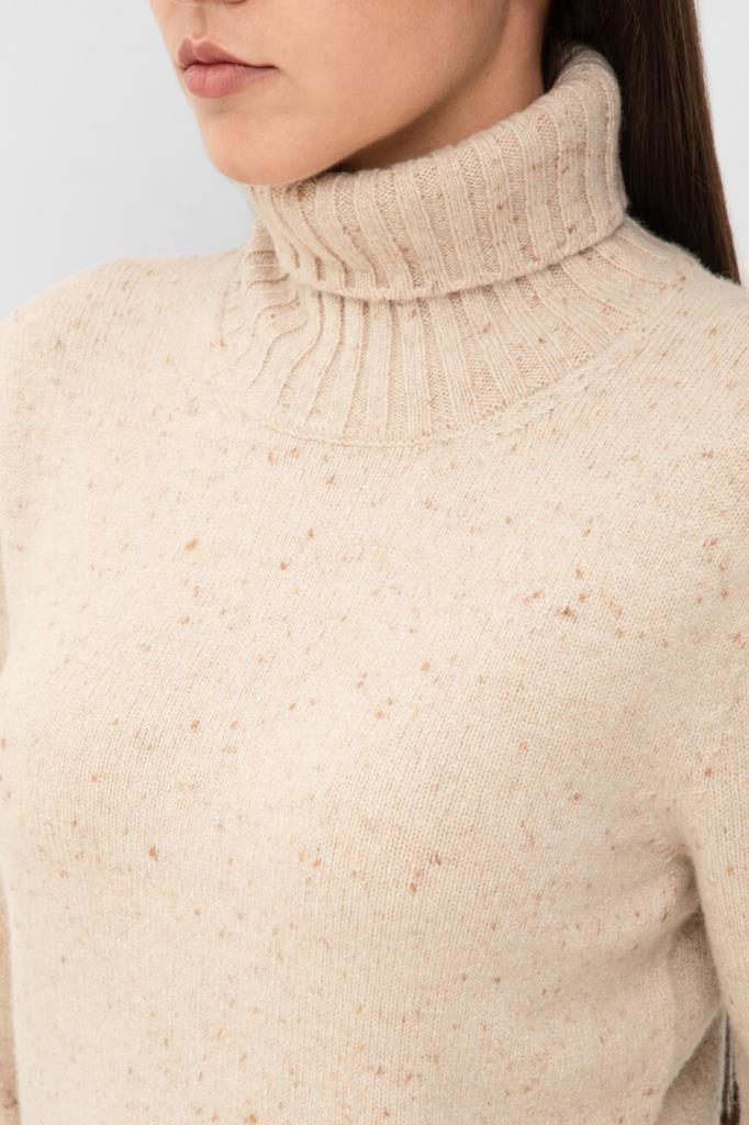 Вязаный свитер светло-бежевого оттенка от бренда Kiton. Изделие выполнено из тонкого кашемира, обработанного для исключительной нежности, поэтому модель получилась почти невесомой и комфортной. Пух для него вычесали у горных коз, обитающих в суровом климате с большими перепадами температур, поэтому в свитере будет комфортно и в помещении, и на улице. Чтобы создать такую лёгкую бесшовную модель с высоким воротом, как у водолазки, было произведено 22 операции, причём половина — исключительно вручную.