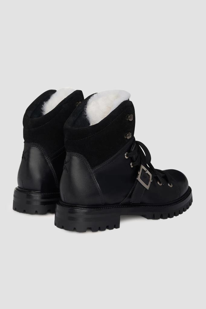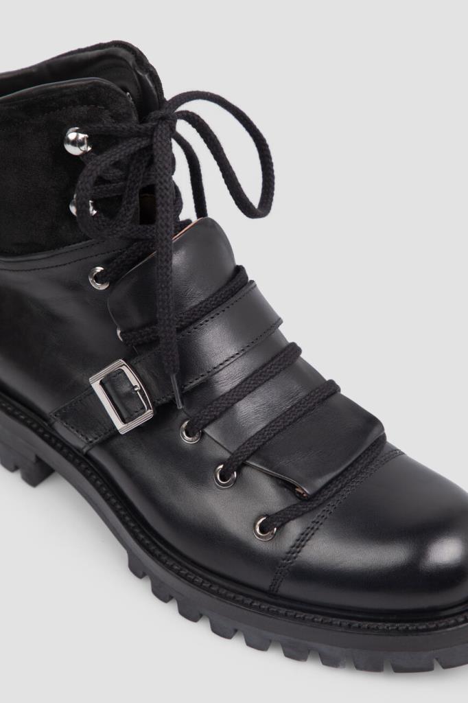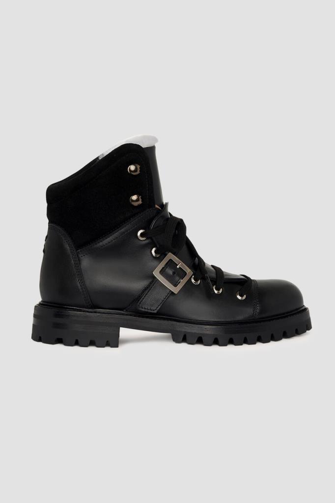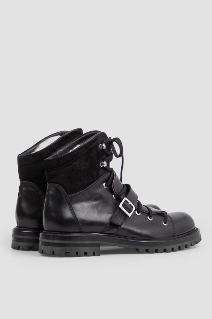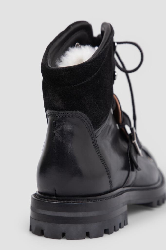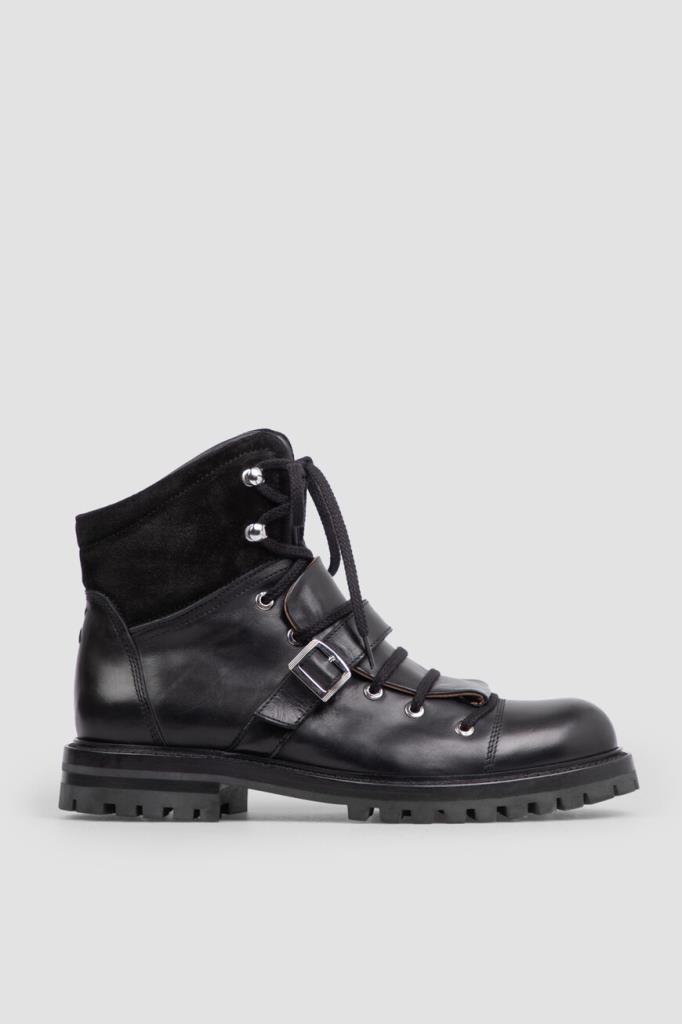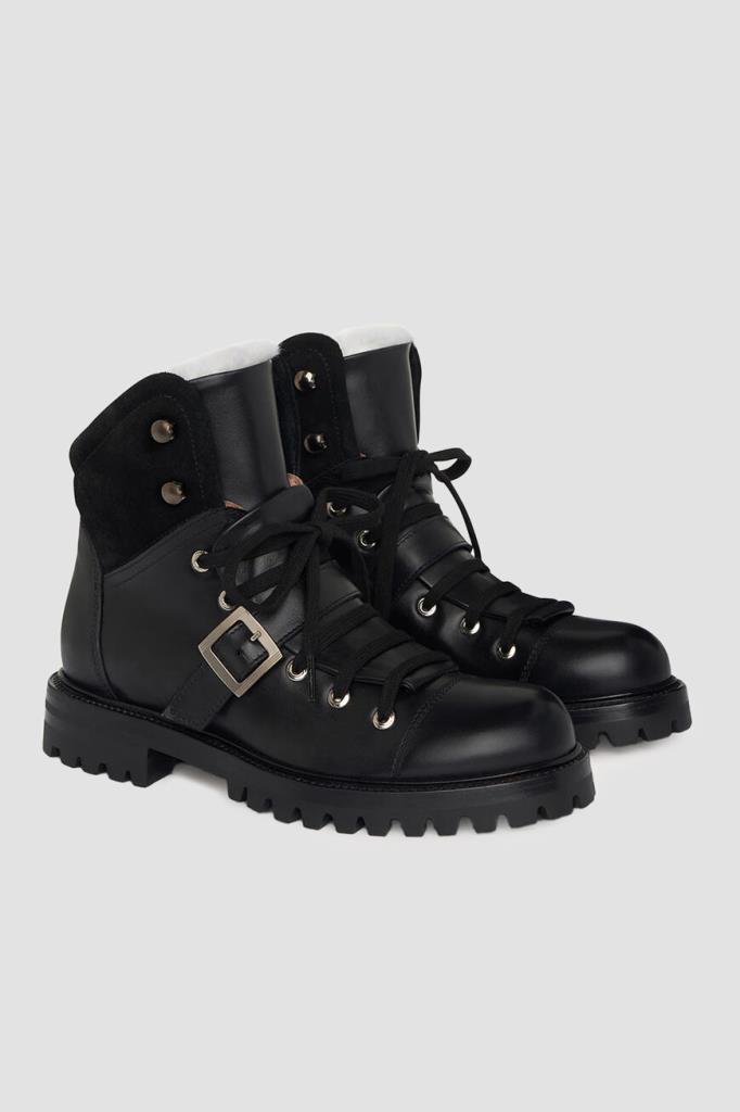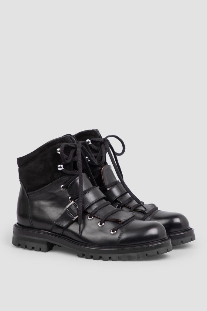 Чёрные кожаные ботинки Kiton добавят образу маскулинность. Для изготовления удобной пары используется прочная гладкая кожа ягнёнка, отполированная до деликатного блеска. Этому материалу противопоставлена бархатистая вставка в тон на голенище. Модель с усиленной шнуровкой, как у трекинговой обуви, и протекторной подошвой дополнена широким ремешком с серебристой квадратной пряжкой, который опоясывает союзку.