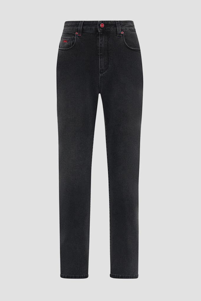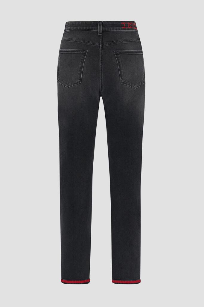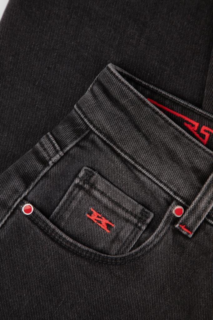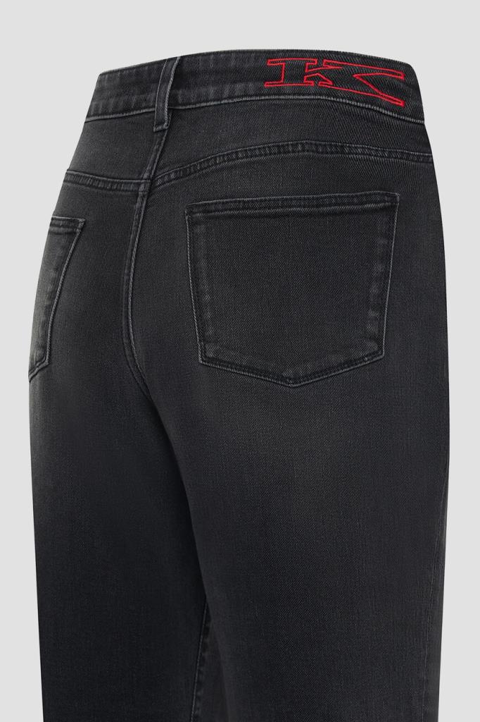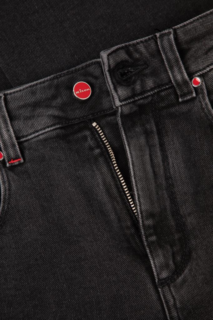 Чёрные джинсы Kiton с дизайнерскими потёртостями. Изделие высокой посадки изготовлено из плотного хлопкового денима стрейч с пятью карманами. Атрибутами Дома стали вышитые ярко-красные литеры «K» на маленьком кармане спереди и поясе сзади и во внутренней части.