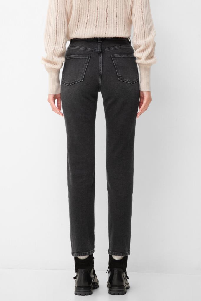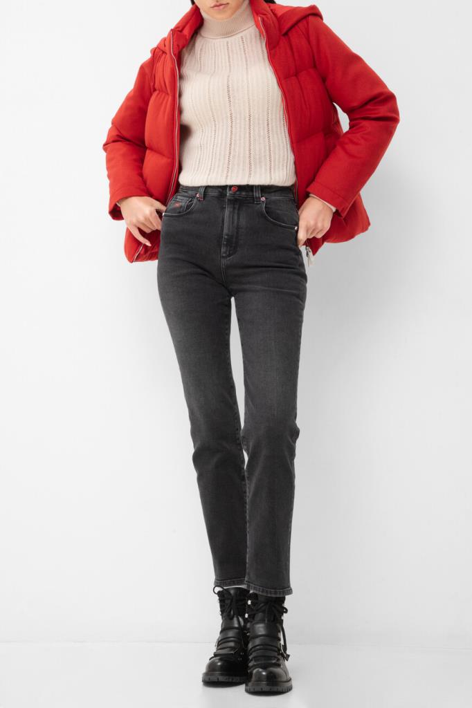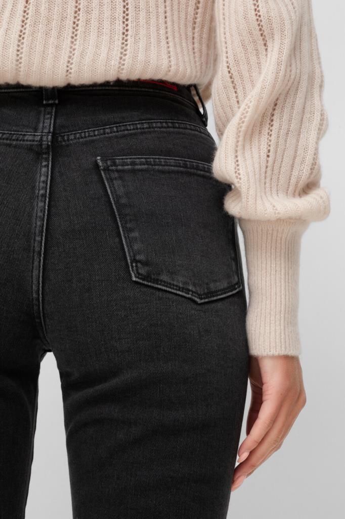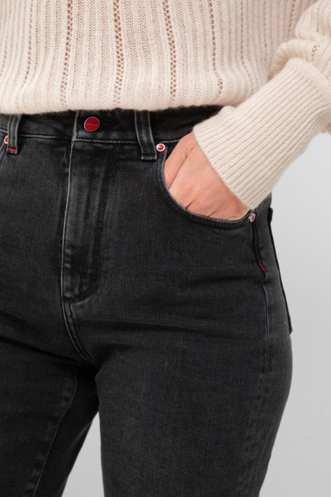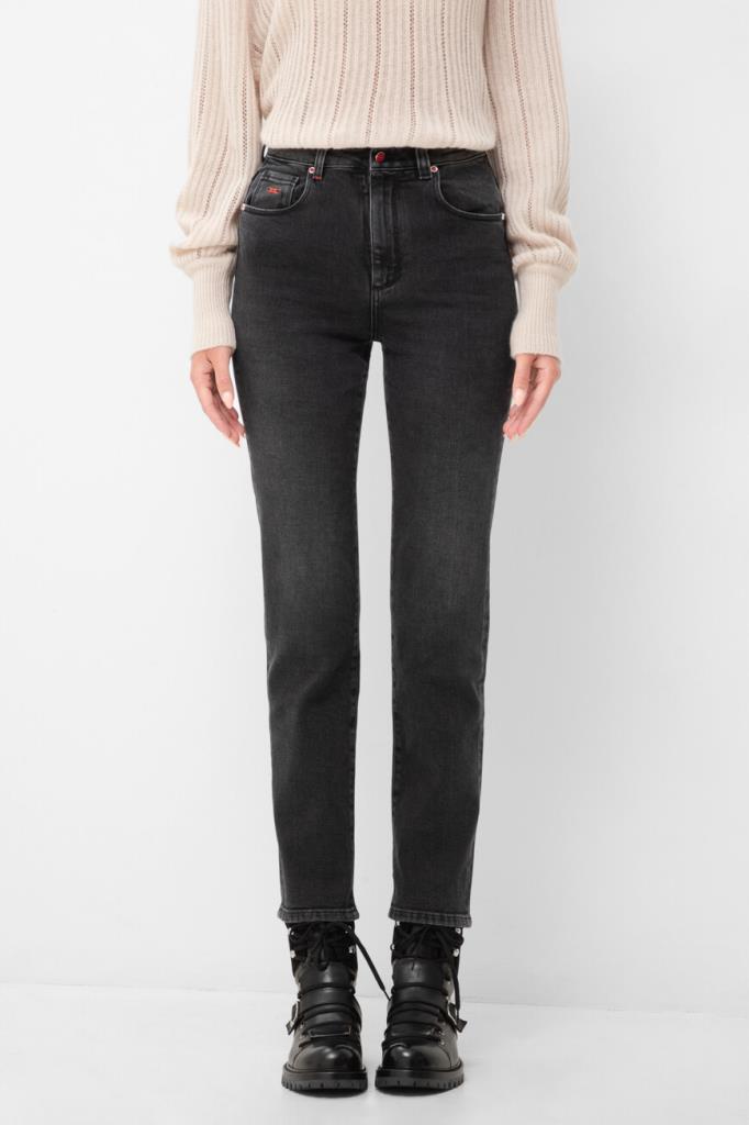 Чёрные джинсы Kiton с дизайнерскими потёртостями. Изделие высокой посадки изготовлено из плотного хлопкового денима стрейч с пятью карманами. Атрибутами Дома стали вышитые ярко-красные литеры «K» на маленьком кармане спереди и поясе сзади и во внутренней части.