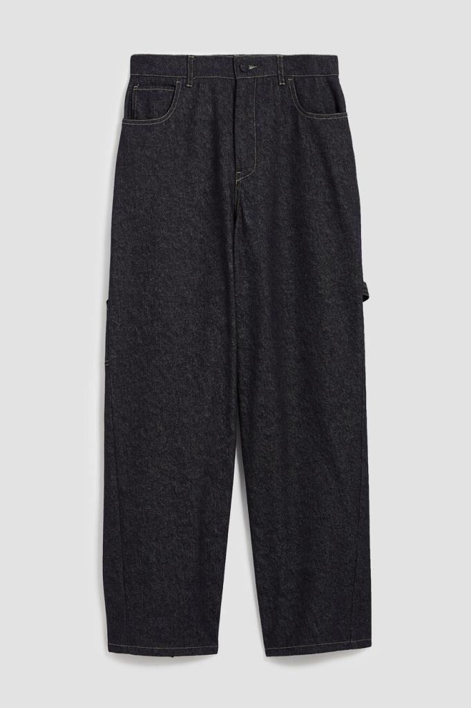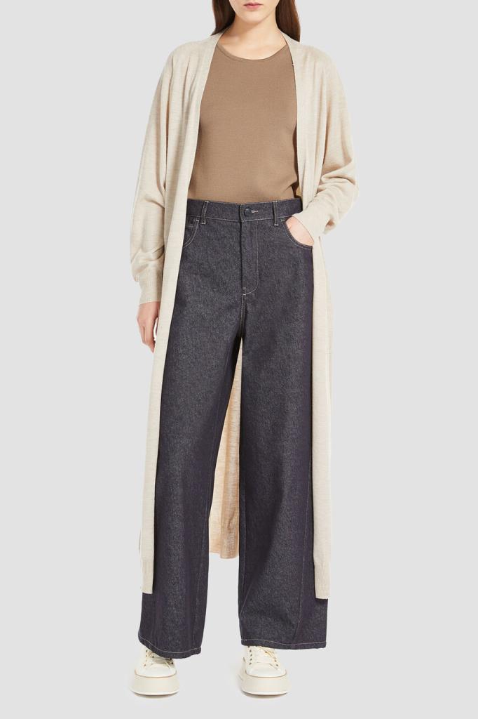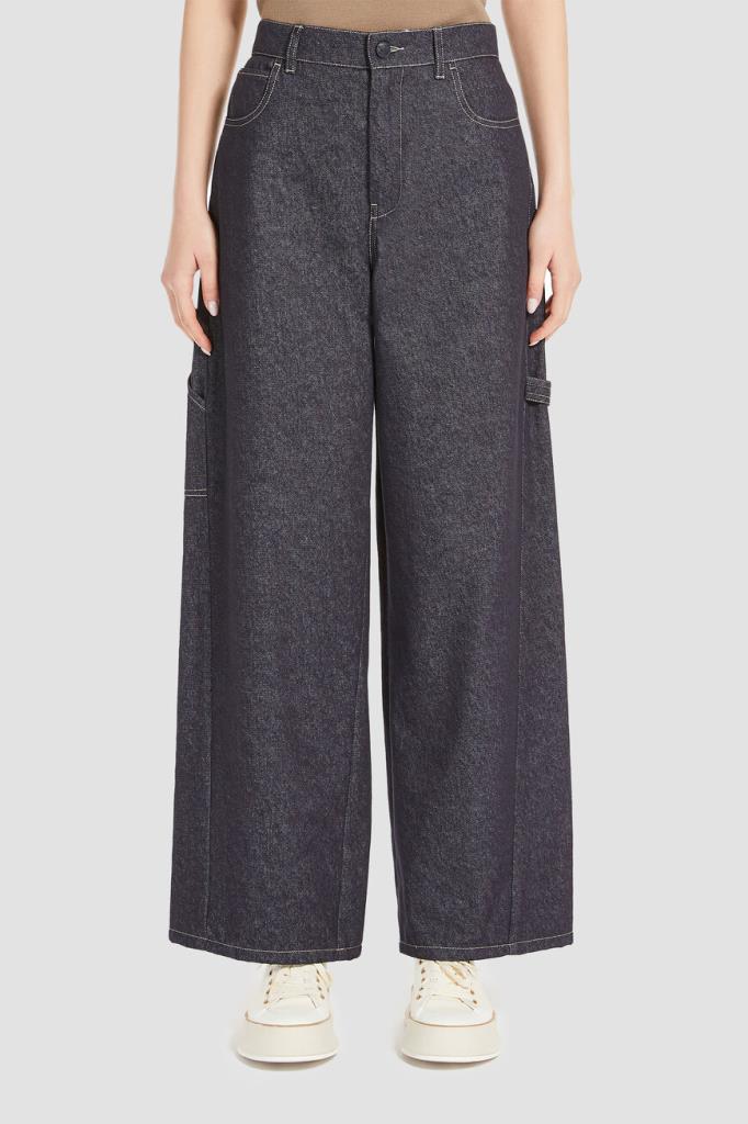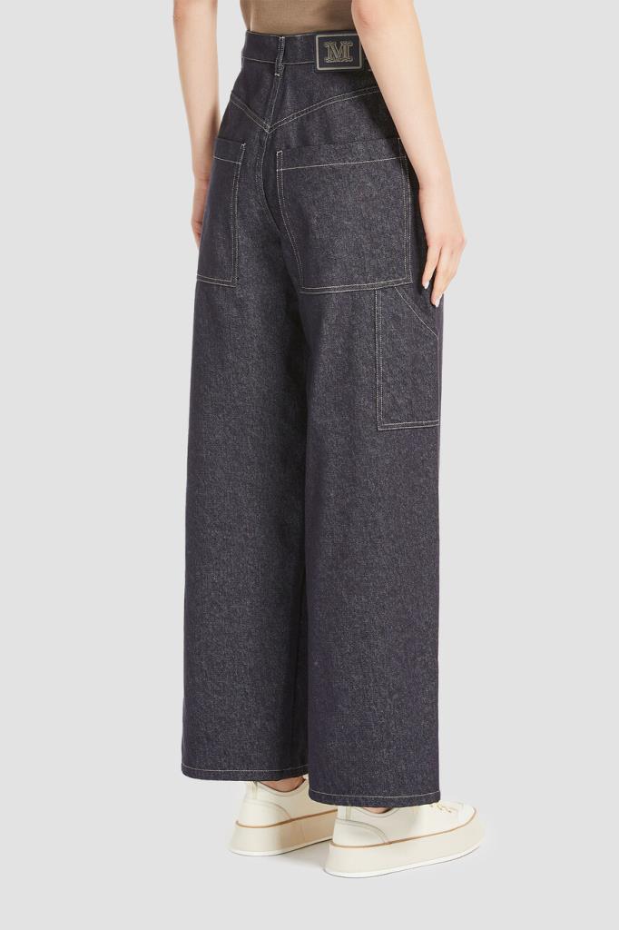 Брюки высокой посадки от Max Mara выполнены в оттенке индиго. Фасон изделия из мягкого хлопкового денима предполагает прямой широкий крой и шесть карманов: прорезные по бокам, дополнительный прорезной карман спереди справа, накладной карман сбоку слева и крупные накладные сзади. Отличительными деталями стали шов, идущий спереди и придающий брюкам объём, прострочка на швах и брендированная накладка с дизайнерской литерой «M» на поясе сзади.