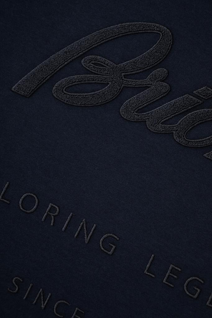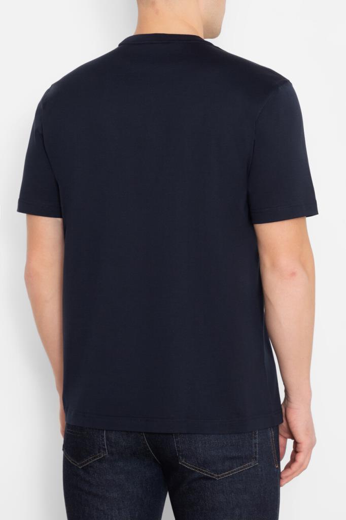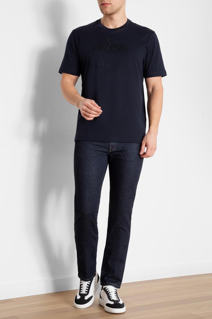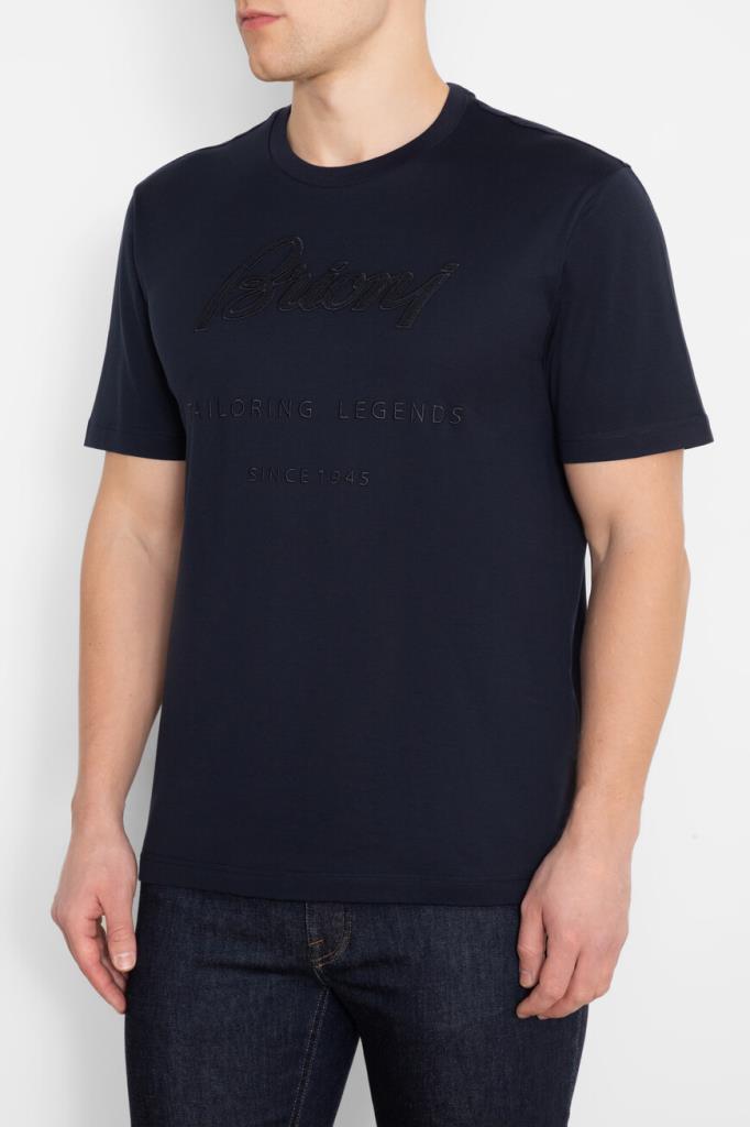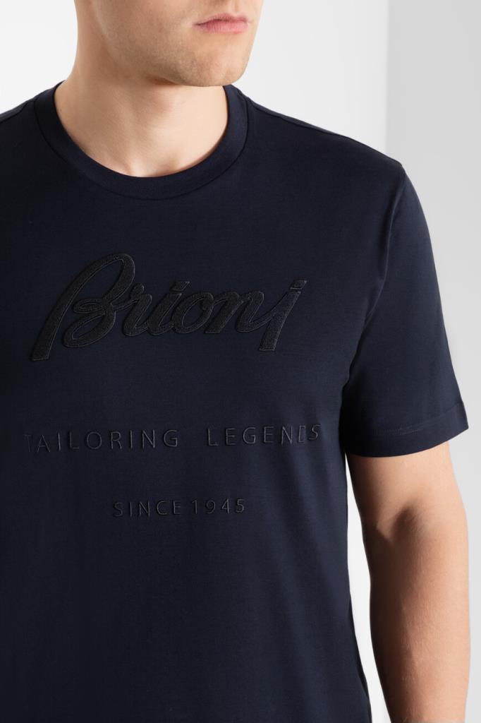 Прямая футболка Brioni с крупным ворсистым логотипом спереди. Для пошива повседневной модели используется мягкий хлопковый трикотаж тёмно-синего цвета. На принадлежность изделия бренду указывают вышитые рельефные надпись «Tailoring legends» заглавными буквами и год основания Дома. Футболку можно носить в комплекте с тёмно-синими джинсами с оранжевой прострочкой на швах из той же коллекции.
