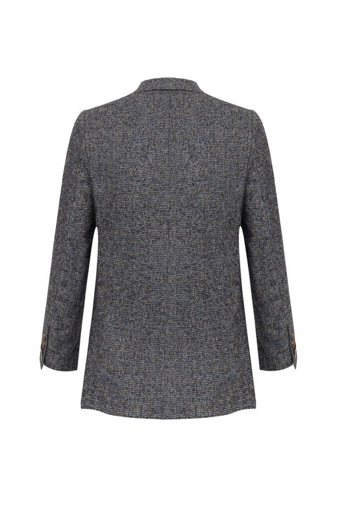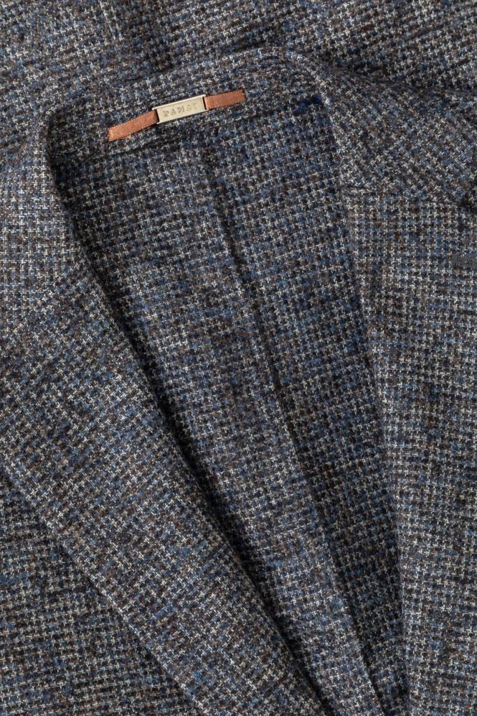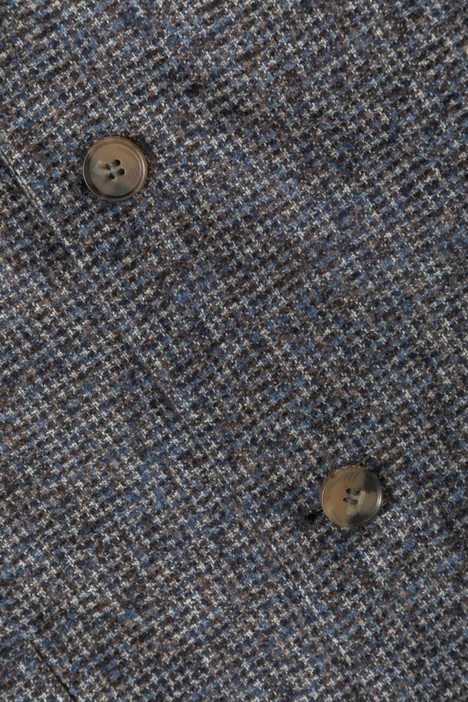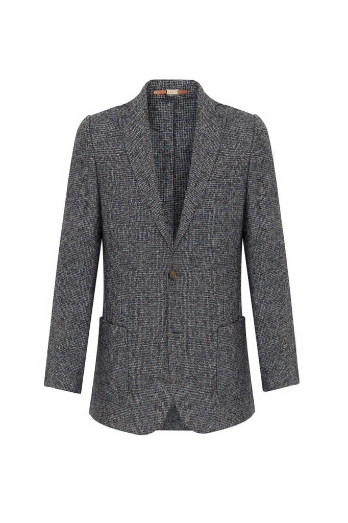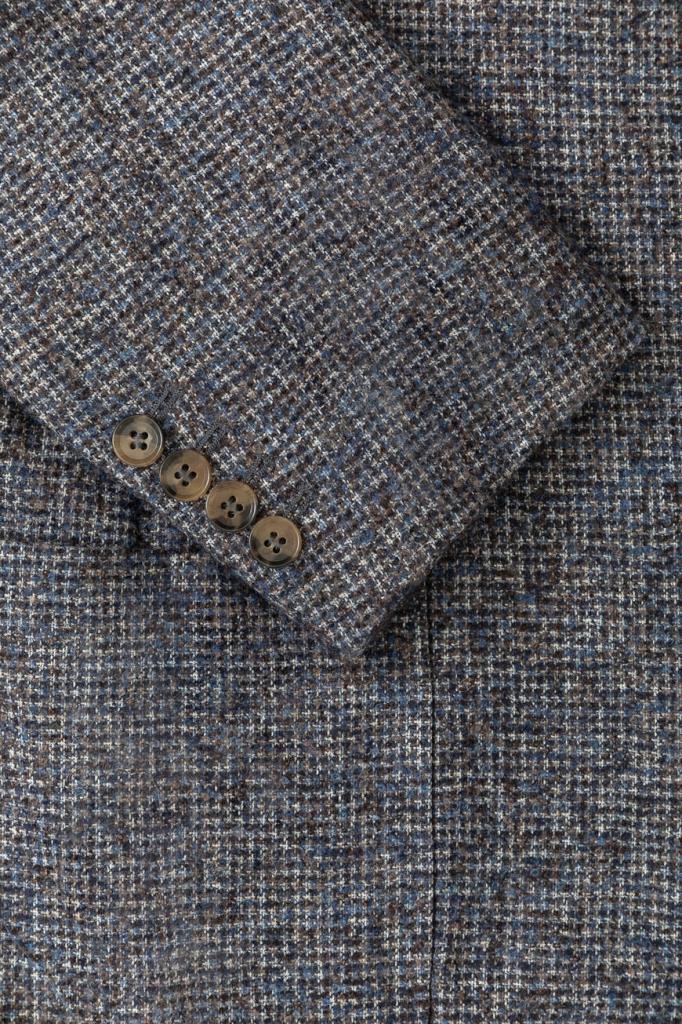 Роскошный однобортный пиджак от бренда DAMAT. Оригинальная модель выполнена из мягкого трикотажа на основе натуральной шерсти, пряжи альпаки и прочного фирменного нейлона. Декор: фактурный геометрический узор в изысканной бело-сине-коричневой гамме, создающий эффект меланжа, по всей поверхности.