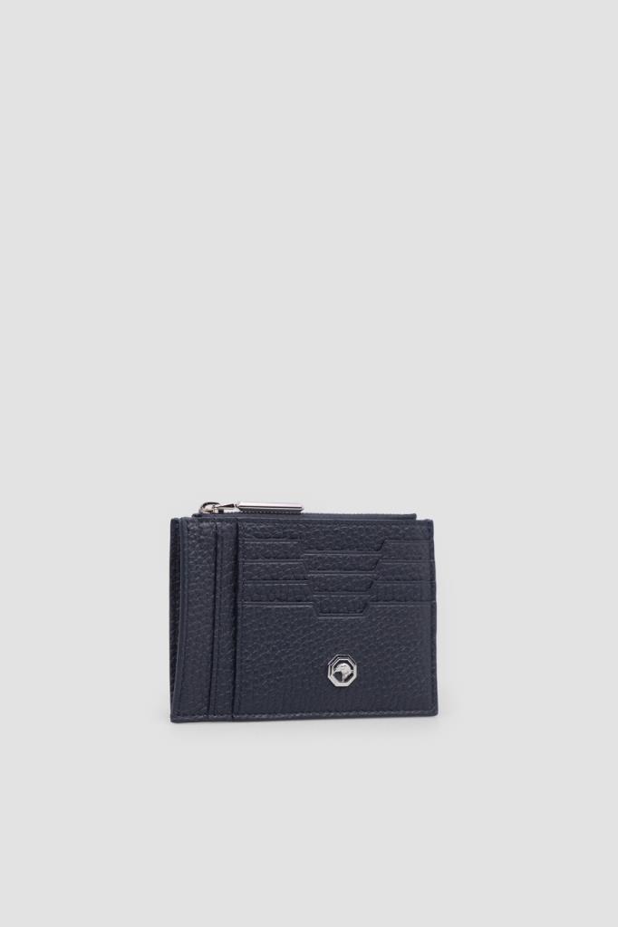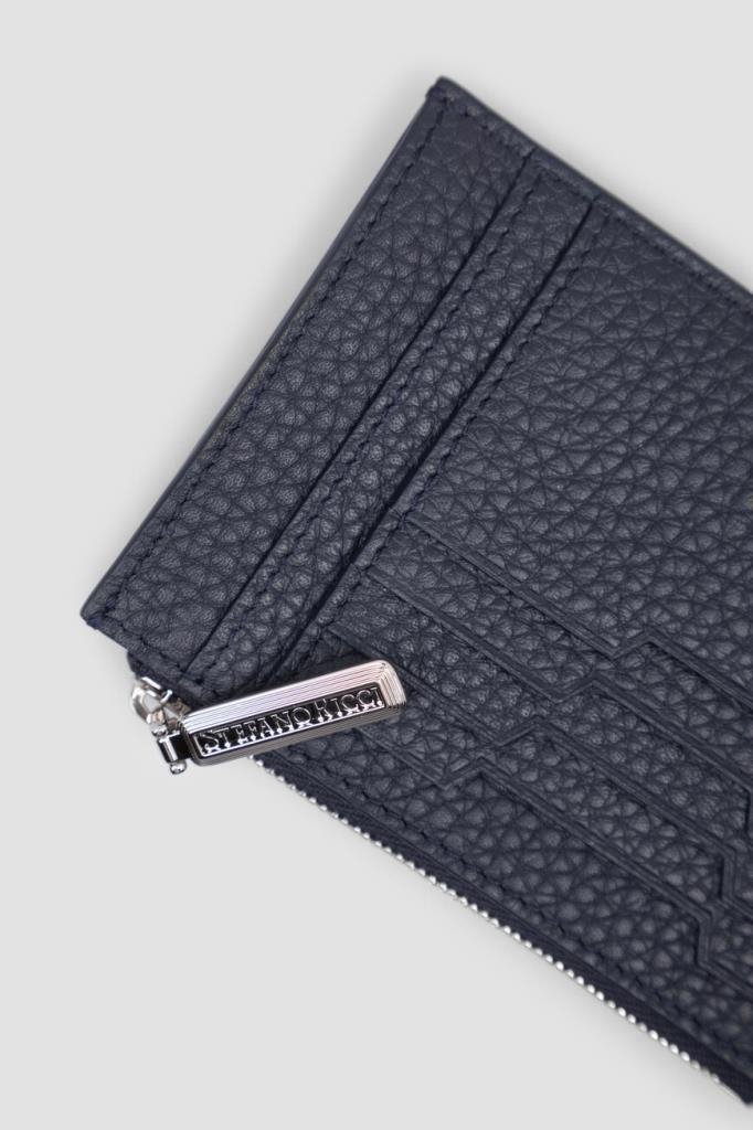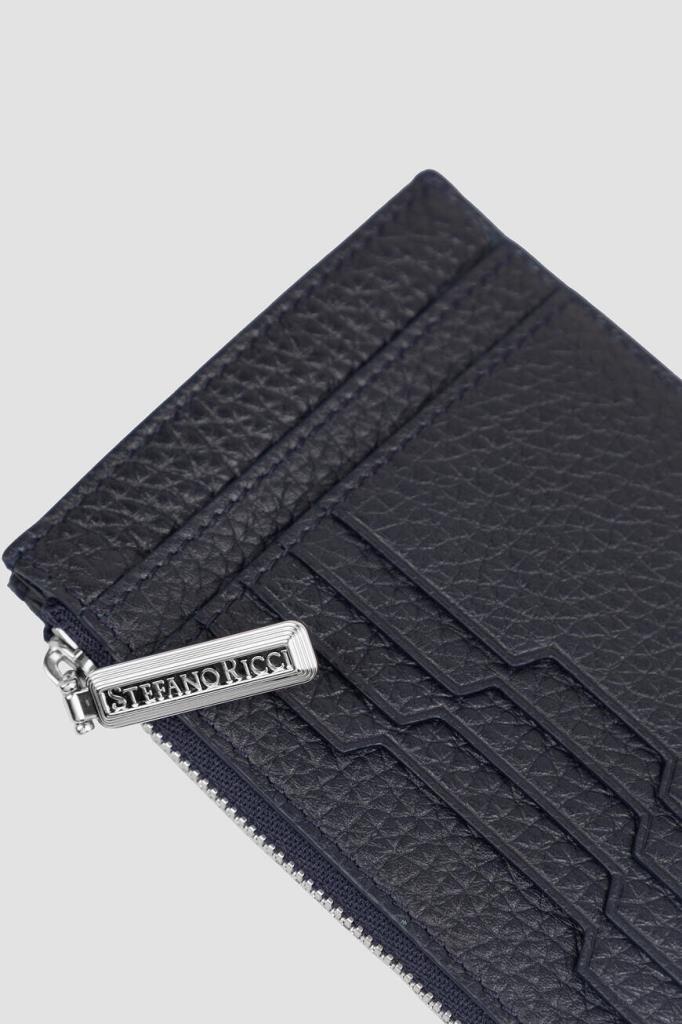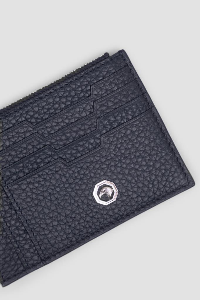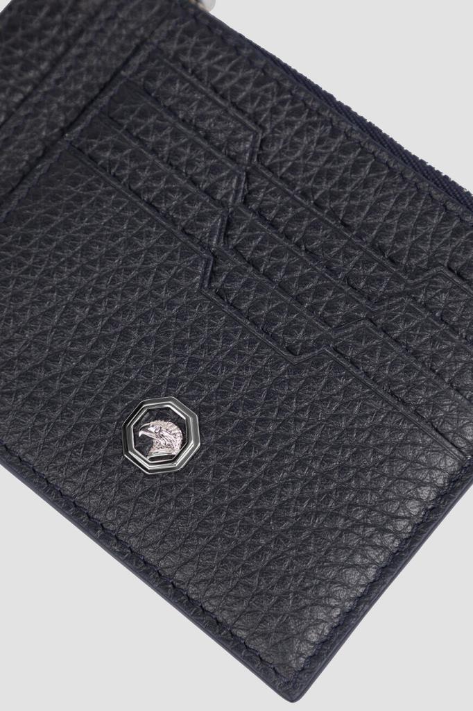 Практичный кардхолдер тёмно-синего цвета от Stefano Ricci. Кожаный аксессуар с крупнозернистой текстурой украшен знаковой символикой Дома - головой орла в восьмиграннике, выполненной из серебристого металла и размещённой на лицевой стенке. Изделие оснащено восьмью слотами для пластиковых карт, четырьмя плоскими боковыми карманами и разделительным карманом на молнии сверху.