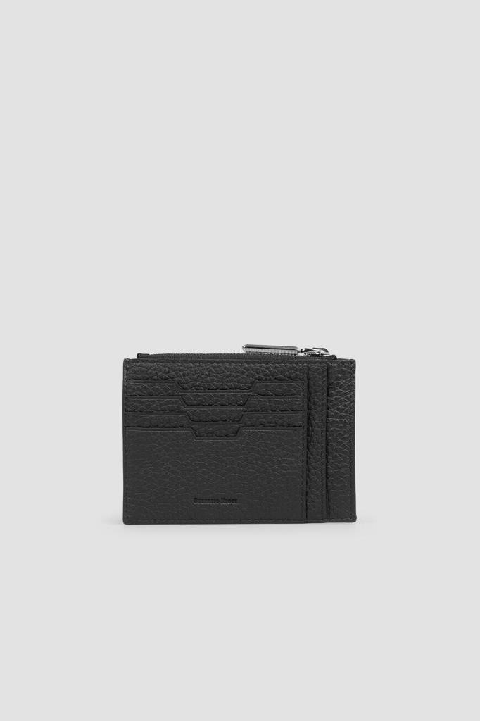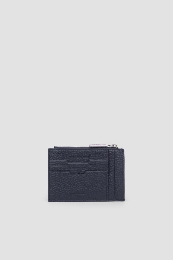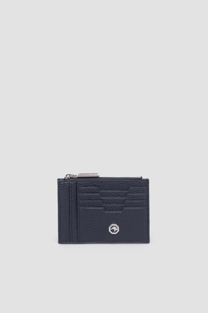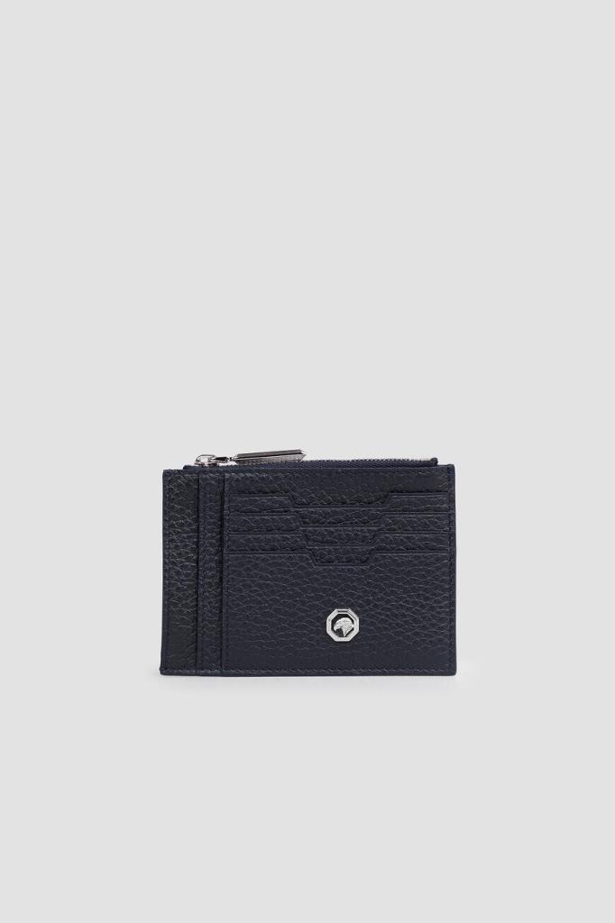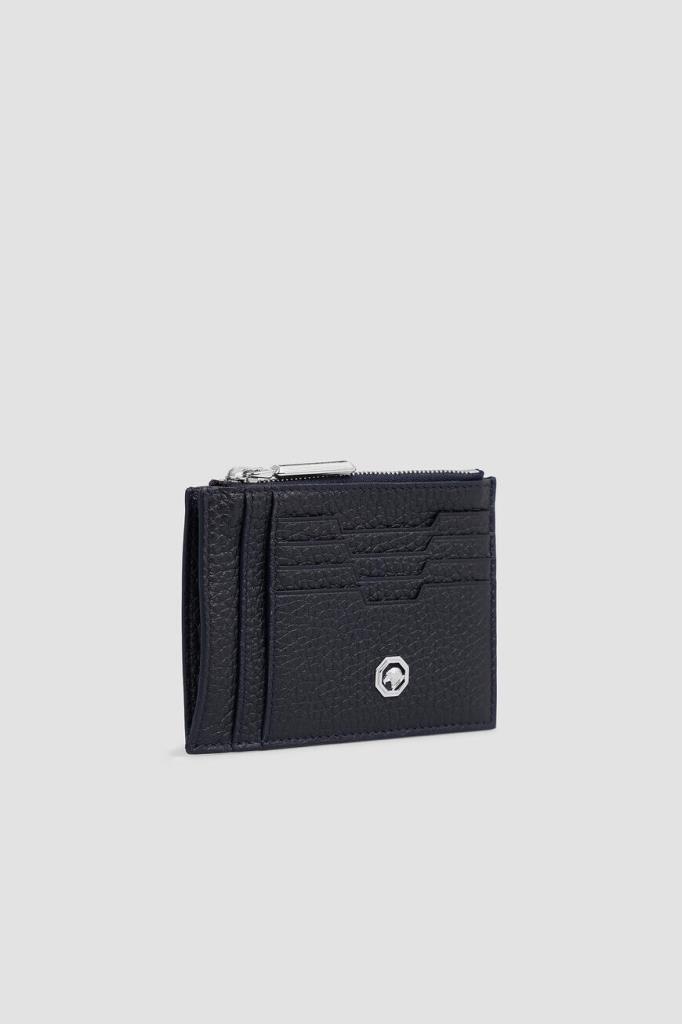 Практичный кардхолдер тёмно-синего цвета от Stefano Ricci. Кожаный аксессуар с крупнозернистой текстурой украшен знаковой символикой Дома - головой орла в восьмиграннике, выполненной из серебристого металла и размещённой на лицевой стенке. Изделие оснащено восьмью слотами для пластиковых карт, четырьмя плоскими боковыми карманами и разделительным карманом на молнии сверху.