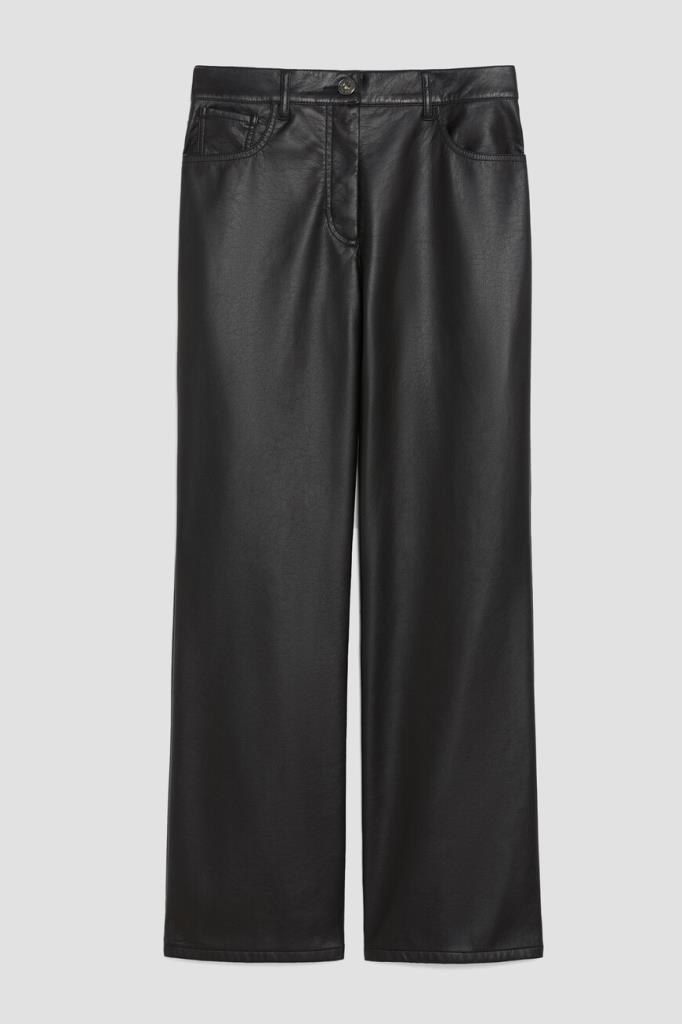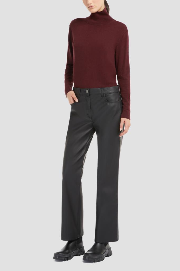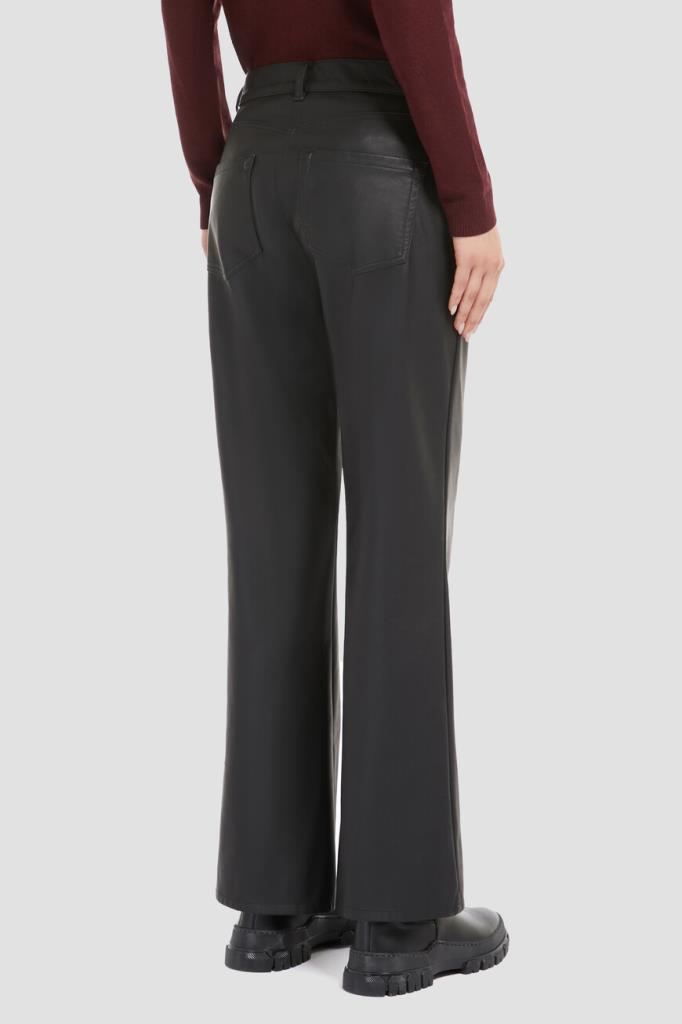 Брюки чёрного цвета от Max Mara. Модель изготовлена из плотного полиэфира, окрашенного в готовом виде, и дополнена полиуретановым покрытием с деликатным блеском. Изделие оснащено пятью карманами и застёжкой на потайную молнию и серебристую металлическую пуговицу с планкой. Брюки отличаются культовыми деталями в стиле деним: карманом для монет, кокеткой сзади и плотным поясом со шлевками под ремень.