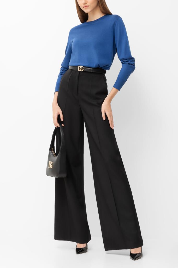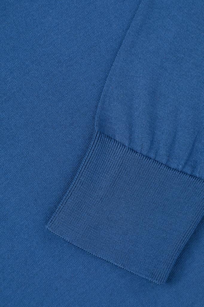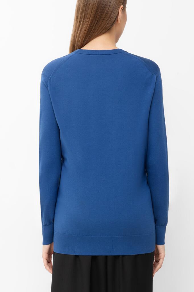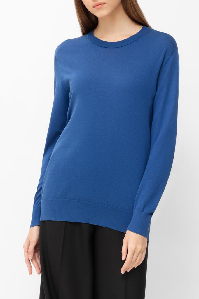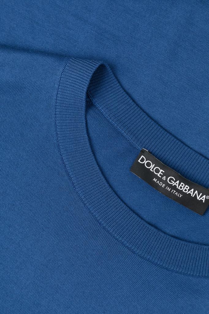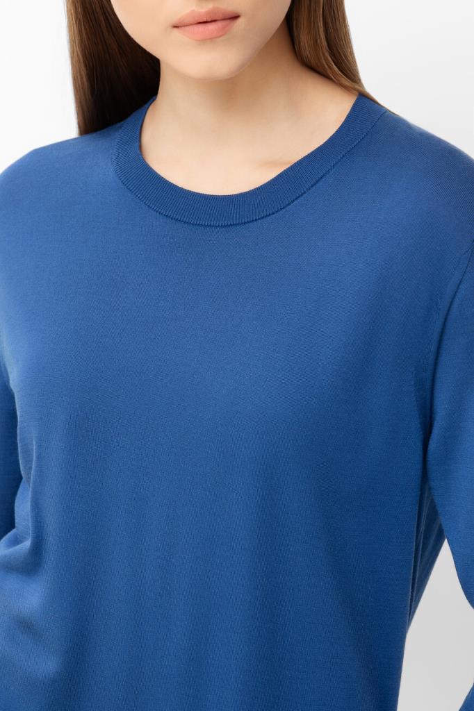 Женский пуловер Dolce & Gabbana из мягкого гладкого шёлкового трикотажа синего цвета. Длинная комфортного прямого кроя, с круглым вырезом горловины и длинными рукавами. Горловина и манжеты с фактурой в рубчик.